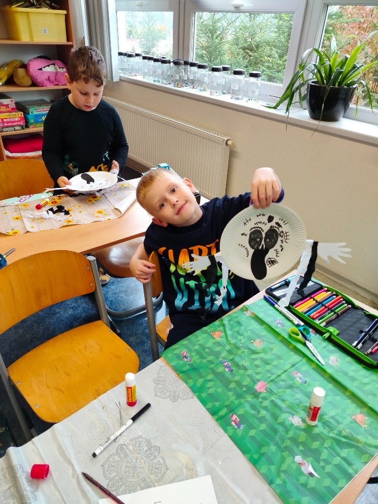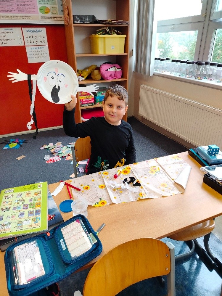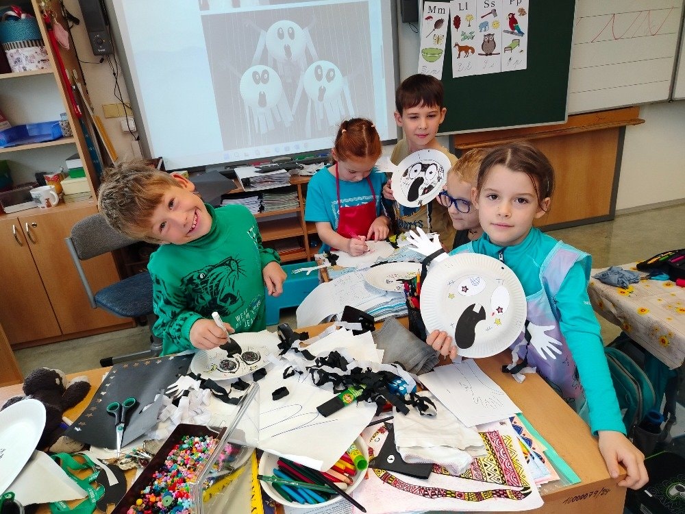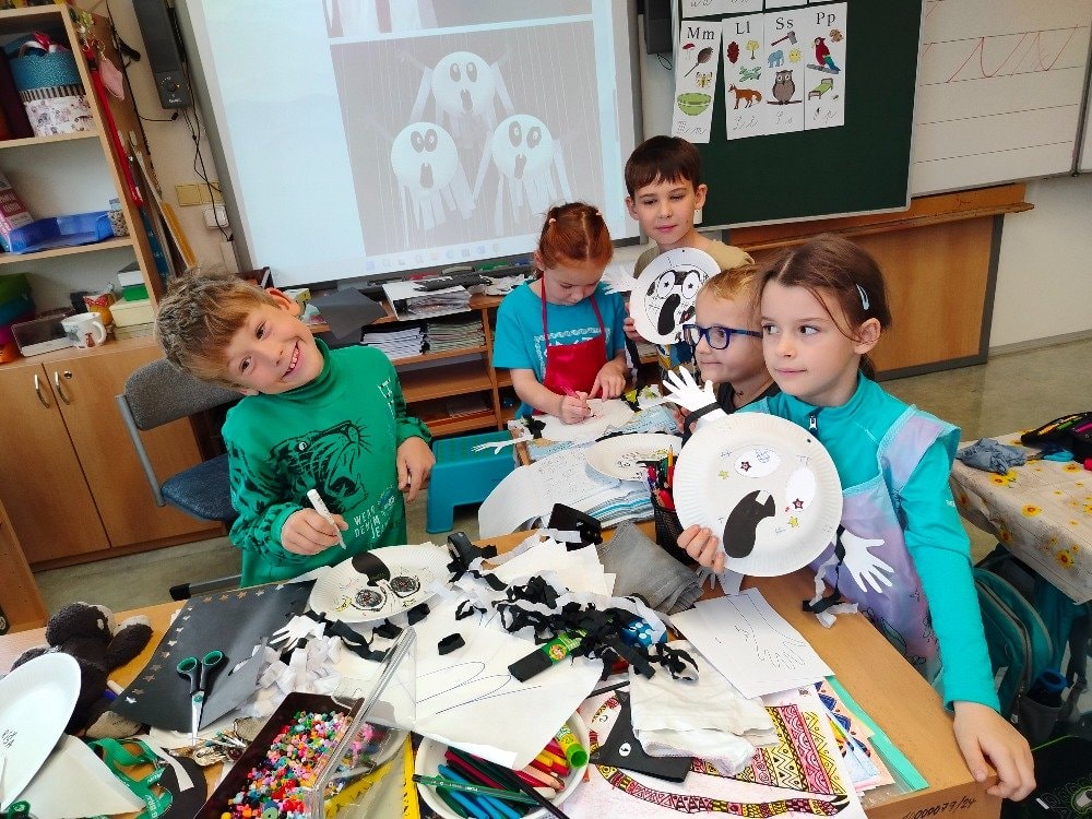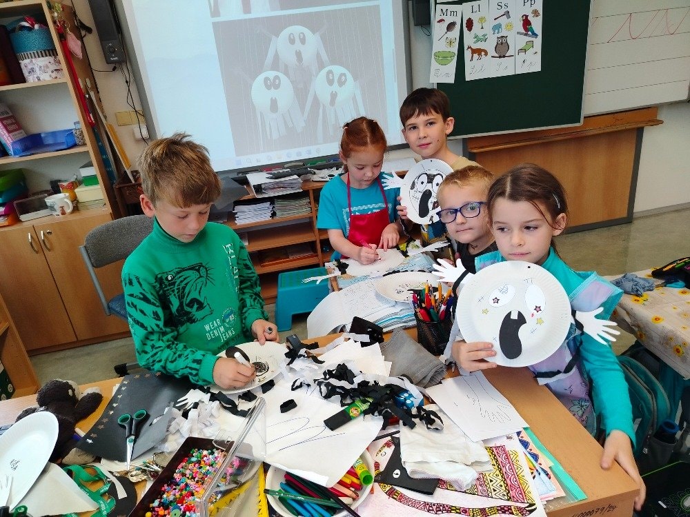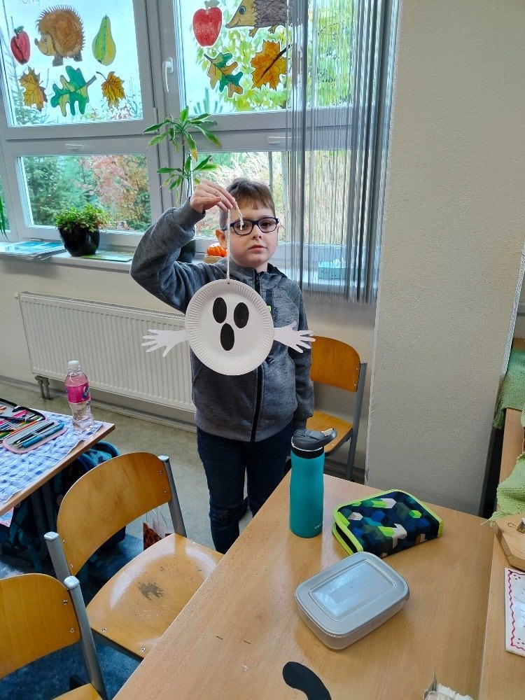 Naše "Halloweenová kolekce" se rozrostla o další strašidelný kousek v podobě papírového ducha. Na výrobu nám stačil papírový tácek, krepový papír a kousek tvrdého papíru. Z něj jsme vystřihli ruce, oči a pusinku, všechno jsme přilepili, dozdobili fixou – a duch byl na světě! Teď už jen doufáme, že nám naši duchové v noci nezačnou poletovat po škole.