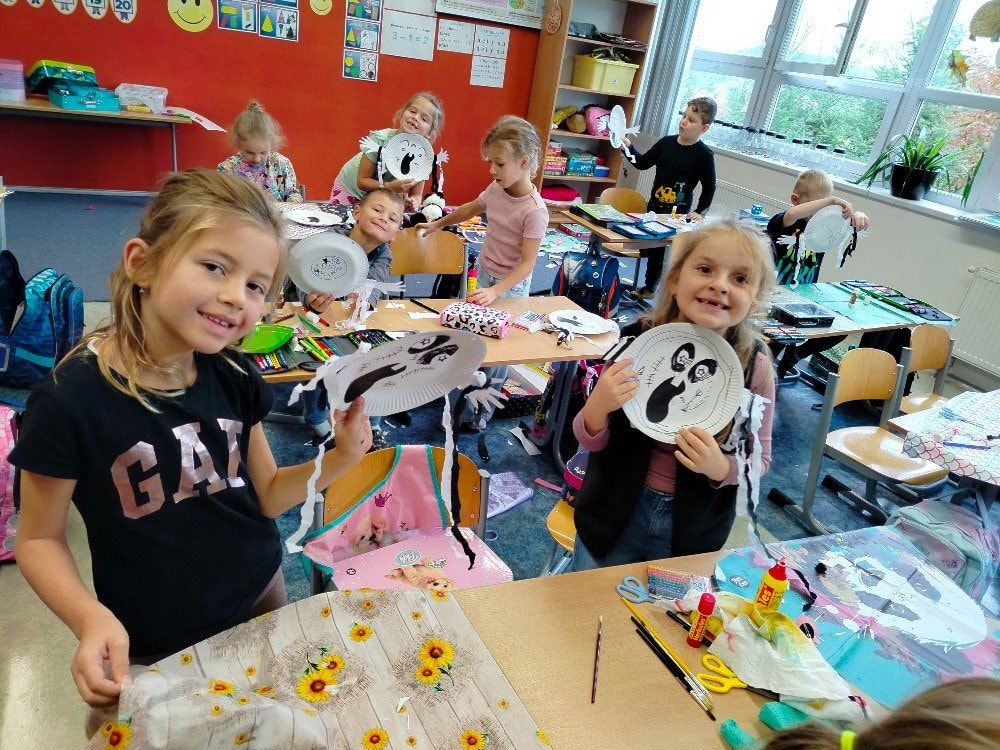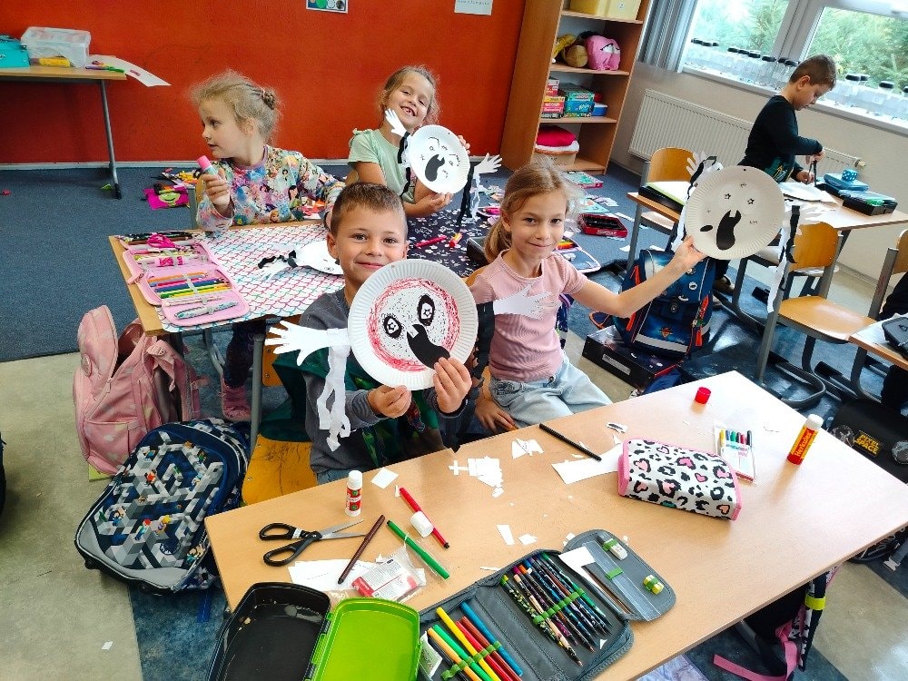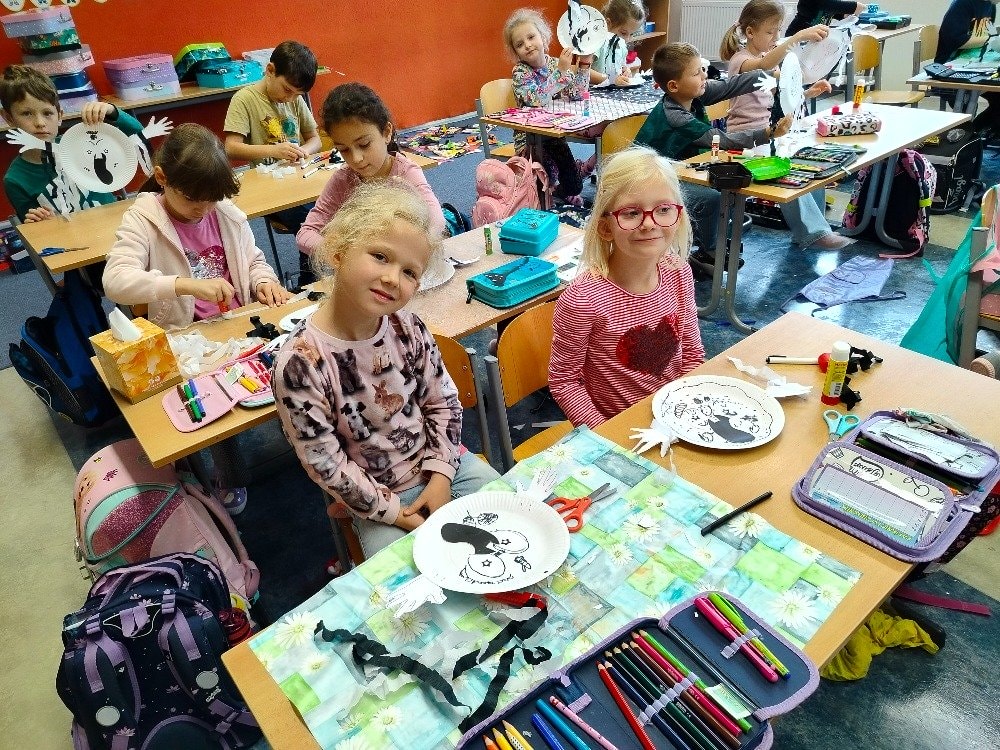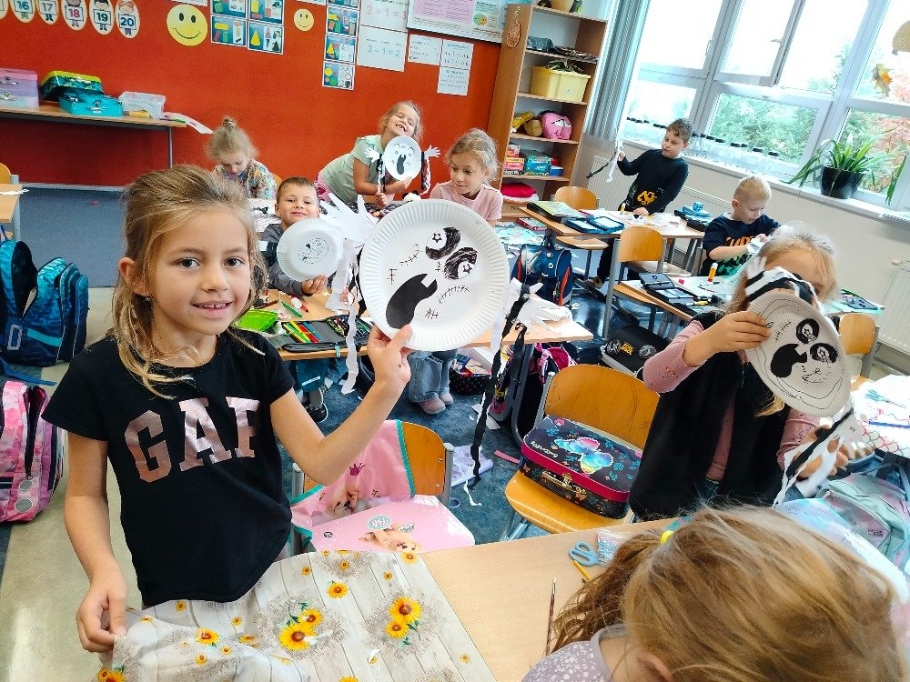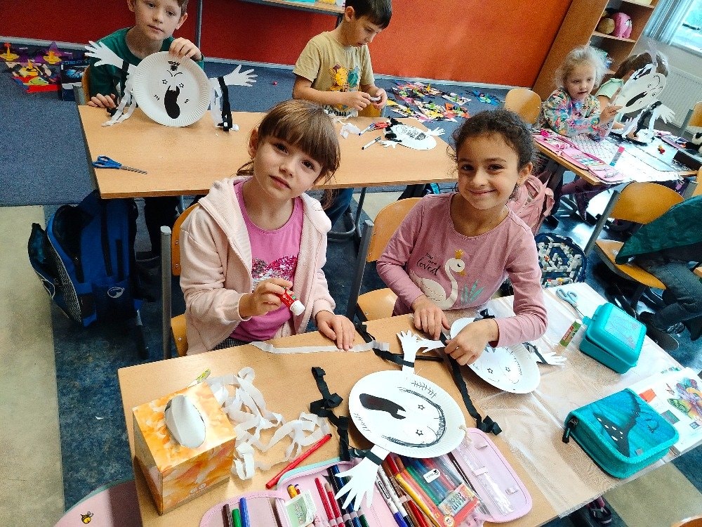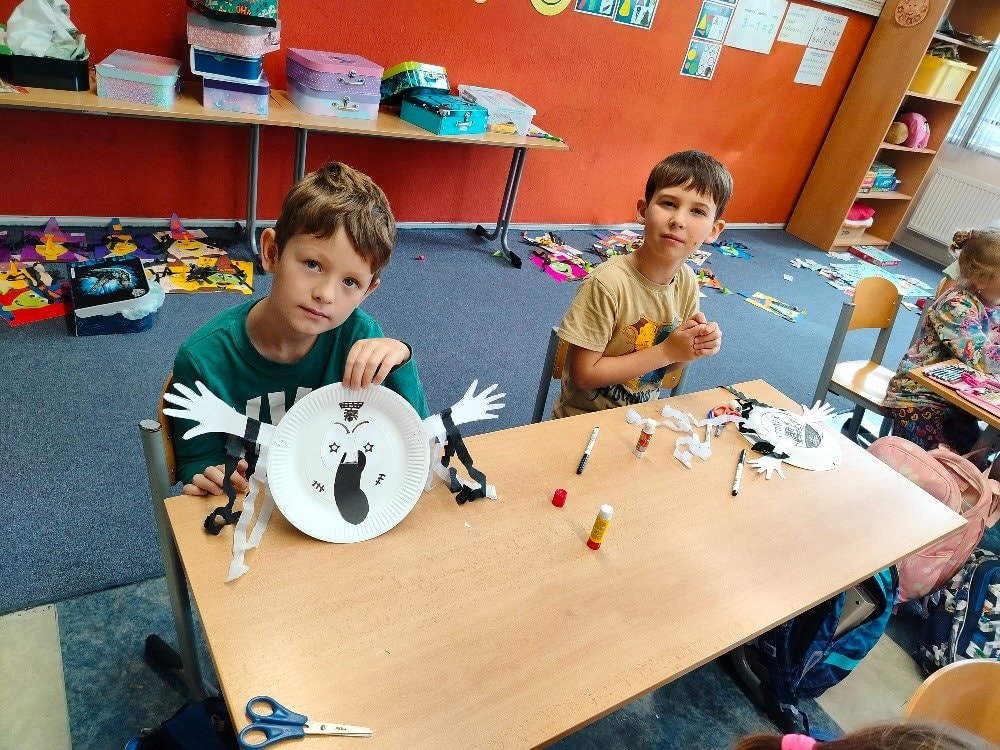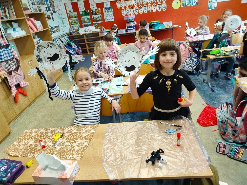 Naše "Halloweenová kolekce" se rozrostla o další strašidelný kousek v podobě papírového ducha. Na výrobu nám stačil papírový tácek, krepový papír a kousek tvrdého papíru. Z něj jsme vystřihli ruce, oči a pusinku, všechno jsme přilepili, dozdobili fixou – a duch byl na světě! Teď už jen doufáme, že nám naši duchové v noci nezačnou poletovat po škole.