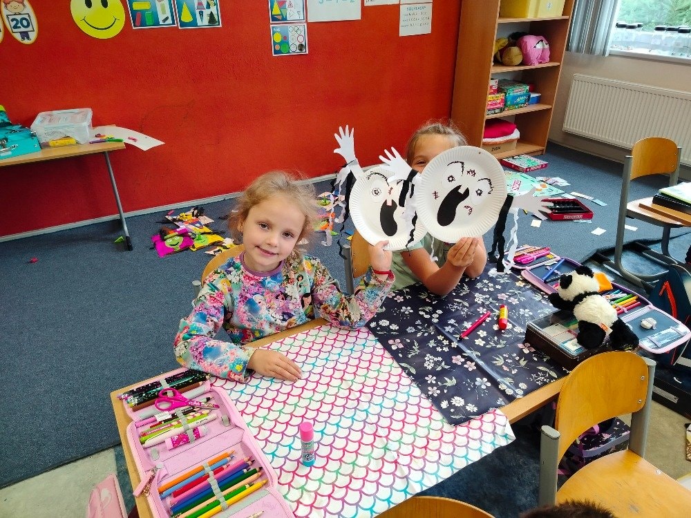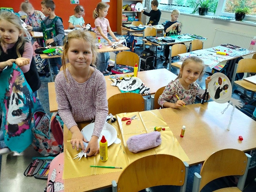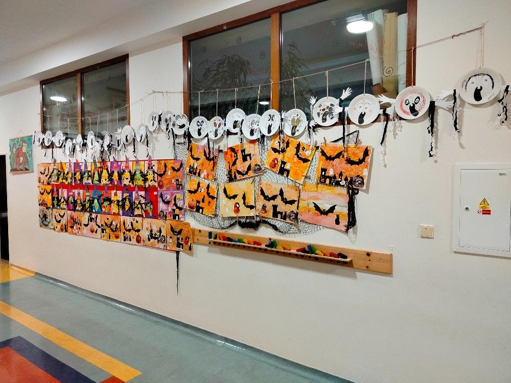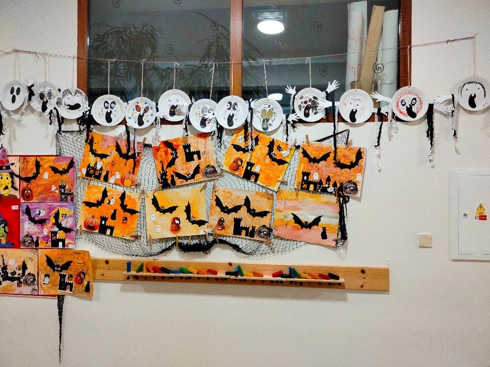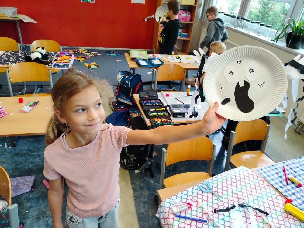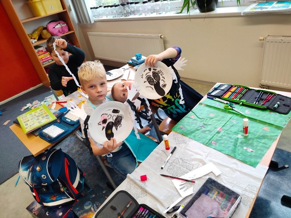Naše "Halloweenová kolekce" se rozrostla o další strašidelný kousek v podobě papírového ducha. Na výrobu nám stačil papírový tácek, krepový papír a kousek tvrdého papíru. Z něj jsme vystřihli ruce, oči a pusinku, všechno jsme přilepili, dozdobili fixou – a duch byl na světě! Teď už jen doufáme, že nám naši duchové v noci nezačnou poletovat po škole.