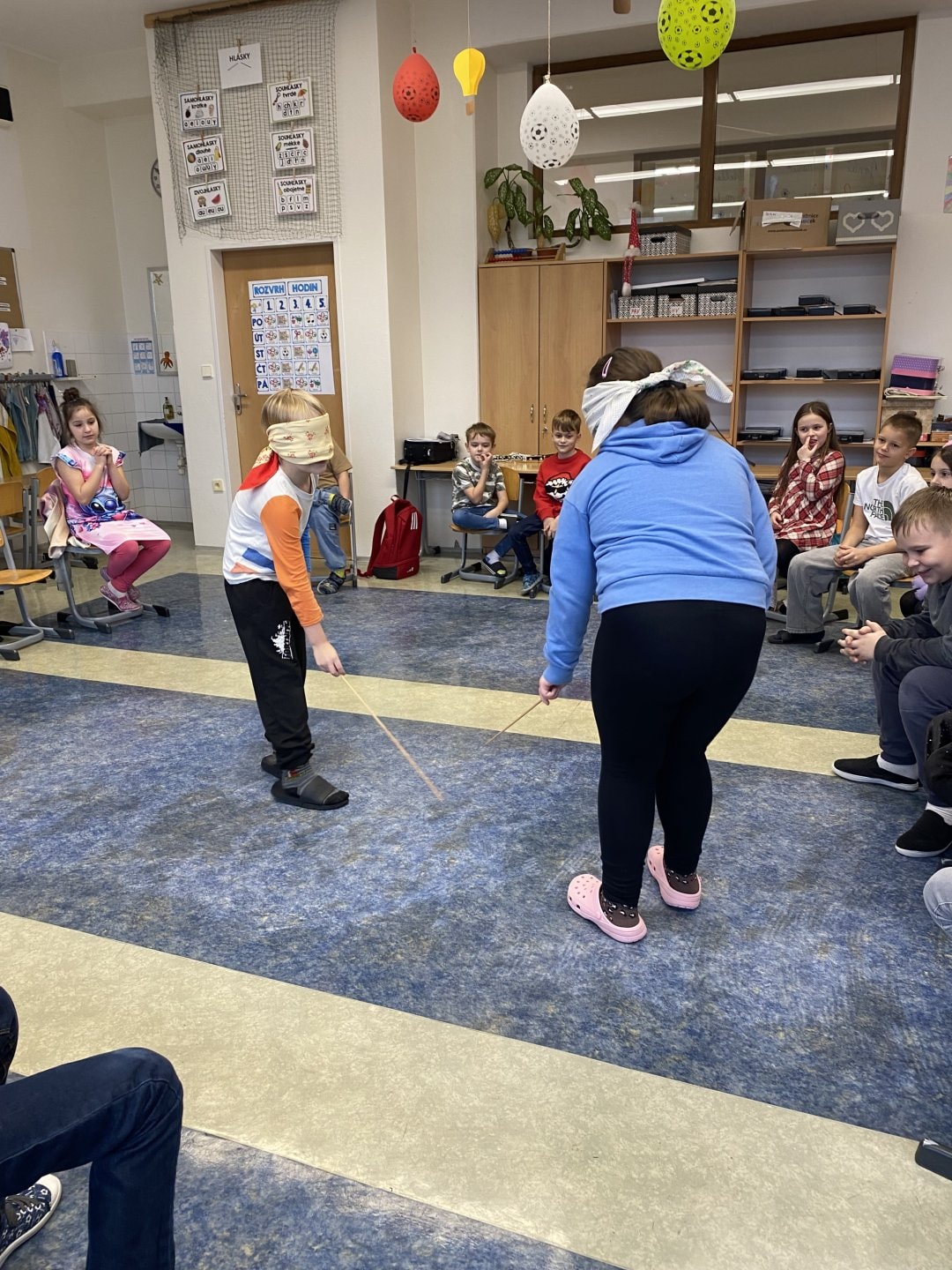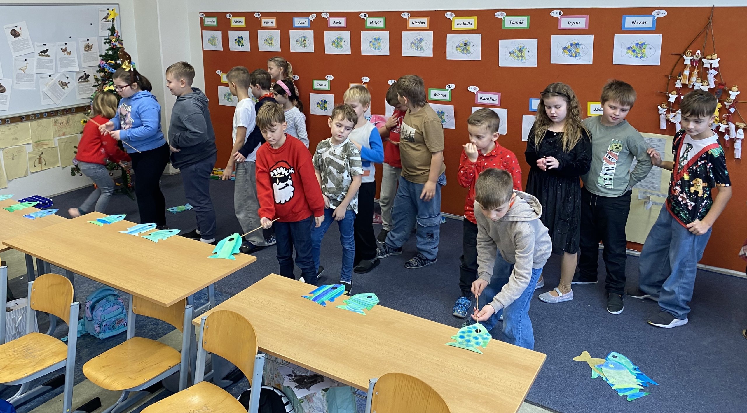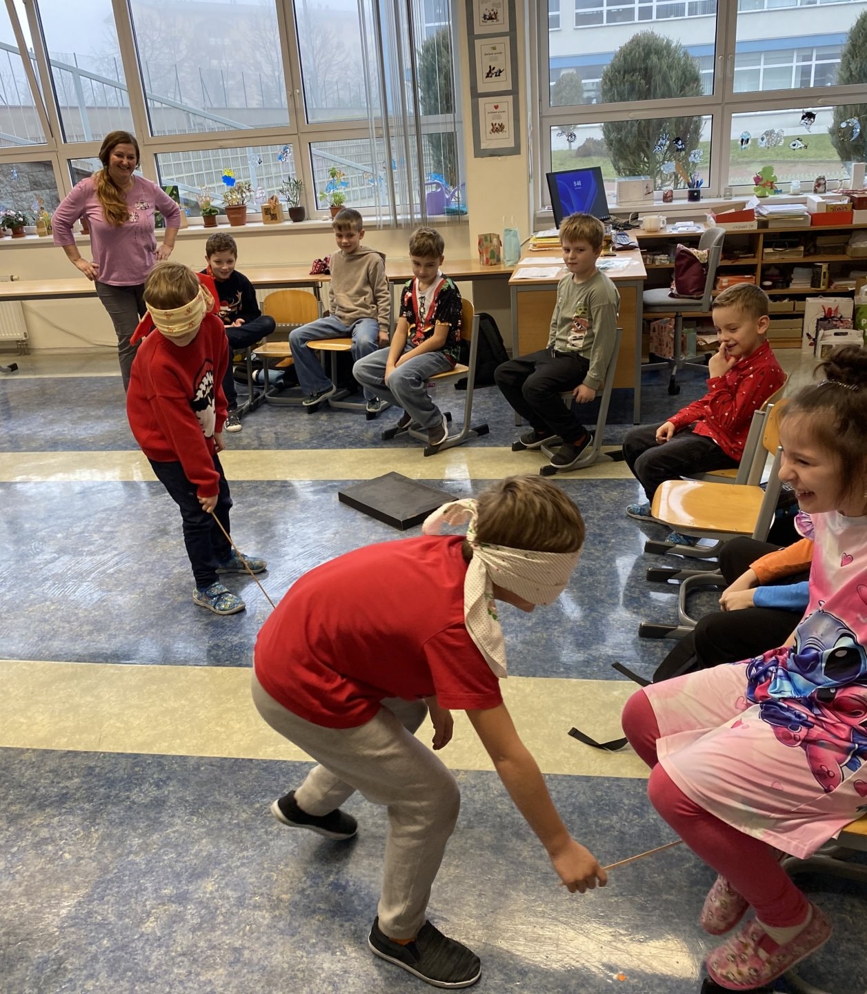 Druhou část vyplnily hry. Nemohlo chybět oblíbené slovní pexeso, nově jsme si zahráli rozbíjení ledu na louži poslepu a lovení rybek. Před obědem jsme šli popřát krásné vánoční svátky na sekretariát. Zazpívali jsme koledu Štědrej večer nastal se sólem Jáchyma na klarinet. Po obědě ještě zbyla chvilka na poslech České mše vánoční J. J. Ryby s animovaným filmem. A pak hurá domů!