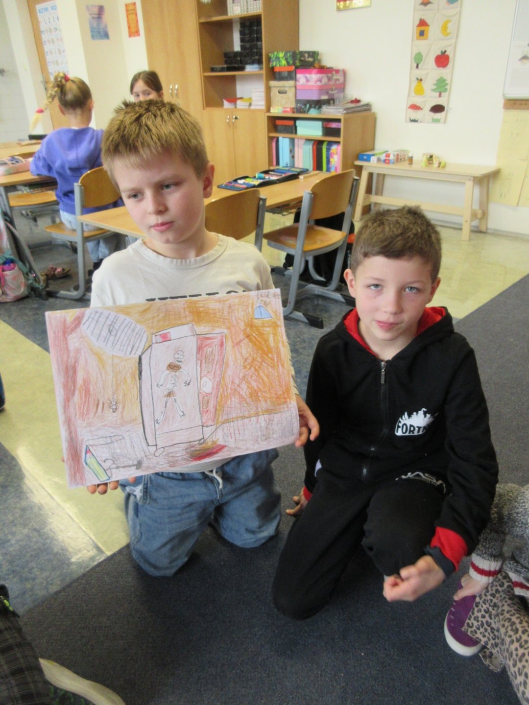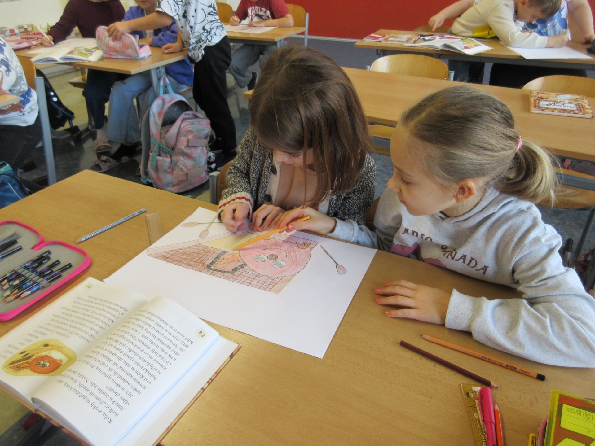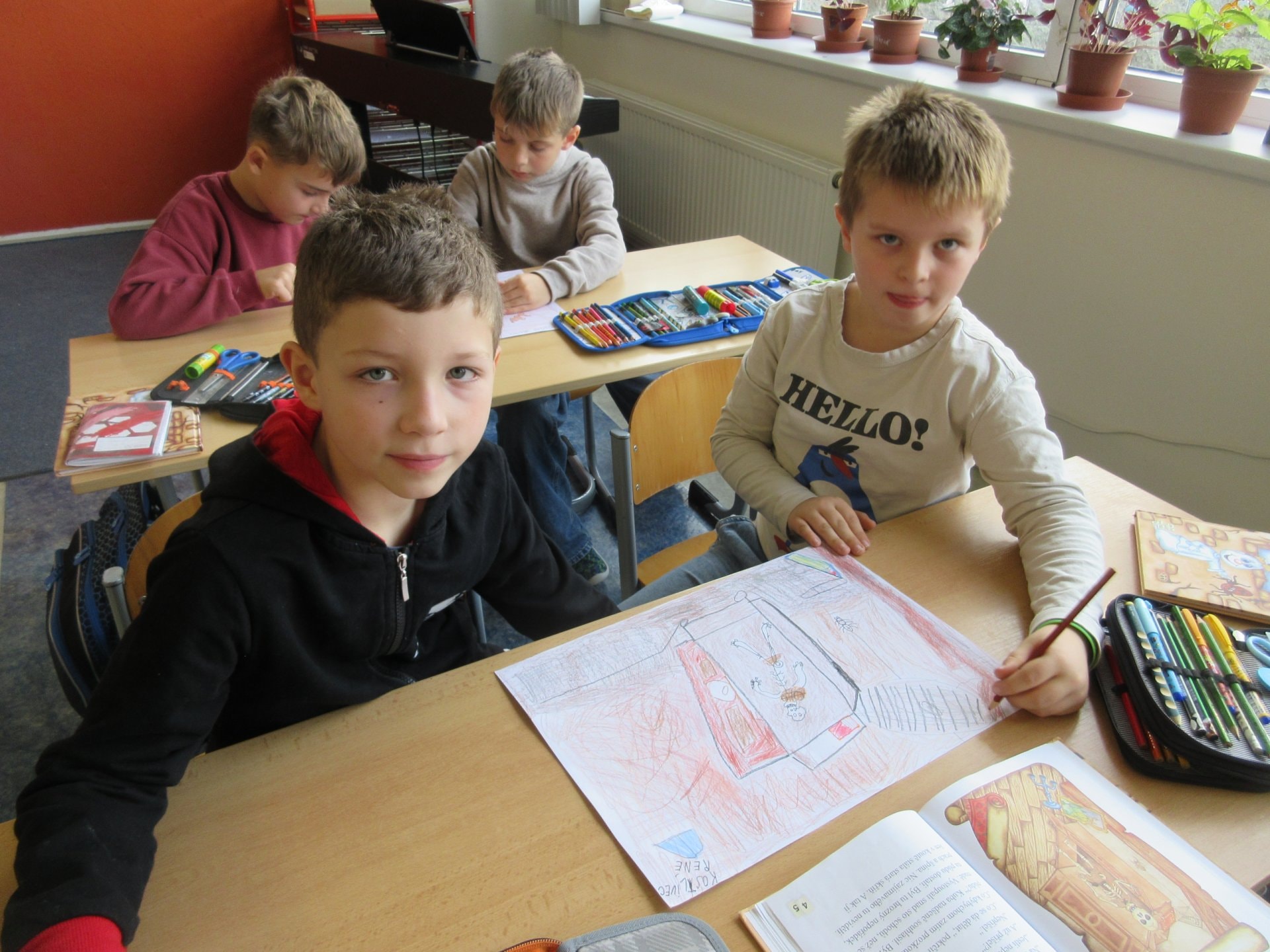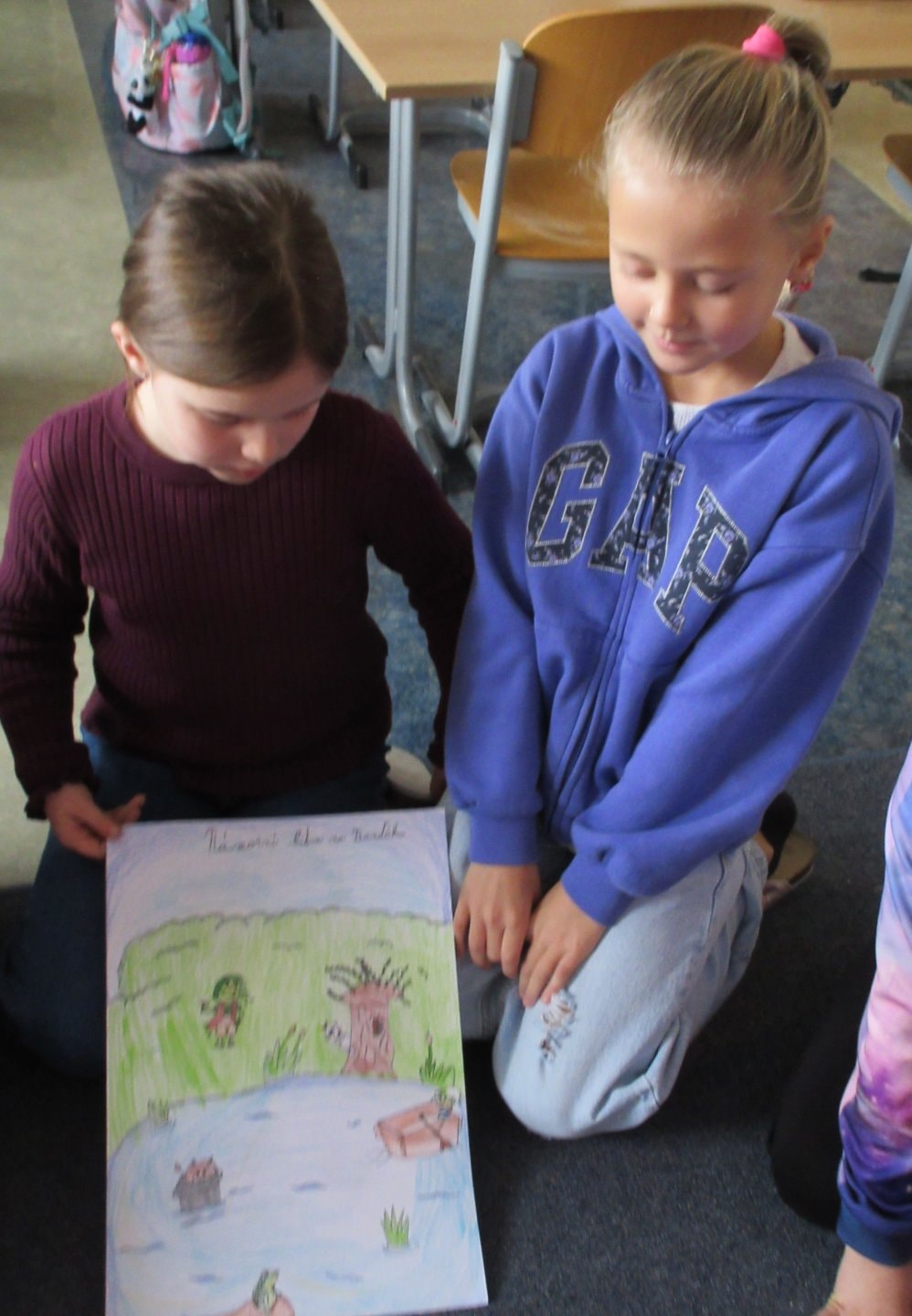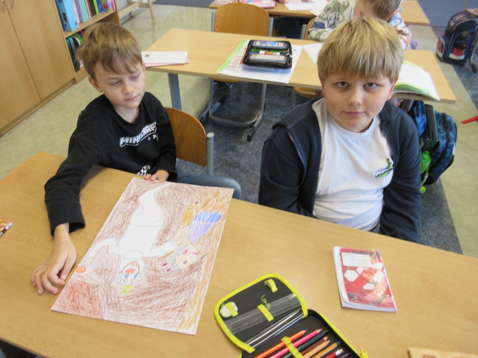 Ve čtenářské dílně jsme si po přečtení celé knihy povyprávěli o tom, co se nám líbilo, jaké poučení jsme si z četby vzali a pak ve dvojicích děti nakreslily obrázek k příběhu, který je nejvíce zaujal. Závěrem každý sám vyplnil zprávu o knize a zapsal úryvek, který jej nejvíce oslovil.
