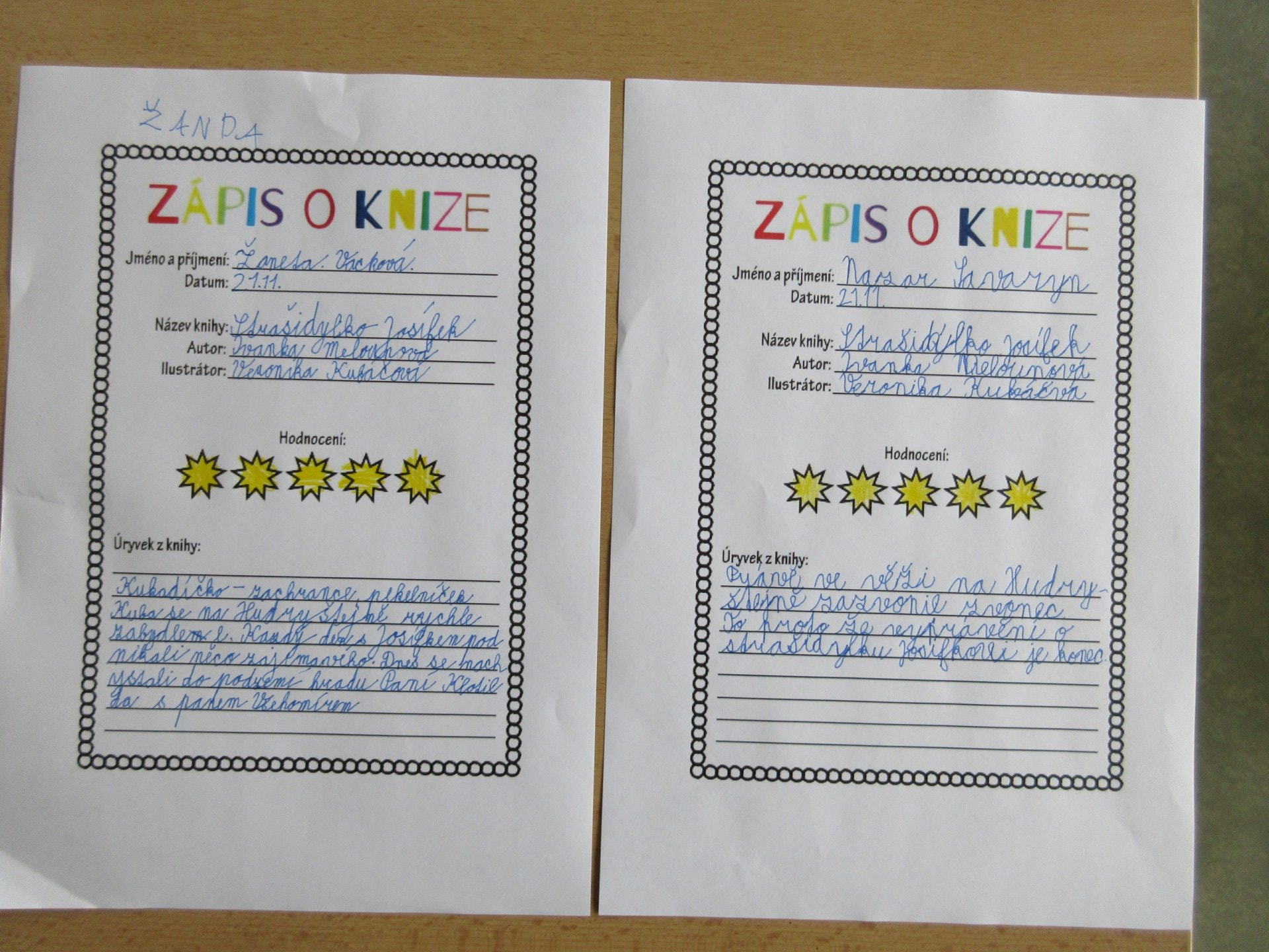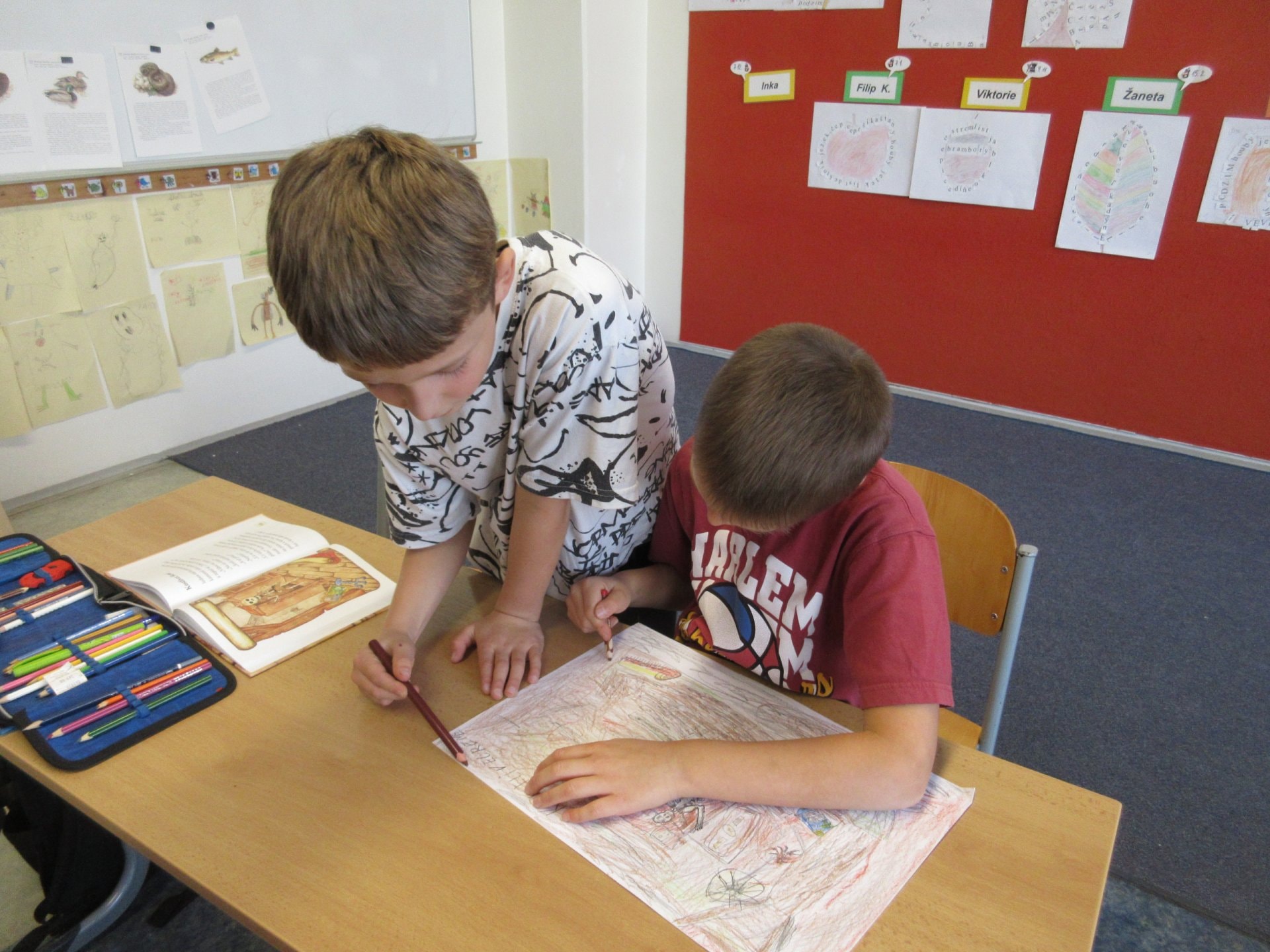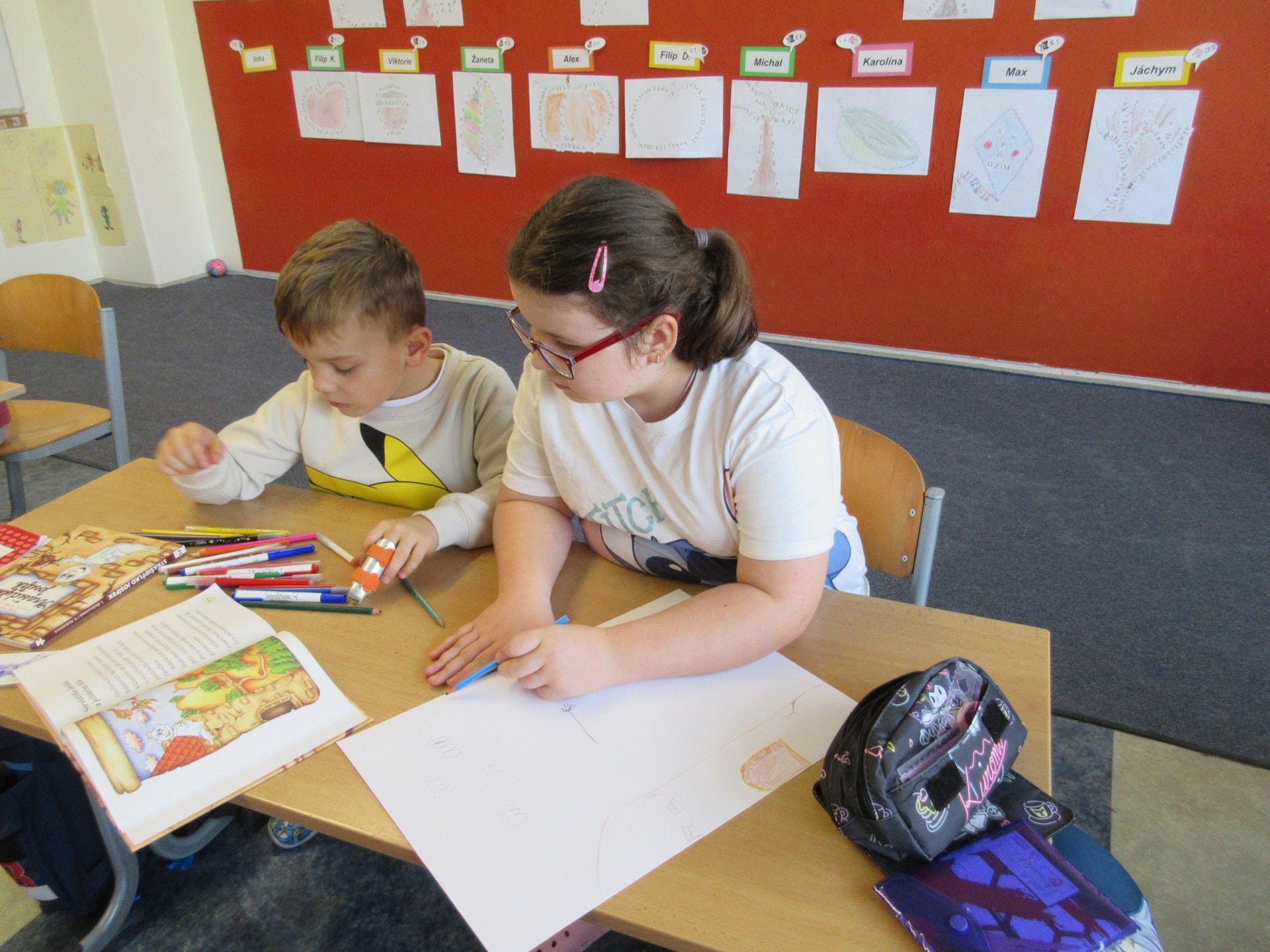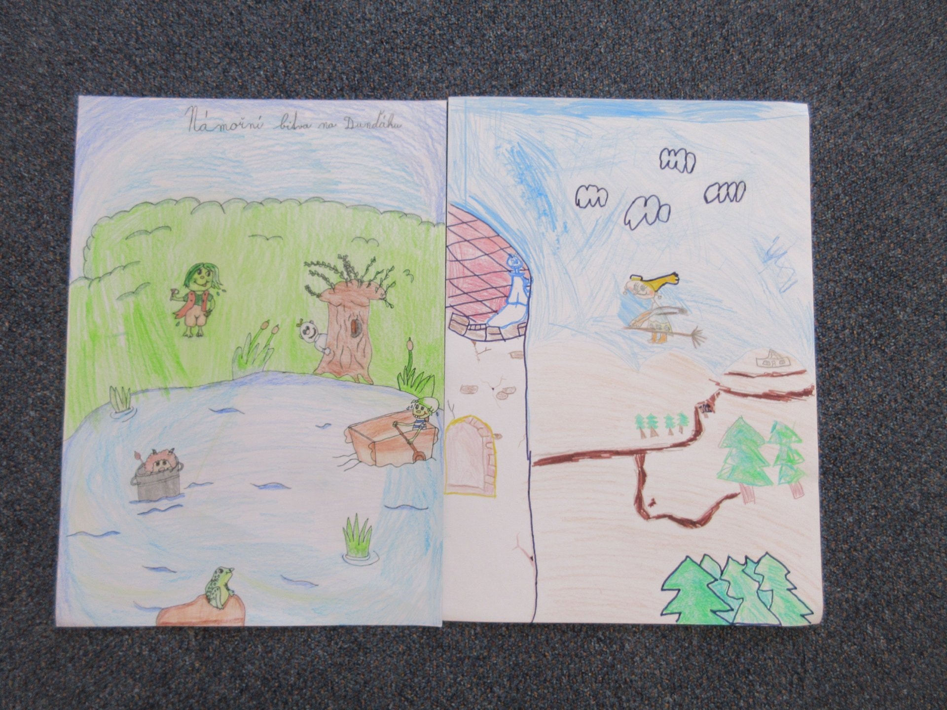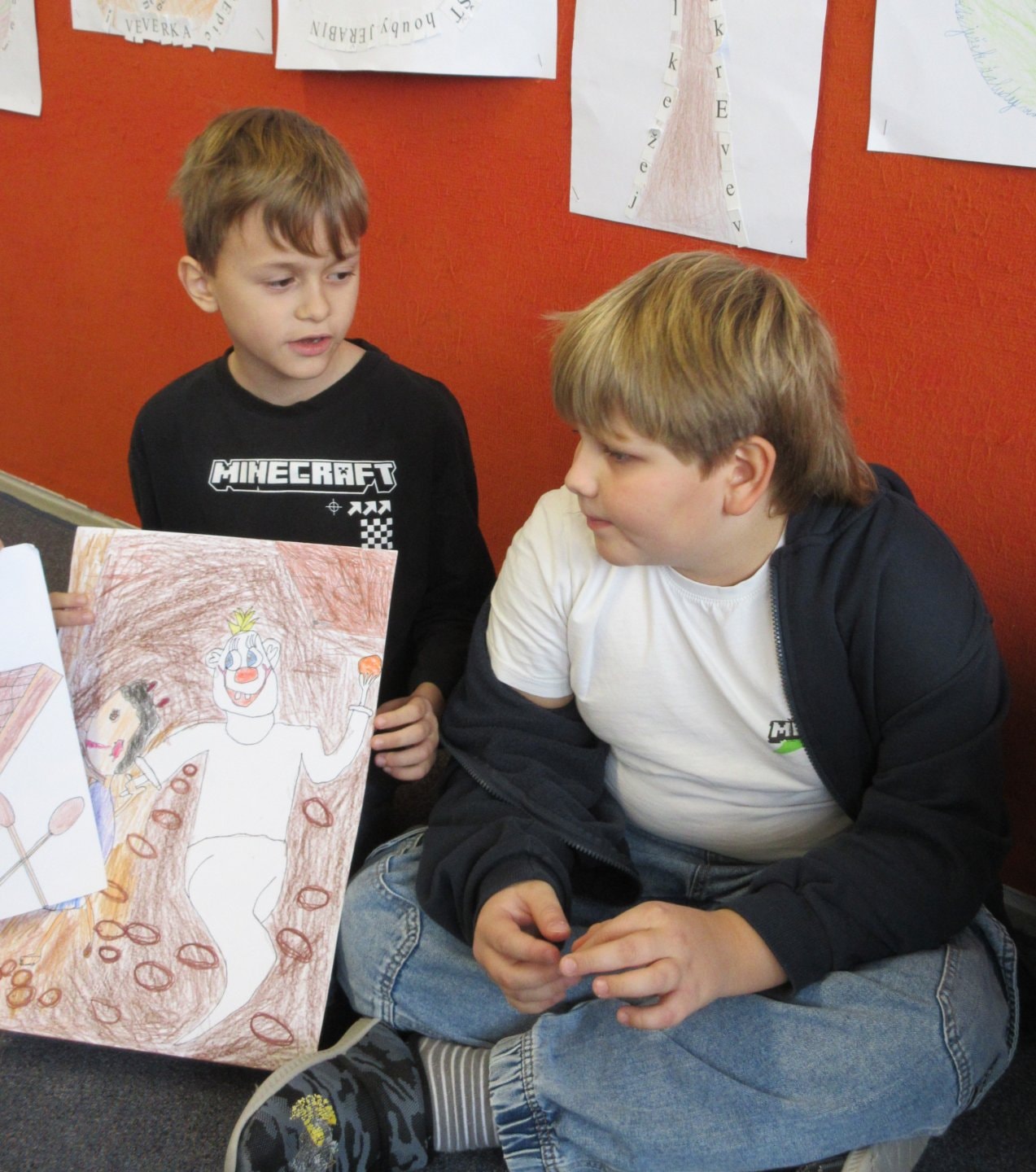 Ve čtenářské dílně jsme si po přečtení celé knihy povyprávěli o tom, co se nám líbilo, jaké poučení jsme si z četby vzali a pak ve dvojicích děti nakreslily obrázek k příběhu, který je nejvíce zaujal. Závěrem každý sám vyplnil zprávu o knize a zapsal úryvek, který jej nejvíce oslovil.