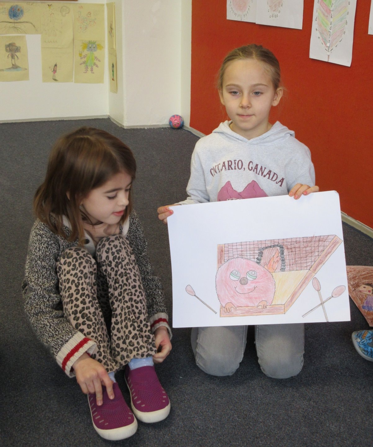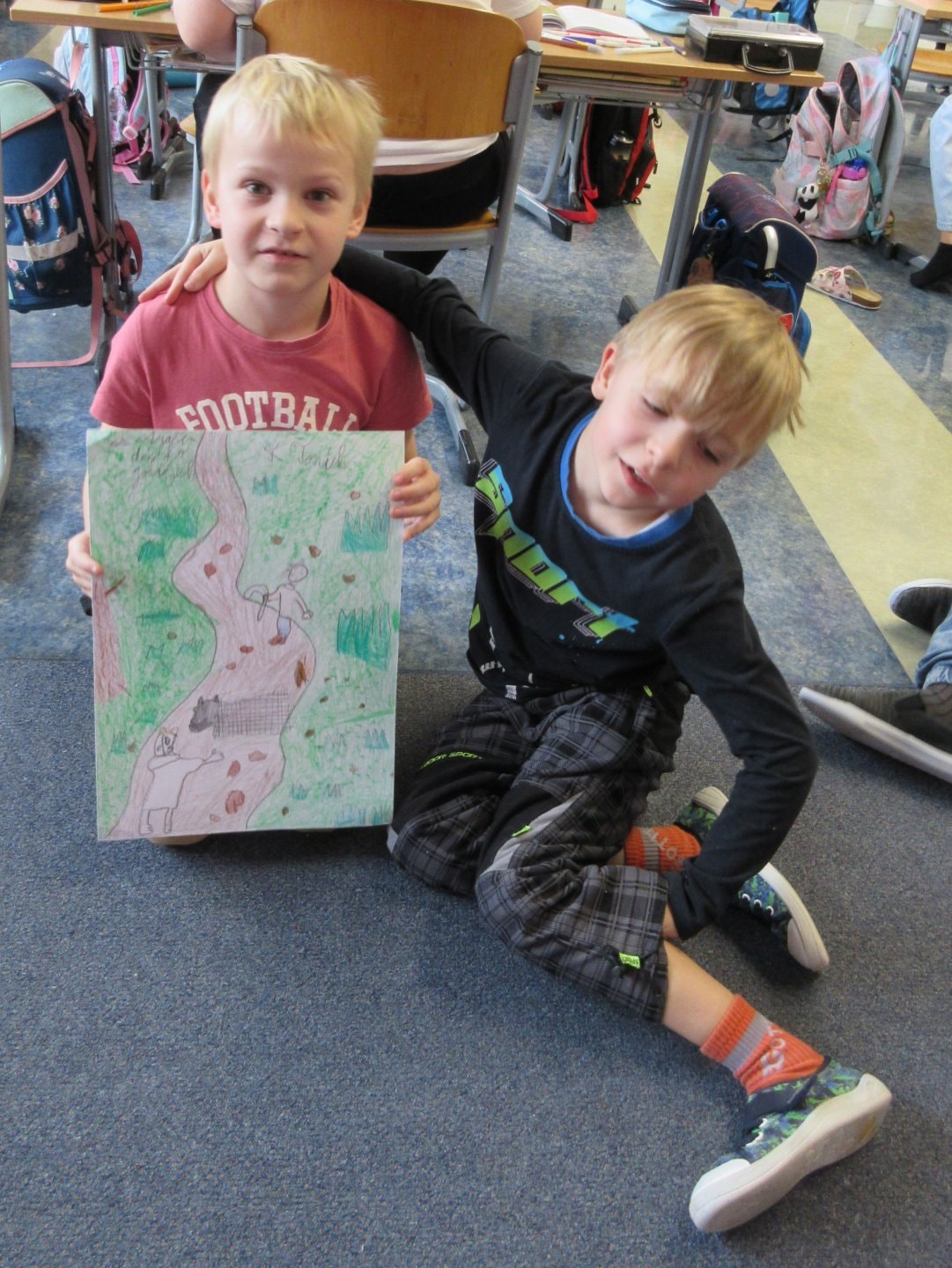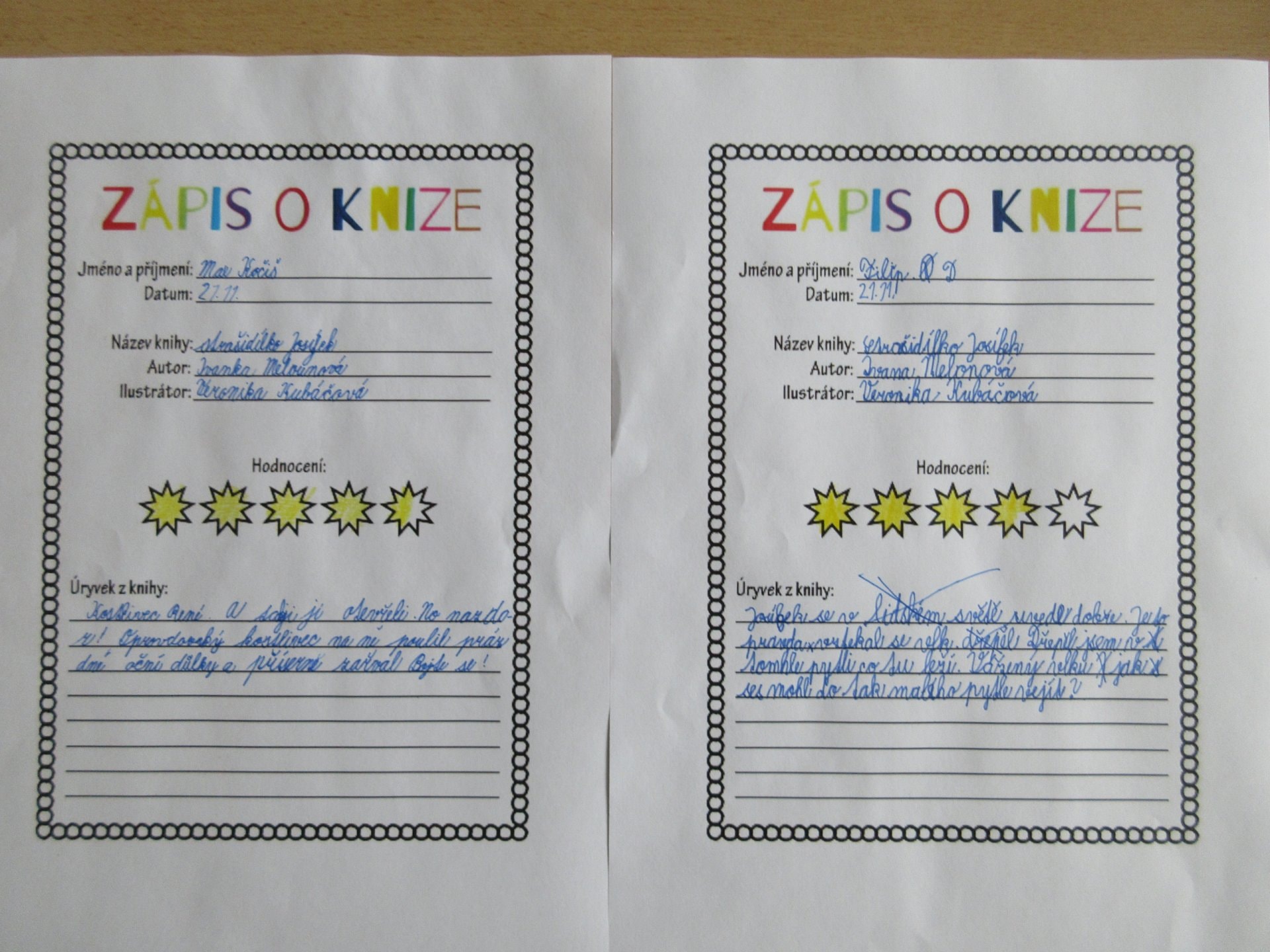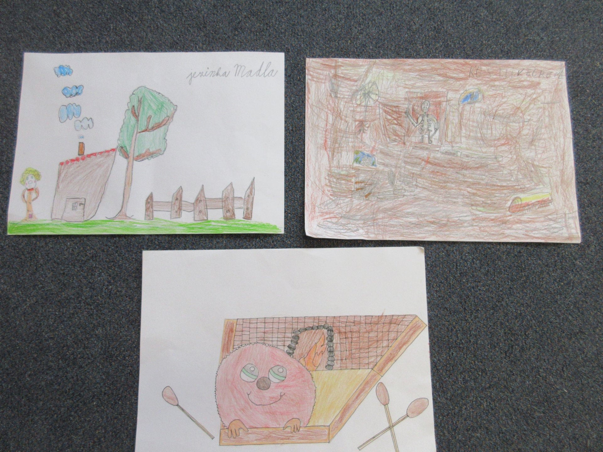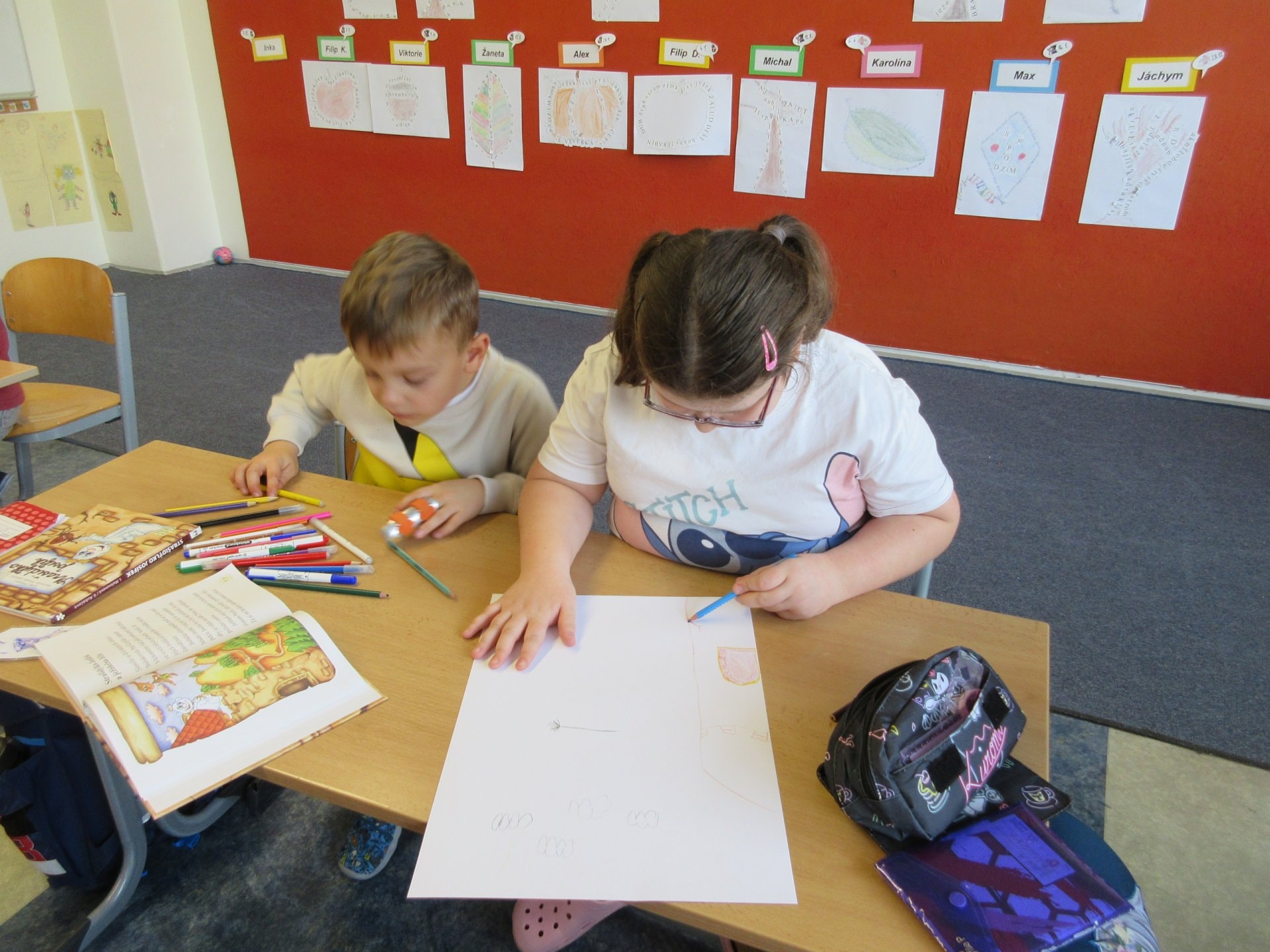 Ve čtenářské dílně jsme si po přečtení celé knihy povyprávěli o tom, co se nám líbilo, jaké poučení jsme si z četby vzali a pak ve dvojicích děti nakreslily obrázek k příběhu, který je nejvíce zaujal. Závěrem každý sám vyplnil zprávu o knize a zapsal úryvek, který jej nejvíce oslovil.