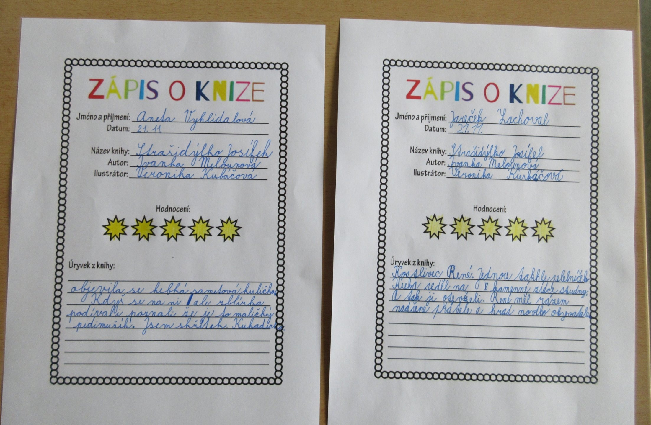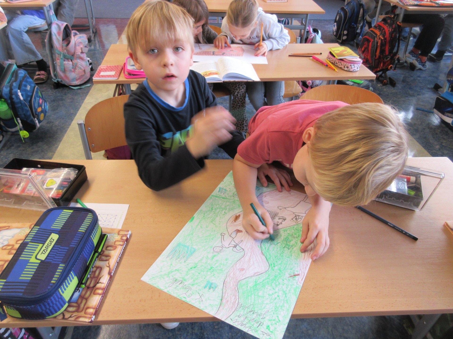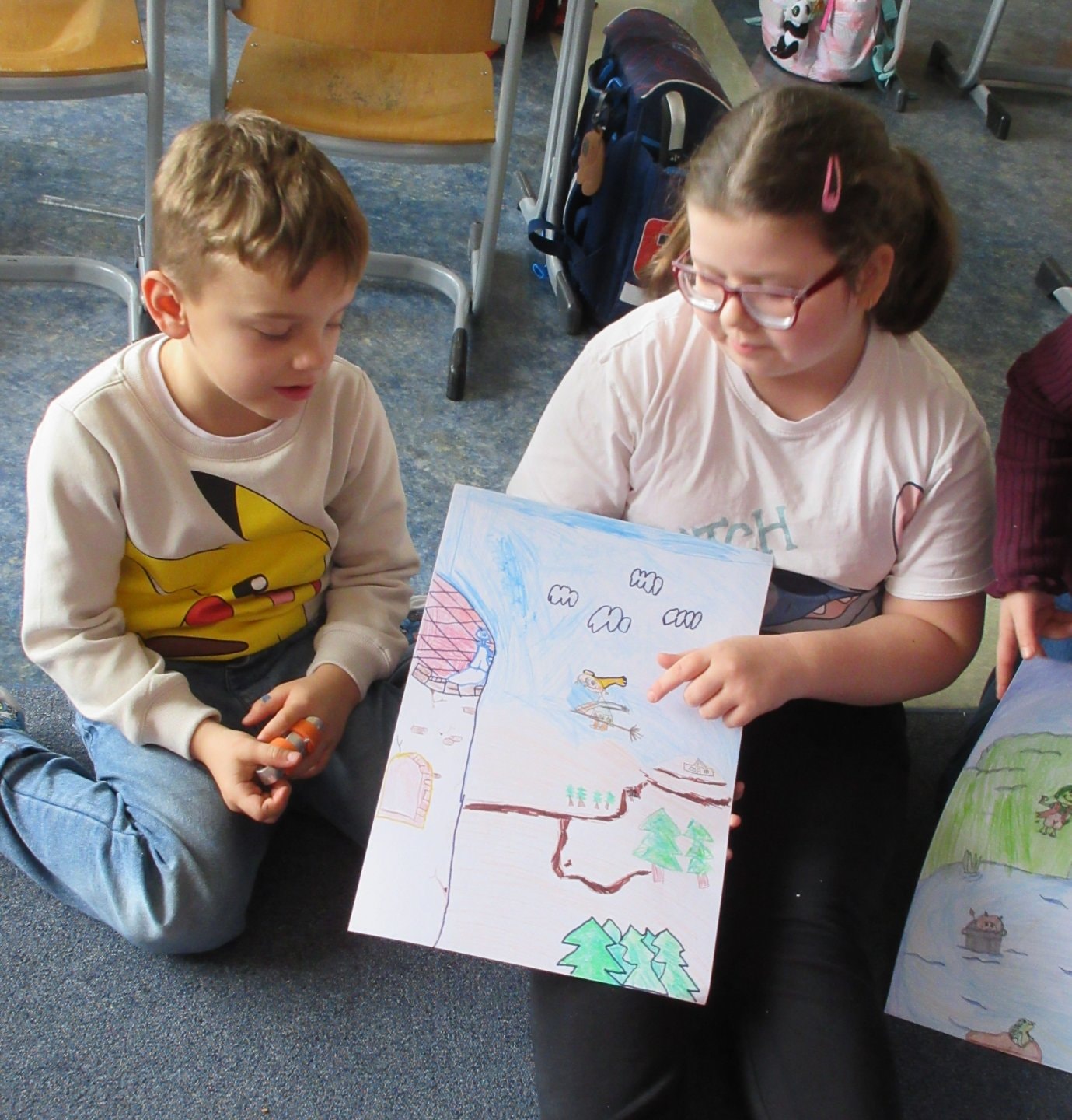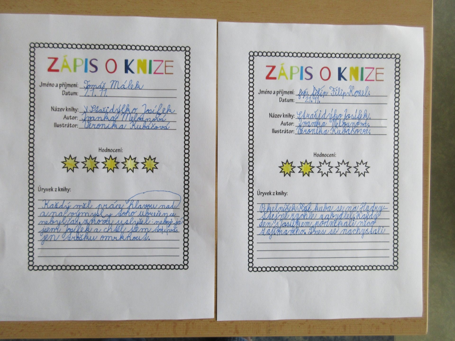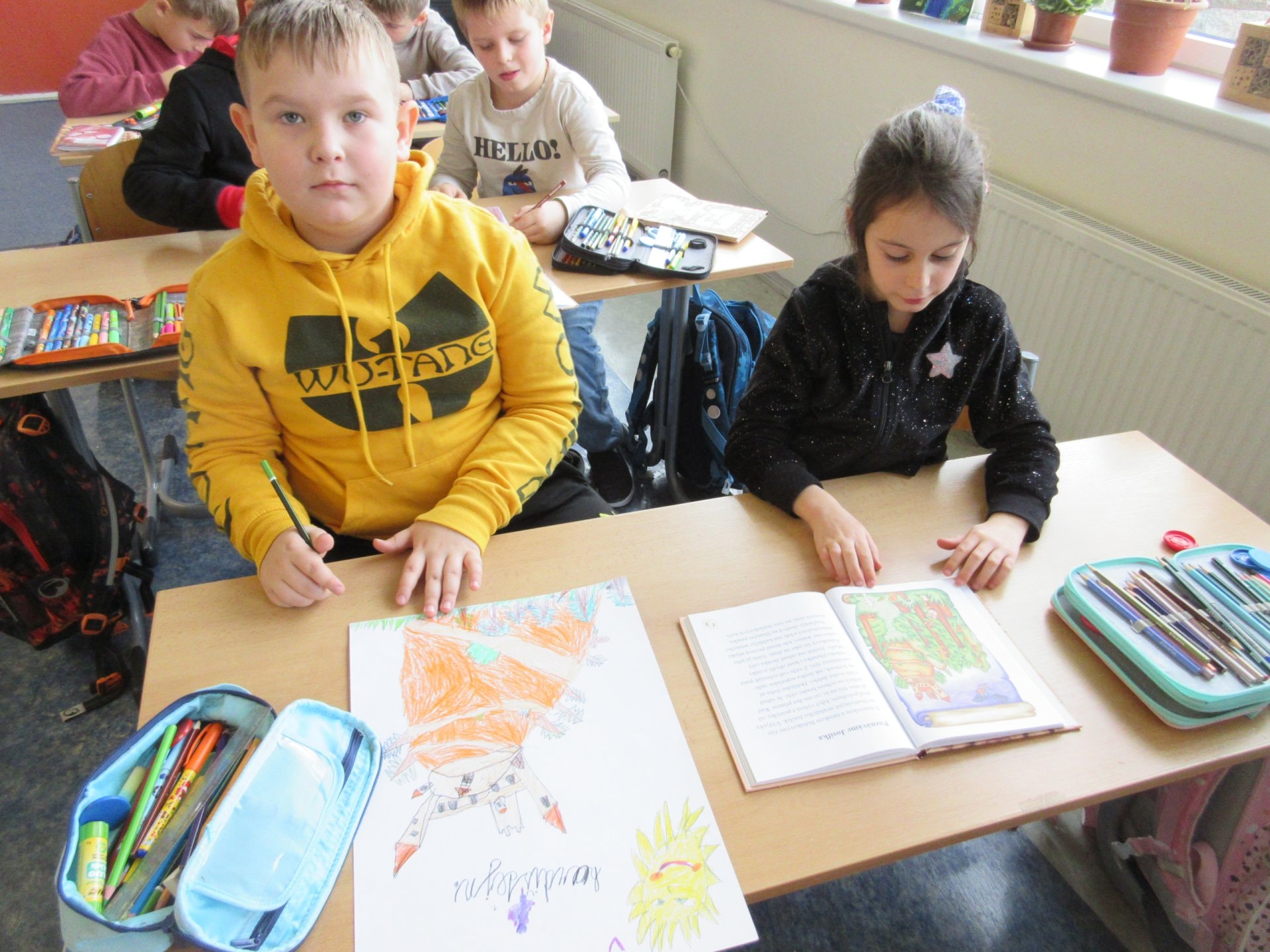 Ve čtenářské dílně jsme si po přečtení celé knihy povyprávěli o tom, co se nám líbilo, jaké poučení jsme si z četby vzali a pak ve dvojicích děti nakreslily obrázek k příběhu, který je nejvíce zaujal. Závěrem každý sám vyplnil zprávu o knize a zapsal úryvek, který jej nejvíce oslovil.