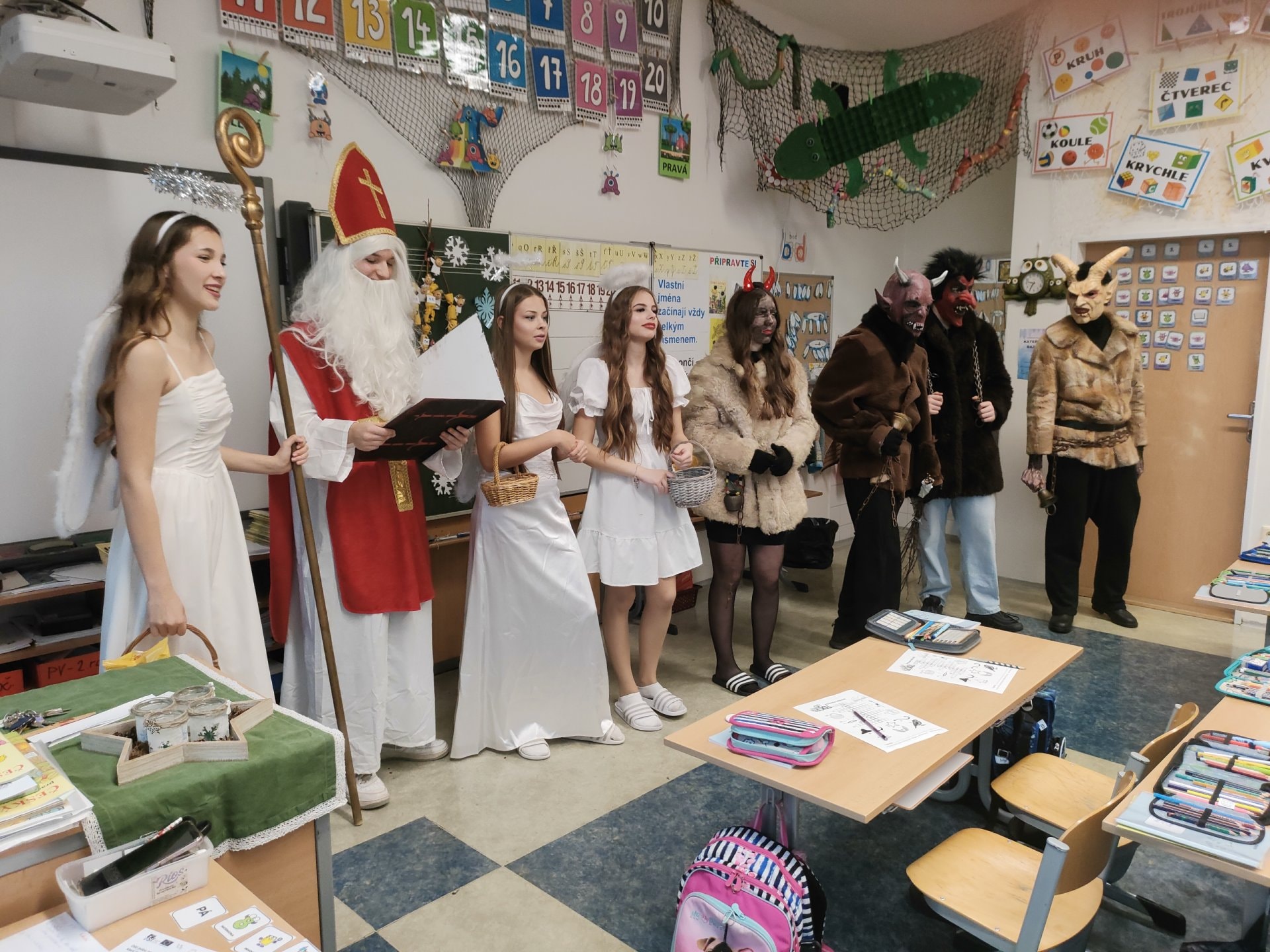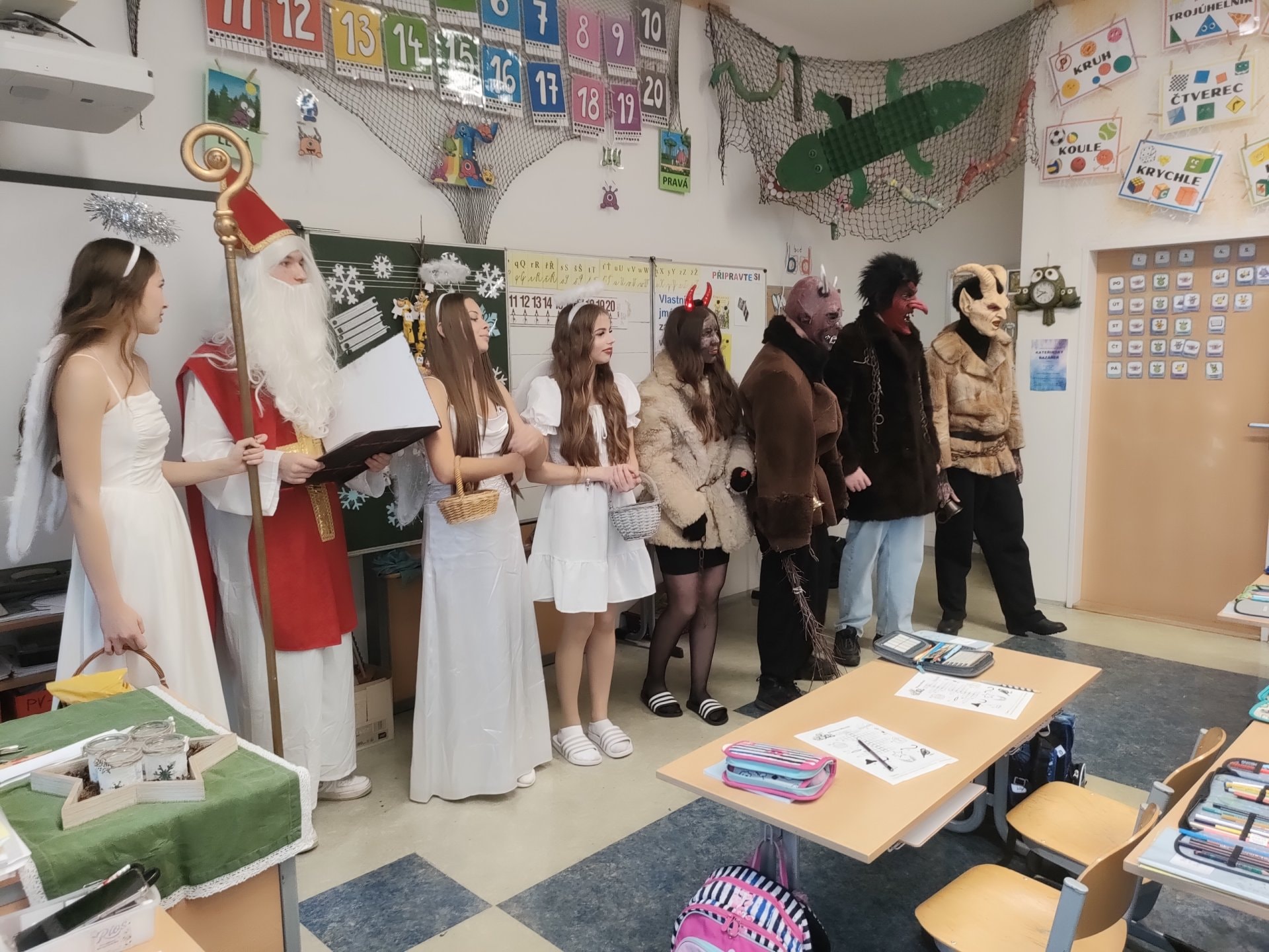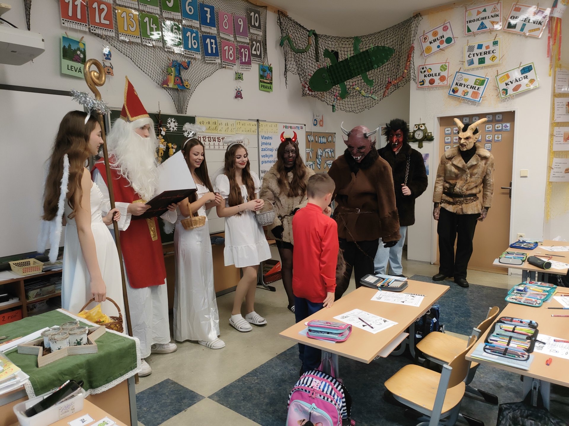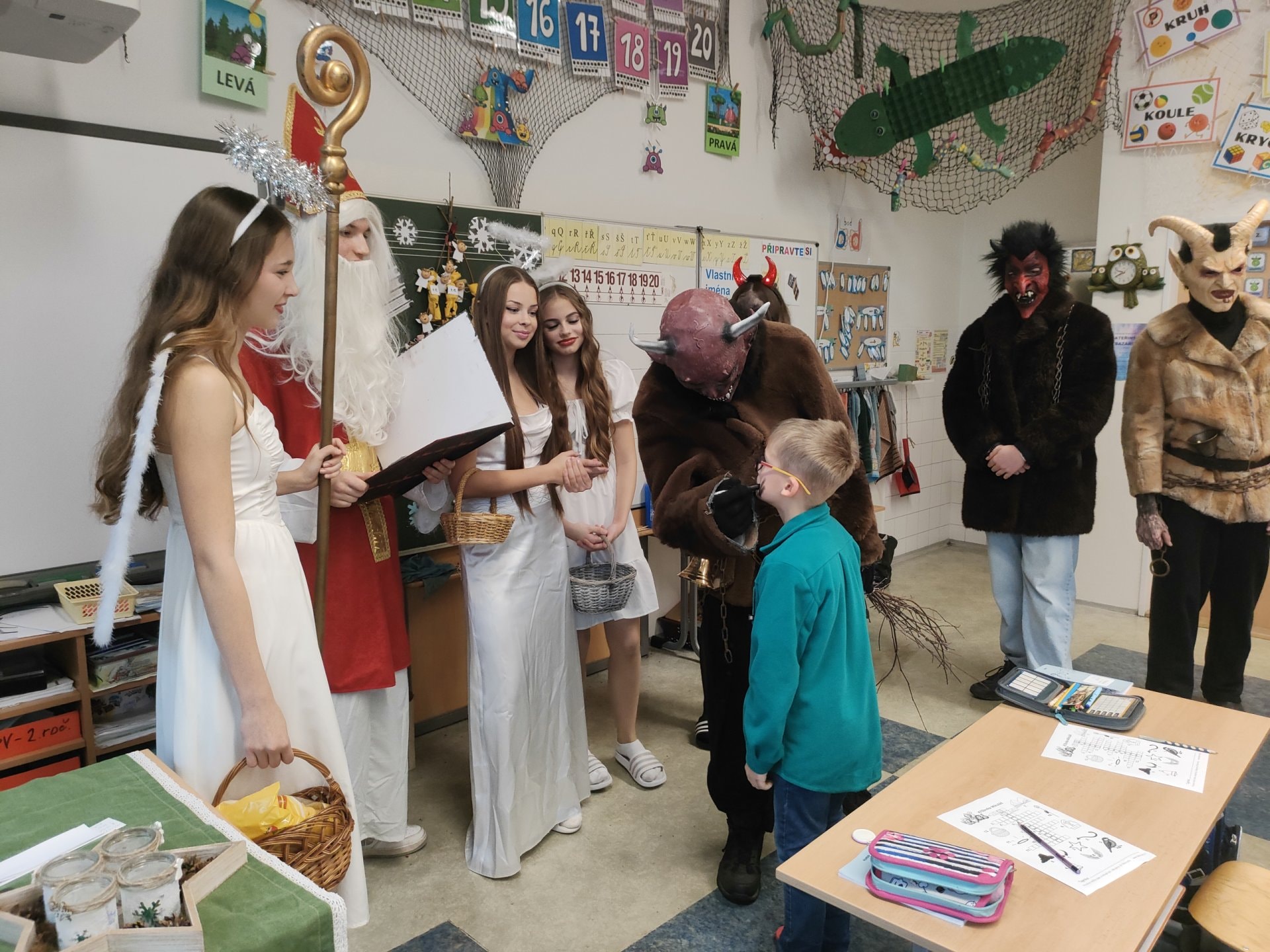 Náš školní den zpestřila návštěva Mikuláše. Andělé rozdávali úsměvy, čerti trochu postrašili, ale nakonec nechyběla nadílka.