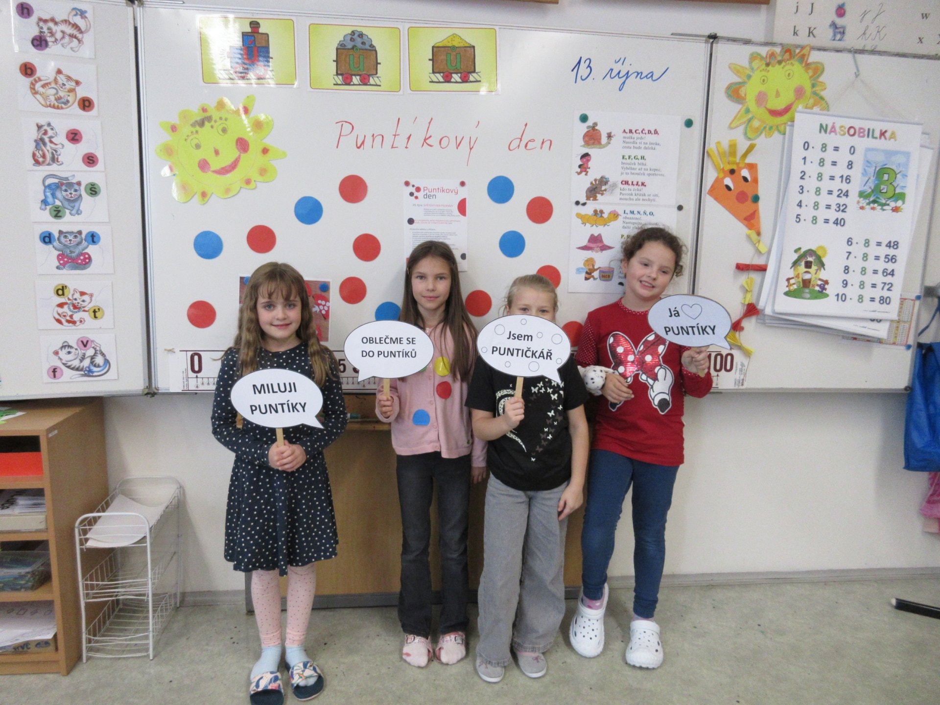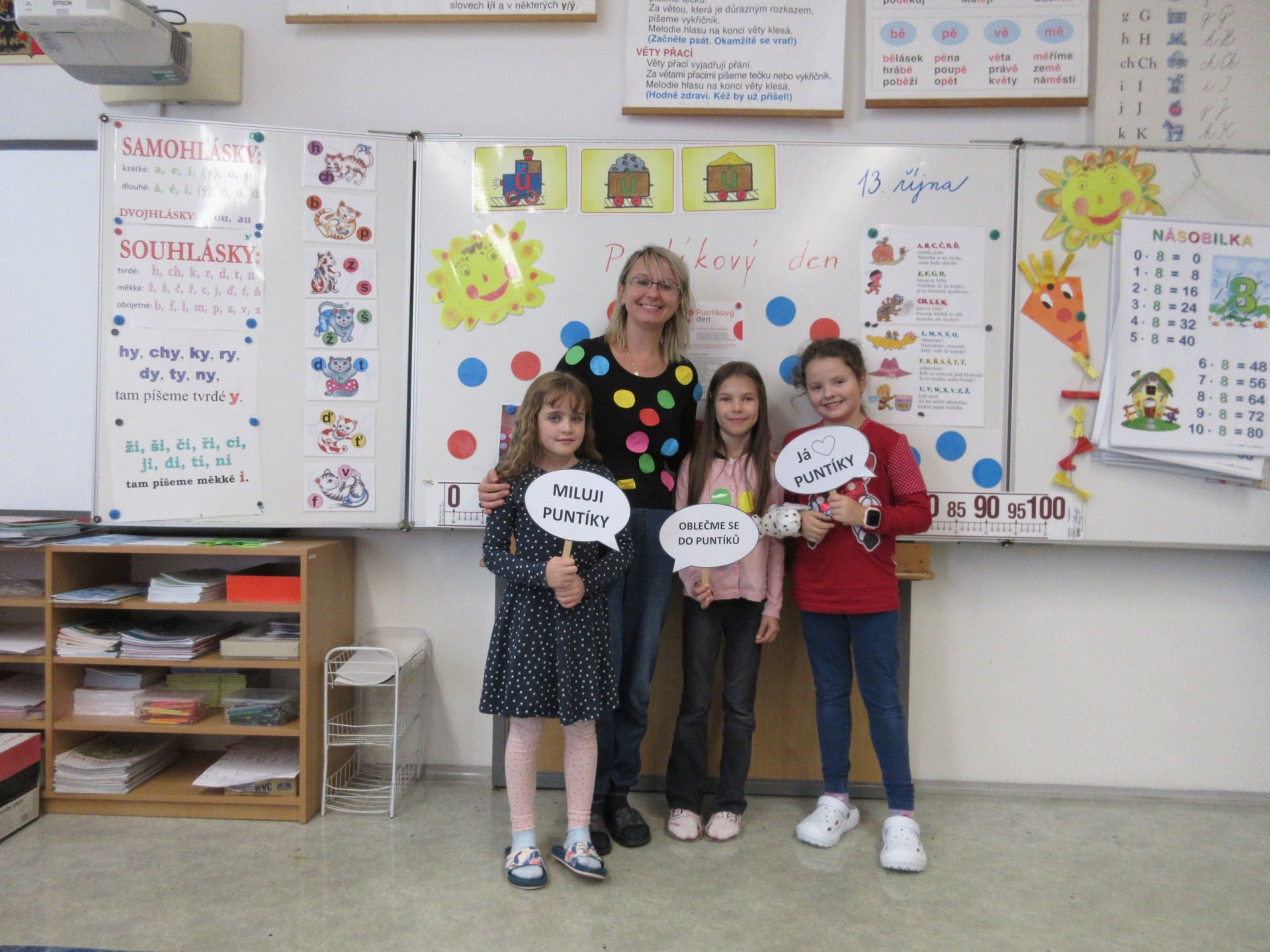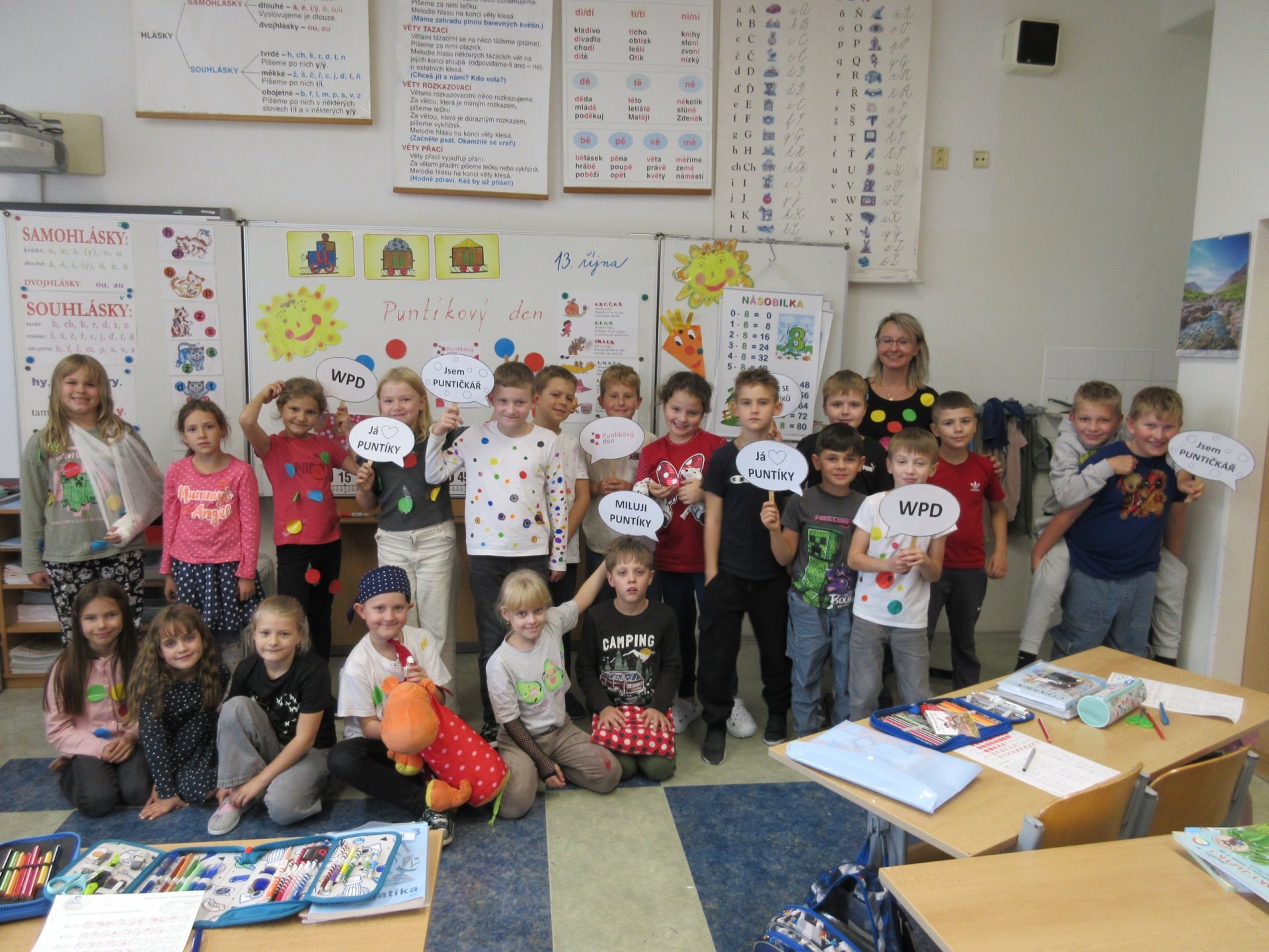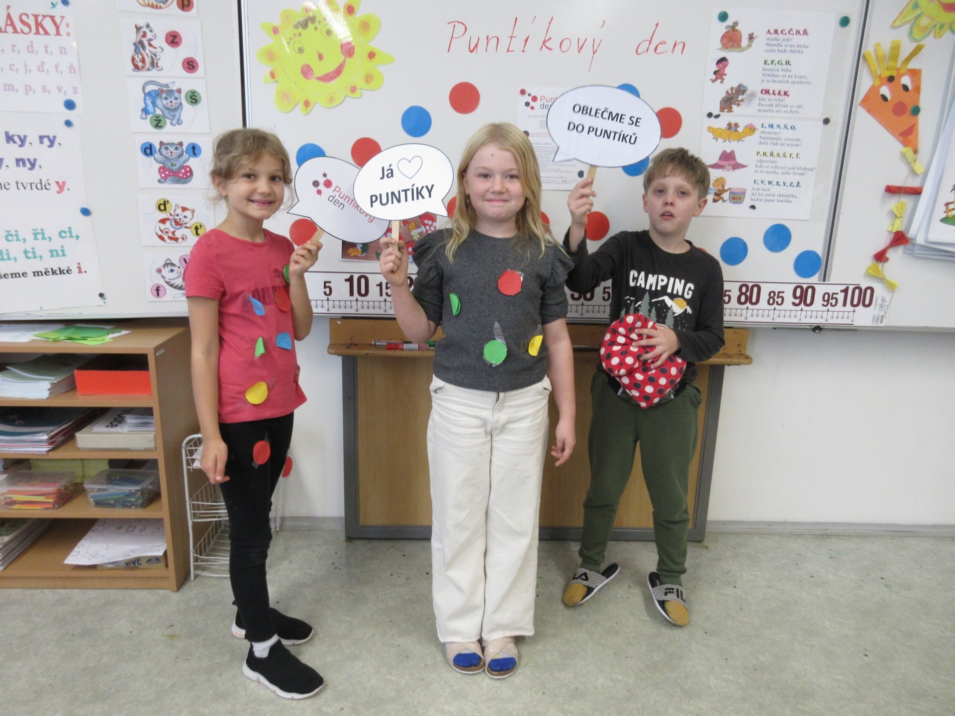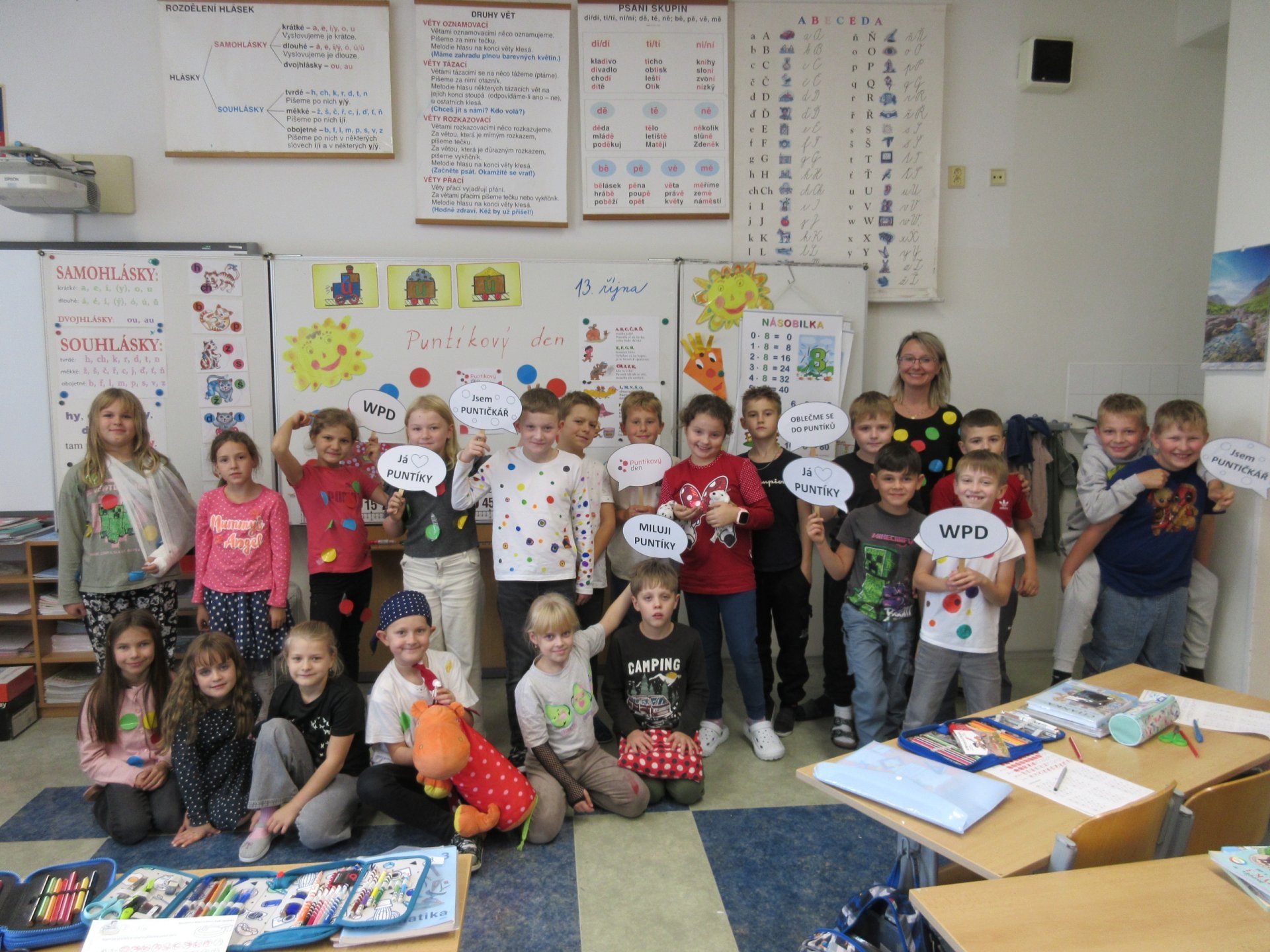 V pondělí 13. října si děti na sebe vzaly puntíkové oblečení a přinesly spoustu věcí s puntíky. Celé dopoledne jsme se v hodinách českého jazyka a matematiky učily netradičně a hledaly jsme puntíky, kde se jen dalo...Ve výtvarné výchově děti tentokrát tvořily červené muchomůrky s bílými puntíky.