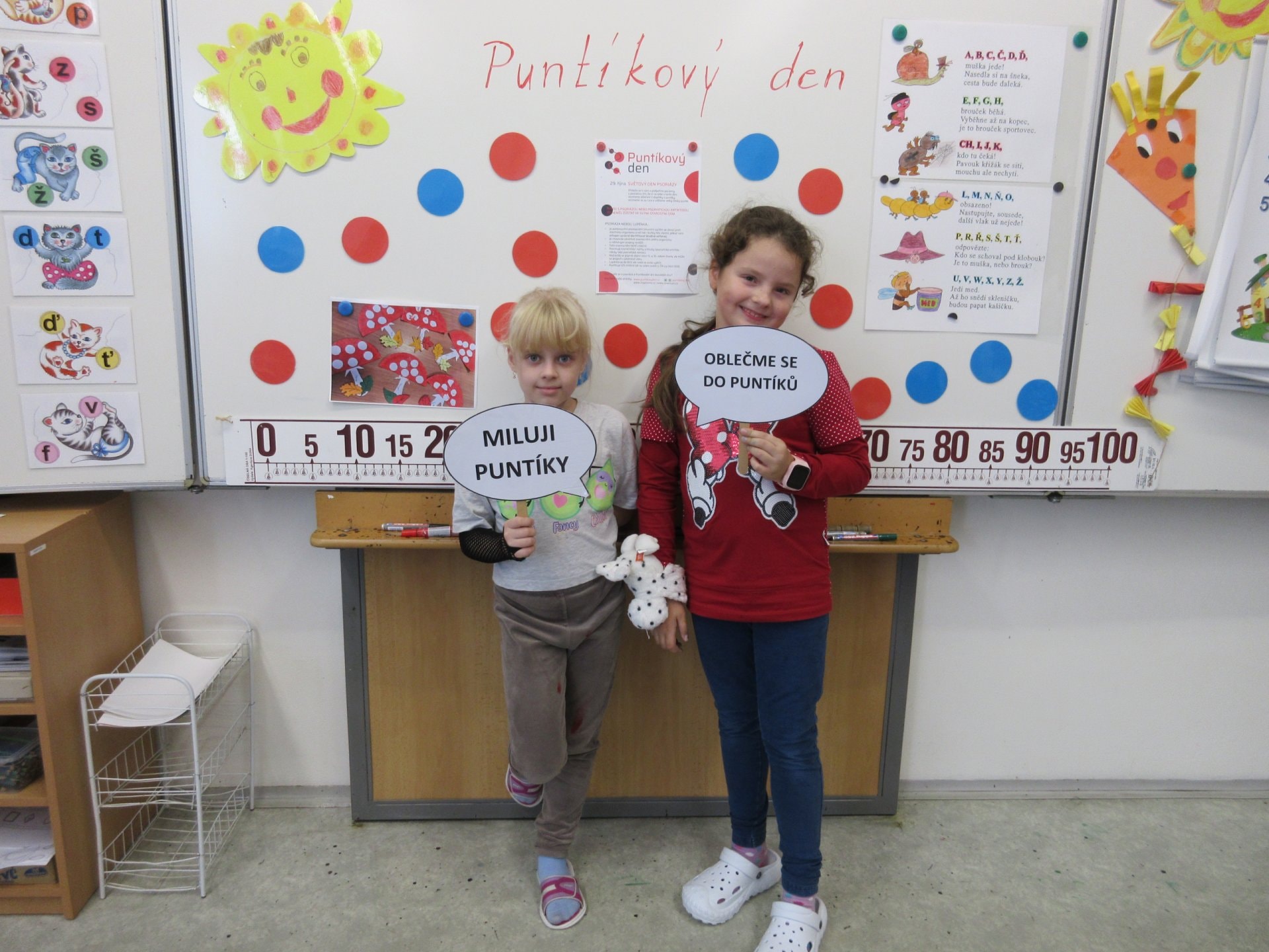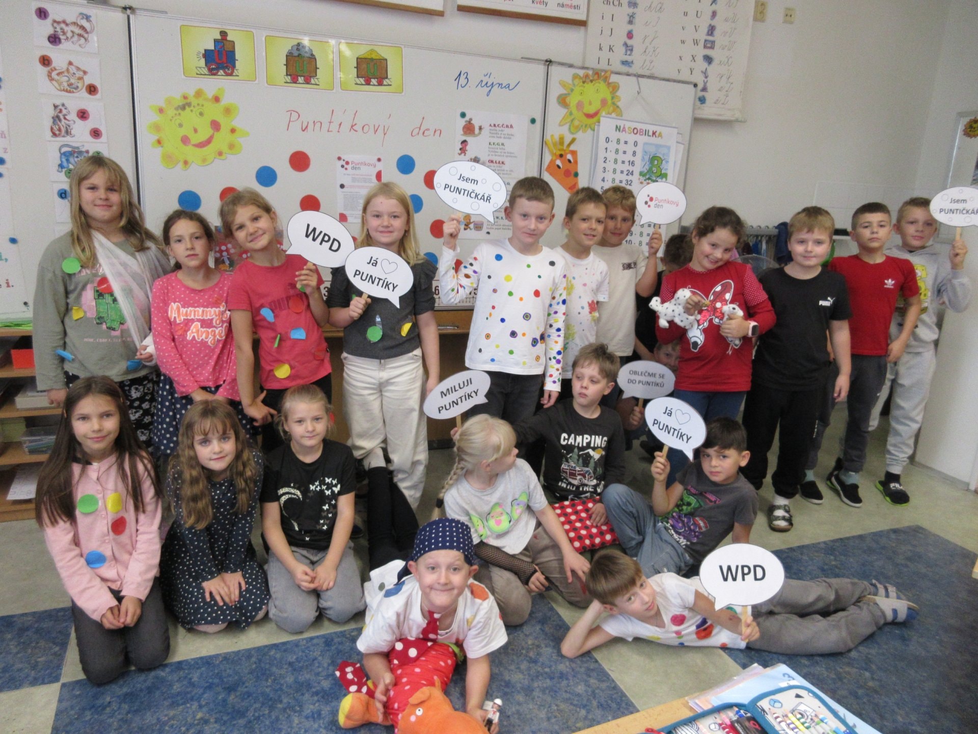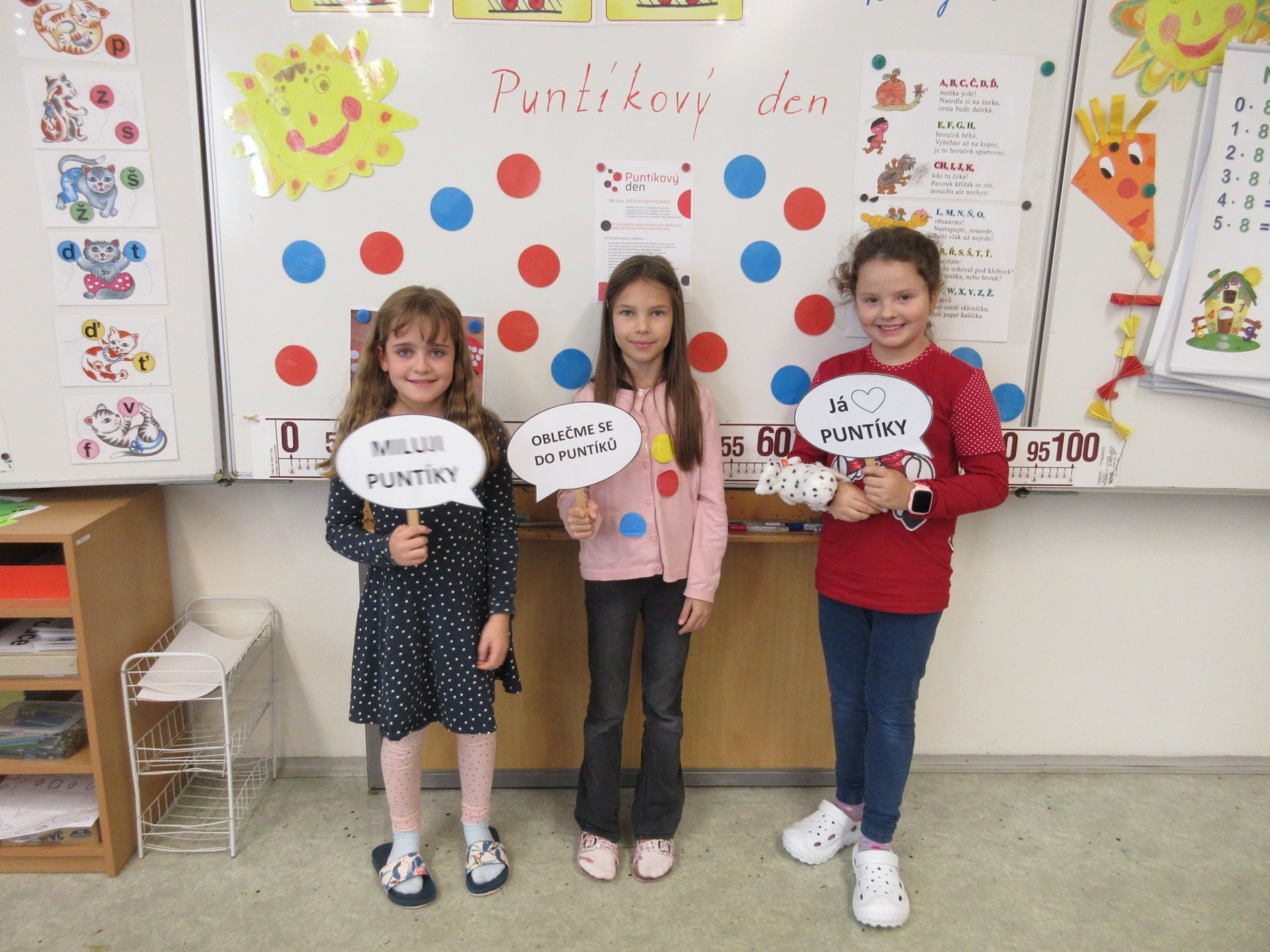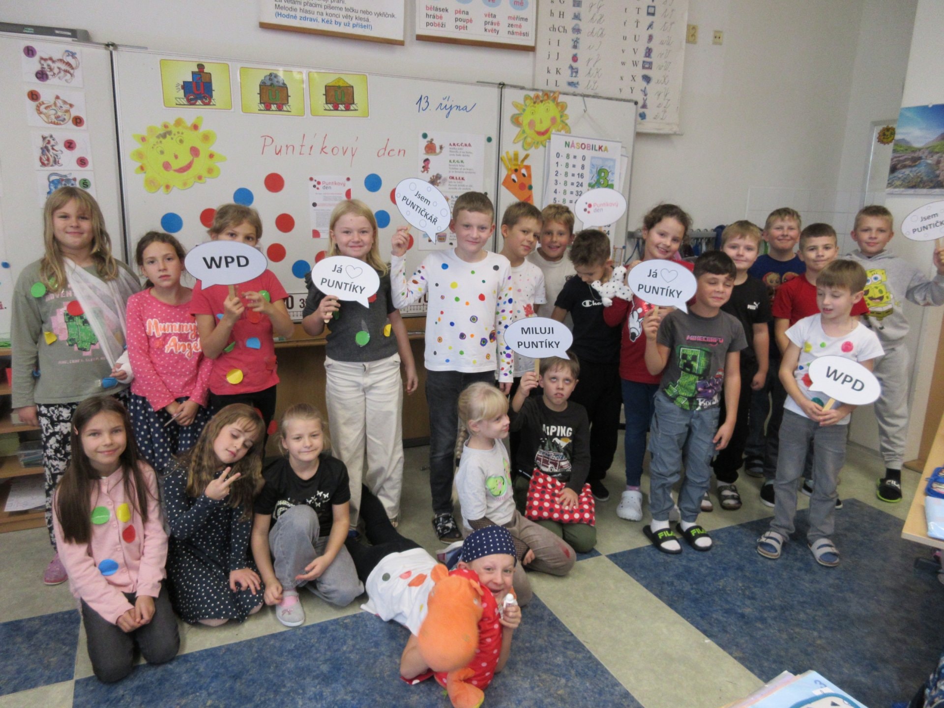 V pondělí 13. října si děti na sebe vzaly puntíkové oblečení a přinesly spoustu věcí s puntíky. Celé dopoledne jsme se v hodinách českého jazyka a matematiky učily netradičně a hledaly jsme puntíky, kde se jen dalo...Ve výtvarné výchově děti tentokrát tvořily červené muchomůrky s bílými puntíky.