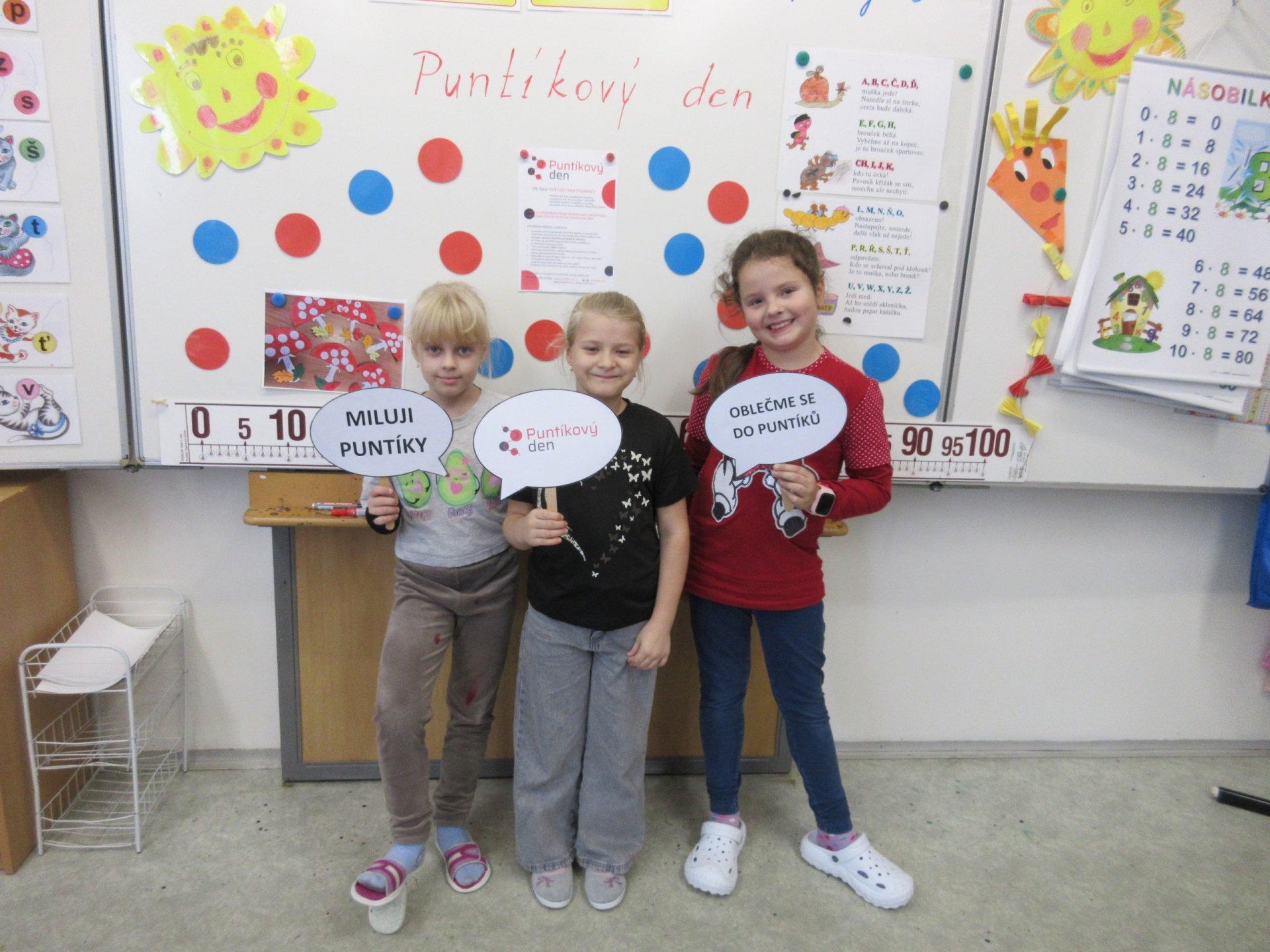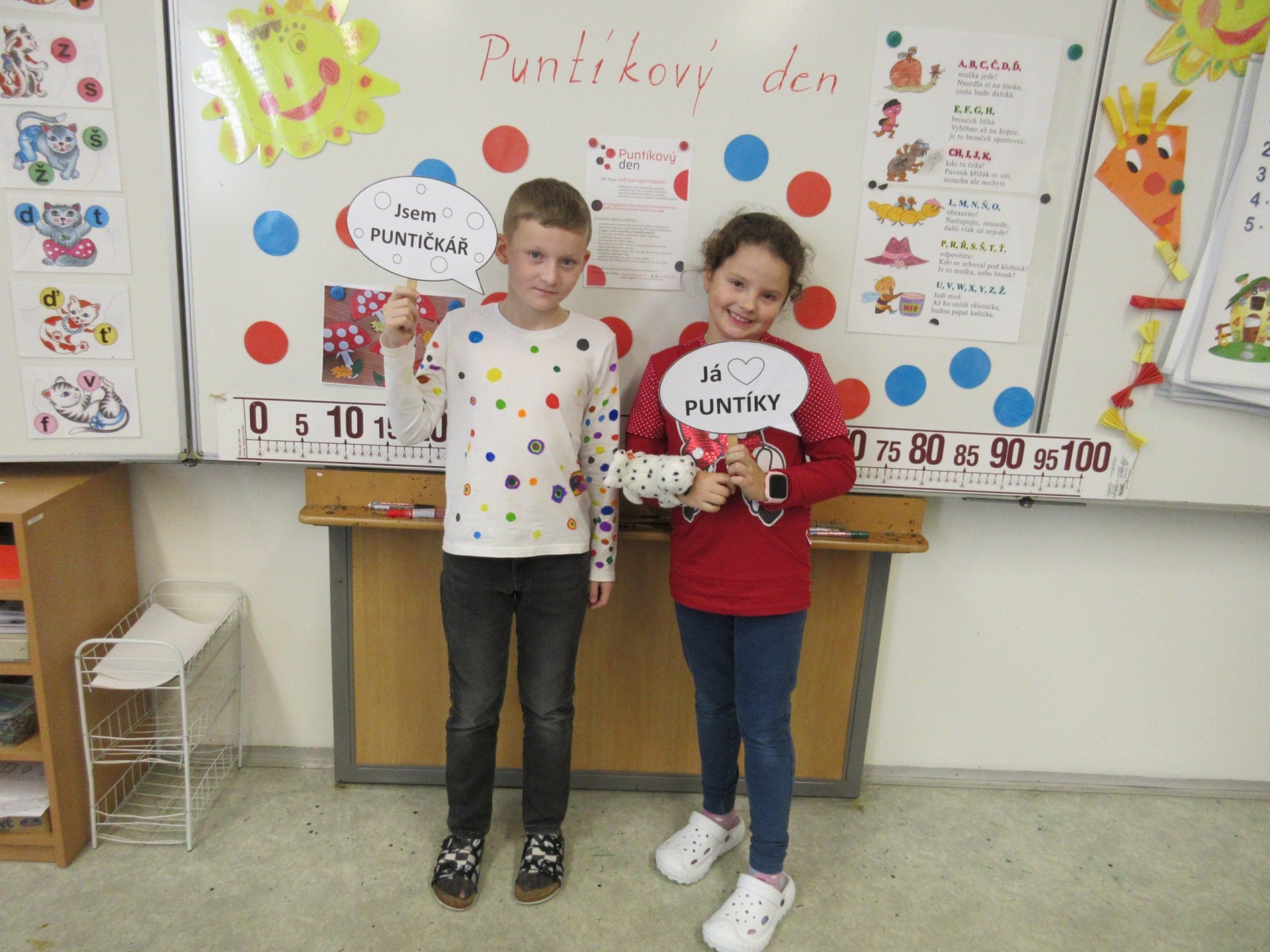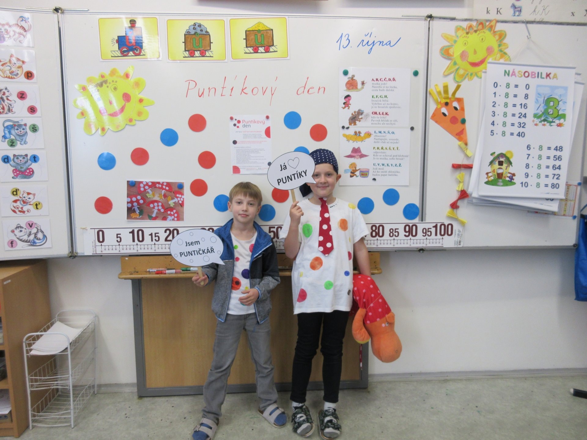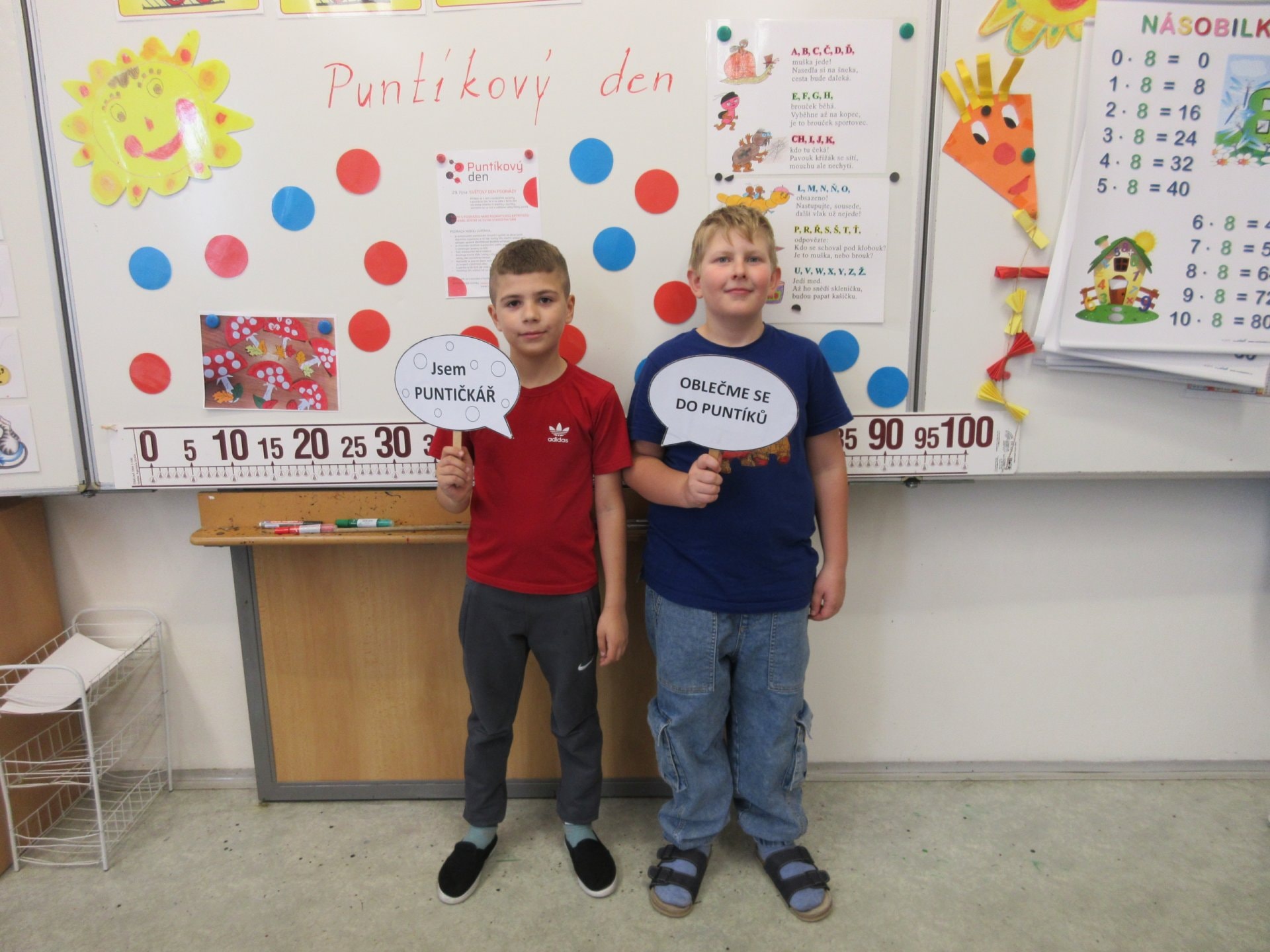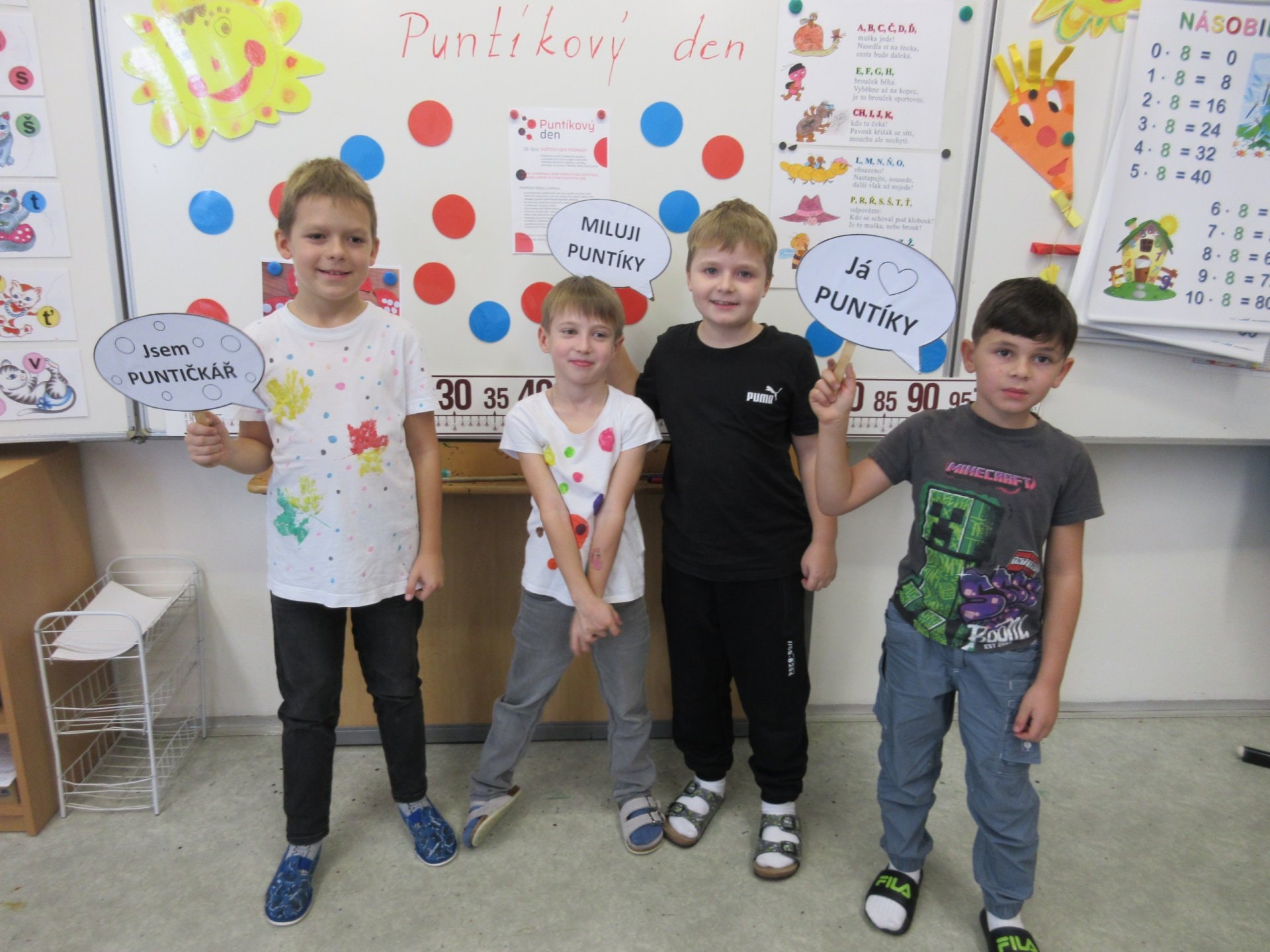V pondělí 13. října si děti na sebe vzaly puntíkové oblečení a přinesly spoustu věcí s puntíky. Celé dopoledne jsme se v hodinách českého jazyka a matematiky učily netradičně a hledaly jsme puntíky, kde se jen dalo...Ve výtvarné výchově děti tentokrát tvořily červené muchomůrky s bílými puntíky.