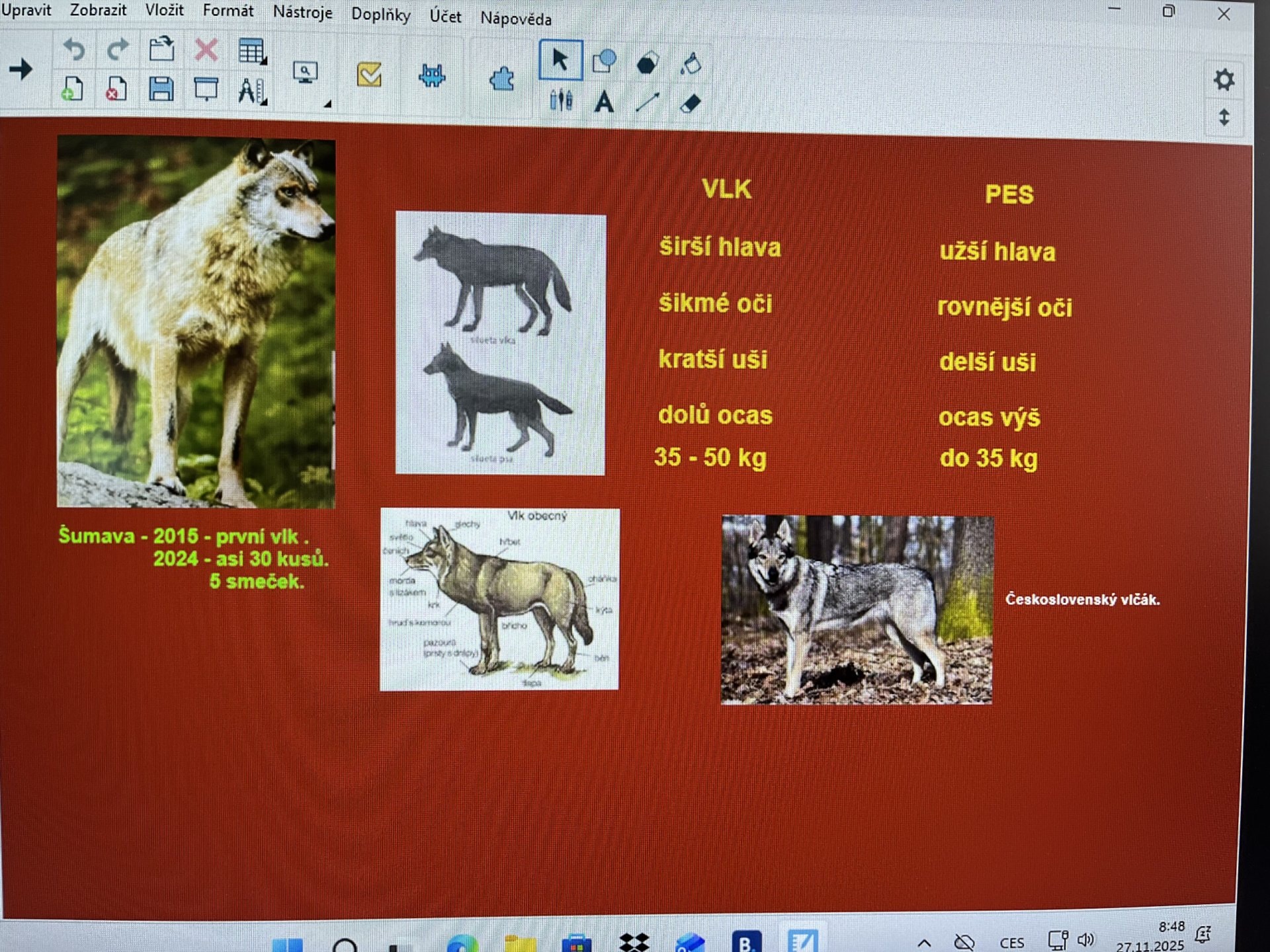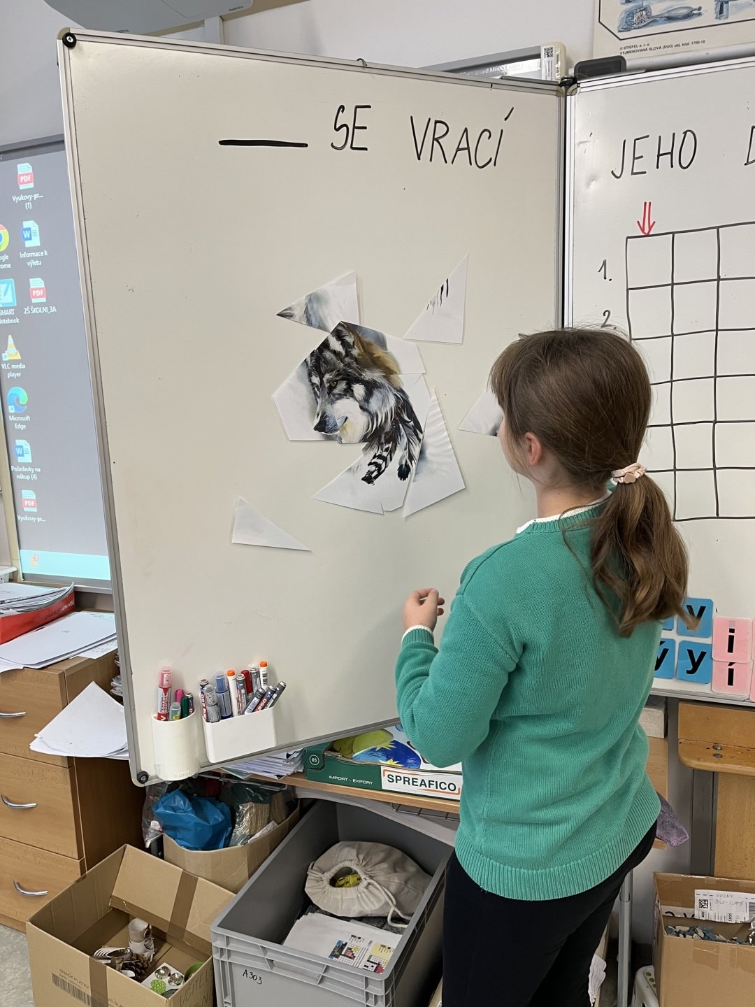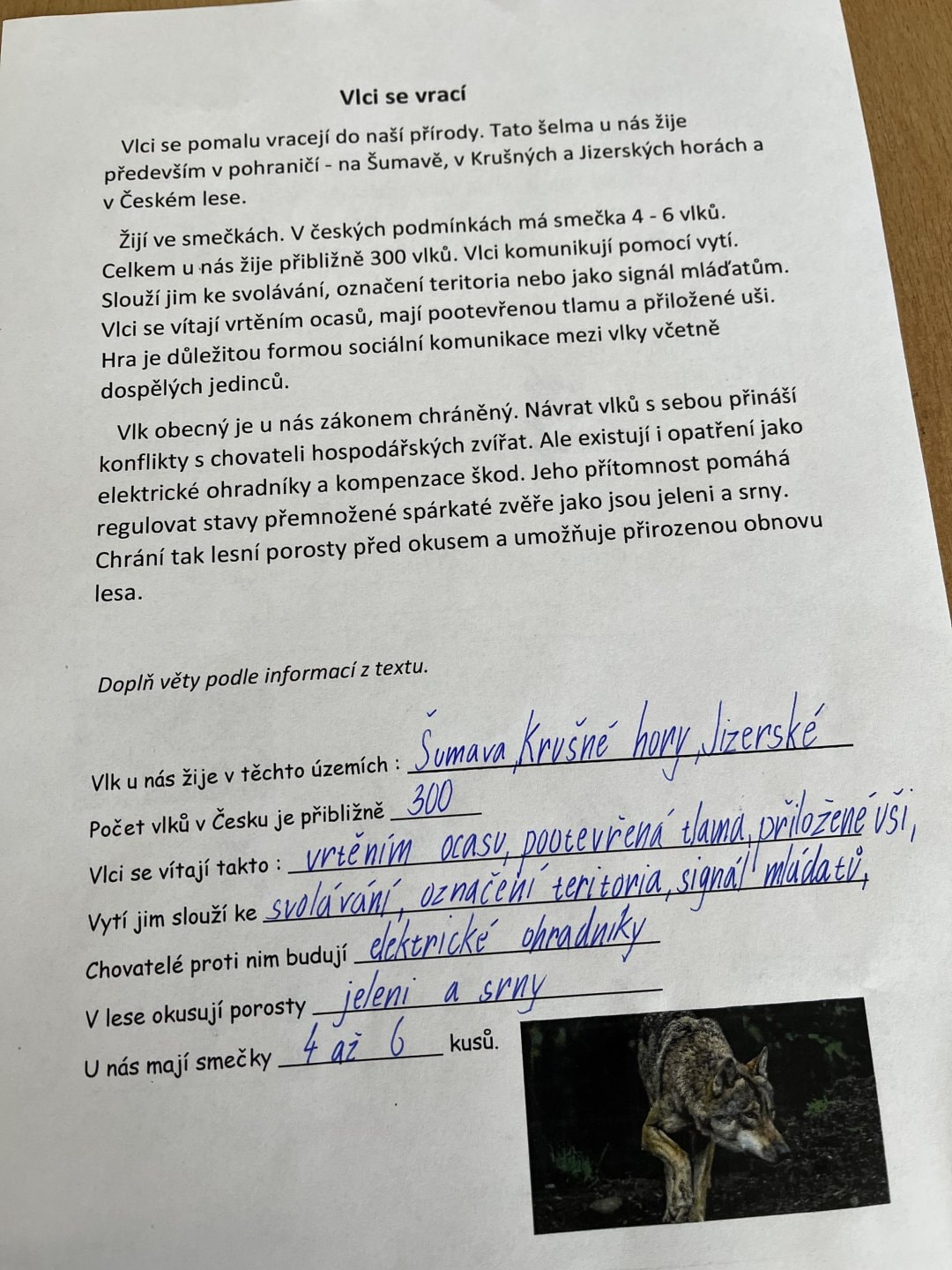 Návštěva školení na Šumavě mě přivedla k myšlence předat poznatky, které jsem získala na této zajímavé akci , dětem ve škole. Jednu ze zajímavých přednášek vedl i Phd. Jan Mokrý, který se věnuje problematice návratu vlka obecného na Šumavu i do jiných lokalit v Česku. Dětem jsem připravila nejen prezentaci, ale i další doplňkové úkoly na toto téma. Na závěr dne jsme si prošli vlčí stezku a vyrobili vlky z javorových listů.
