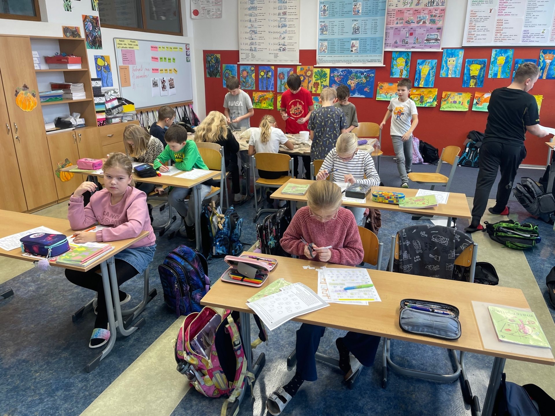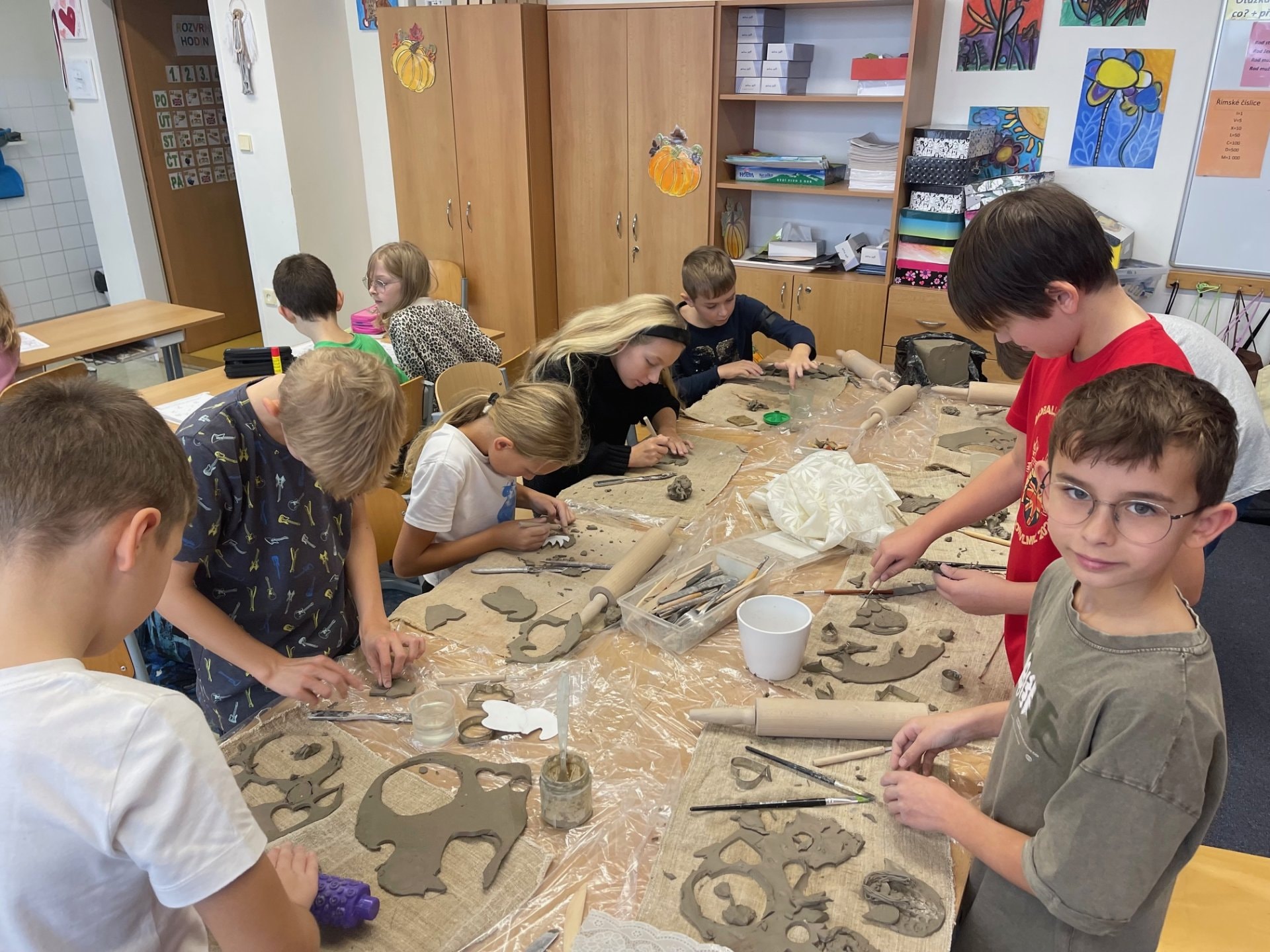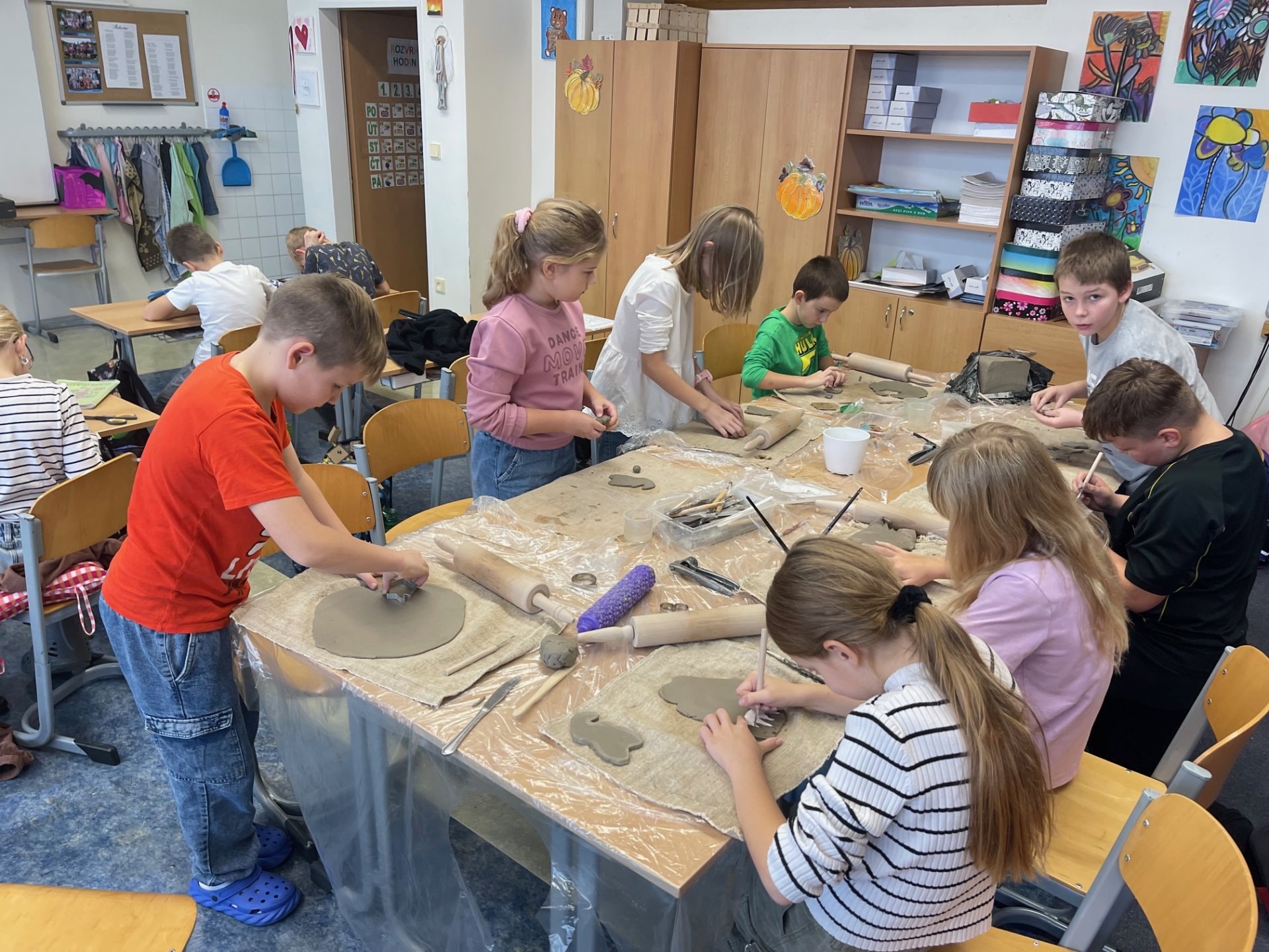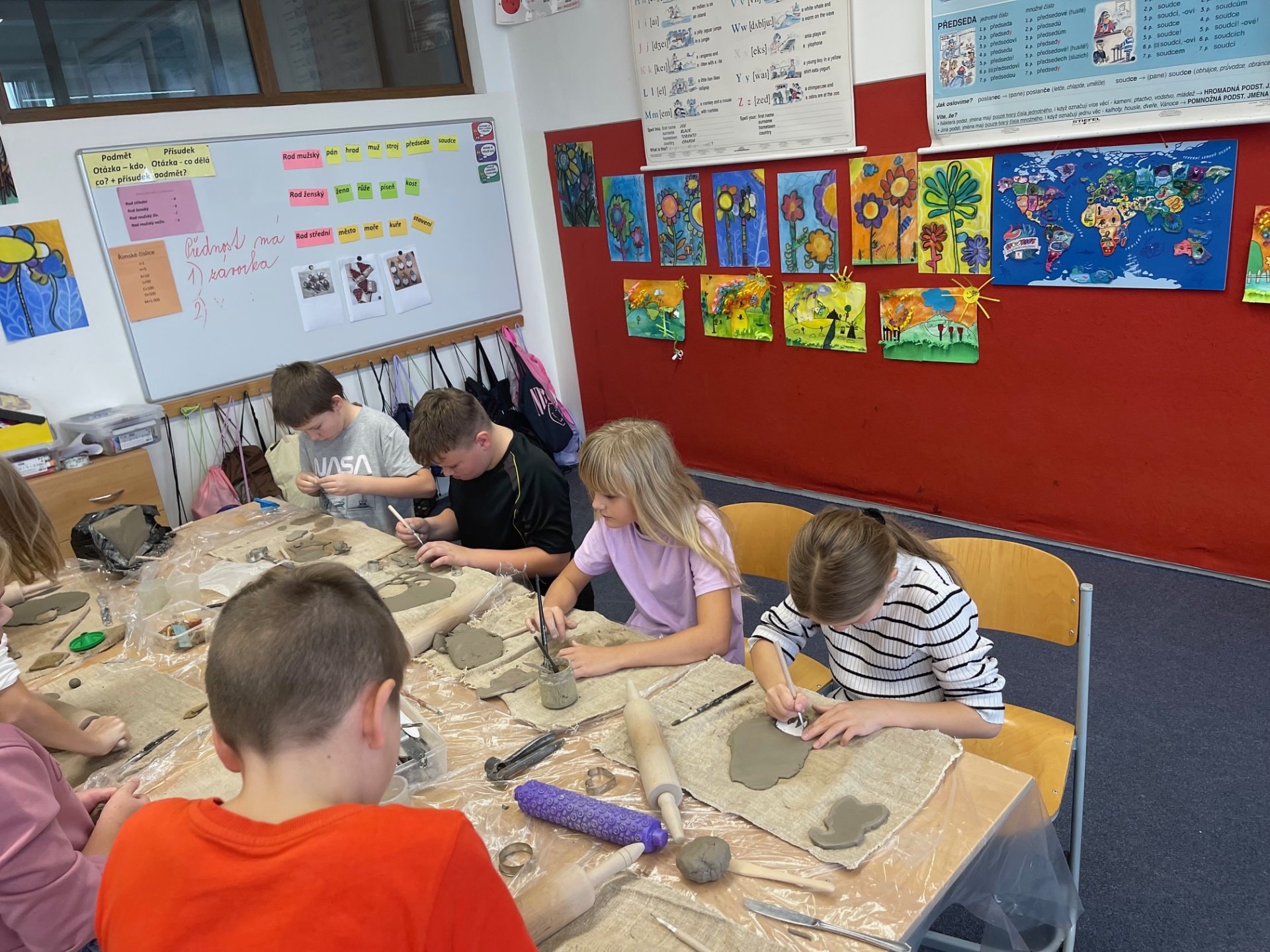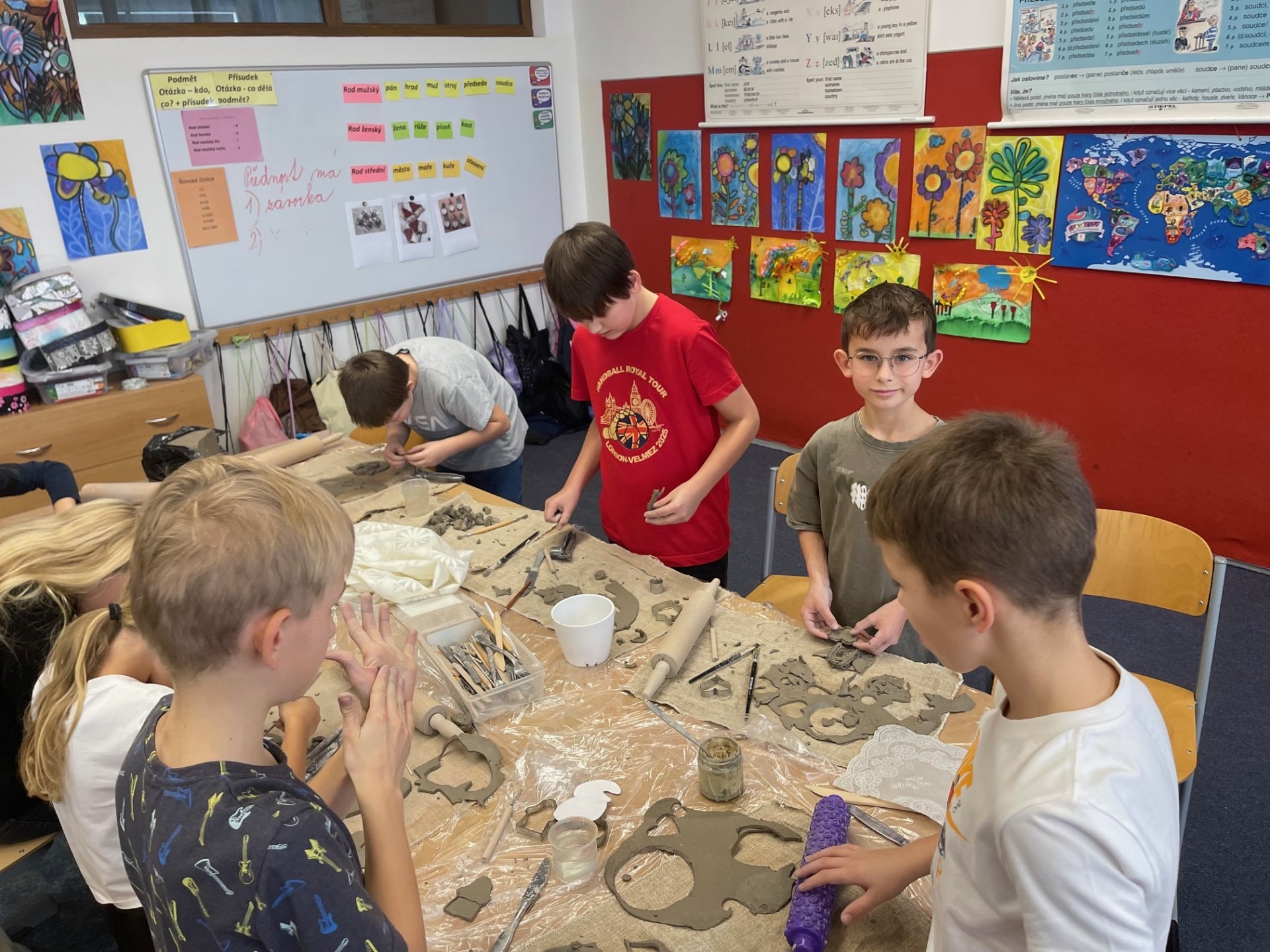 Chystáme vánoční překvapení. Děti dostaly kousek hlíny, který nejdříve zpracovaly do koule. Potom ji vyválely na plát a udělaly vánočního skřítka, domeček a andílky. Teď čekáme, až budeme mít výrobky vypálené.