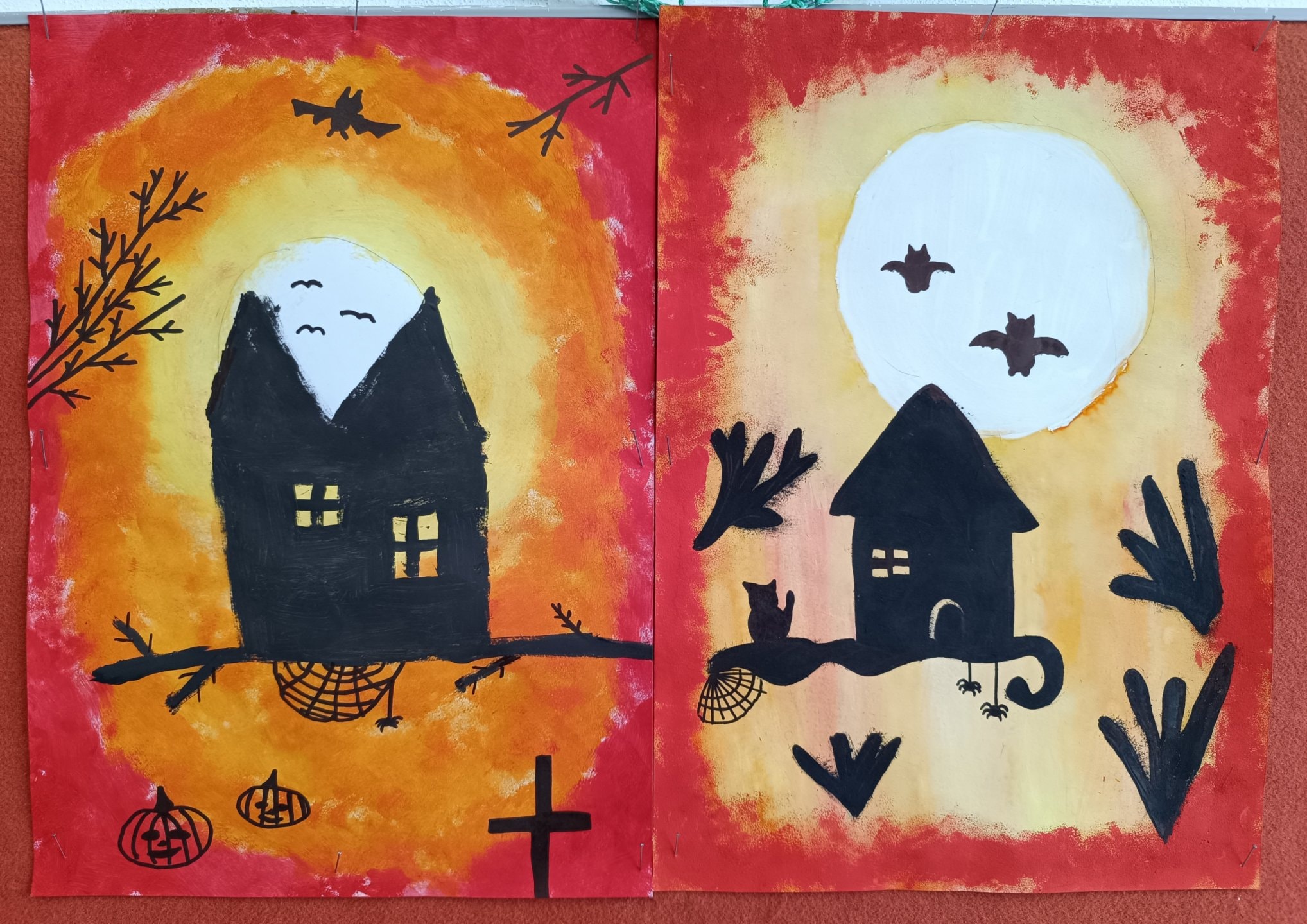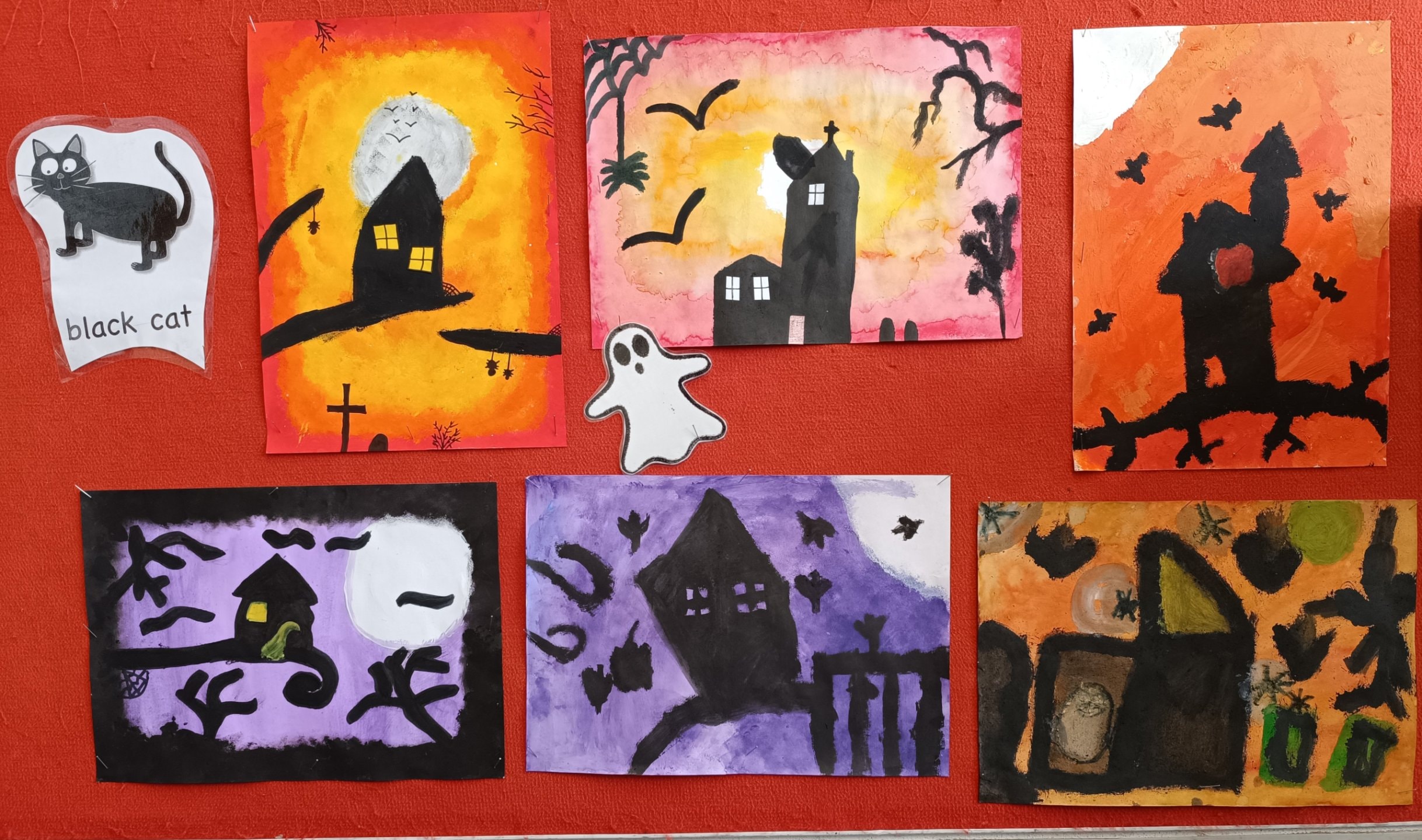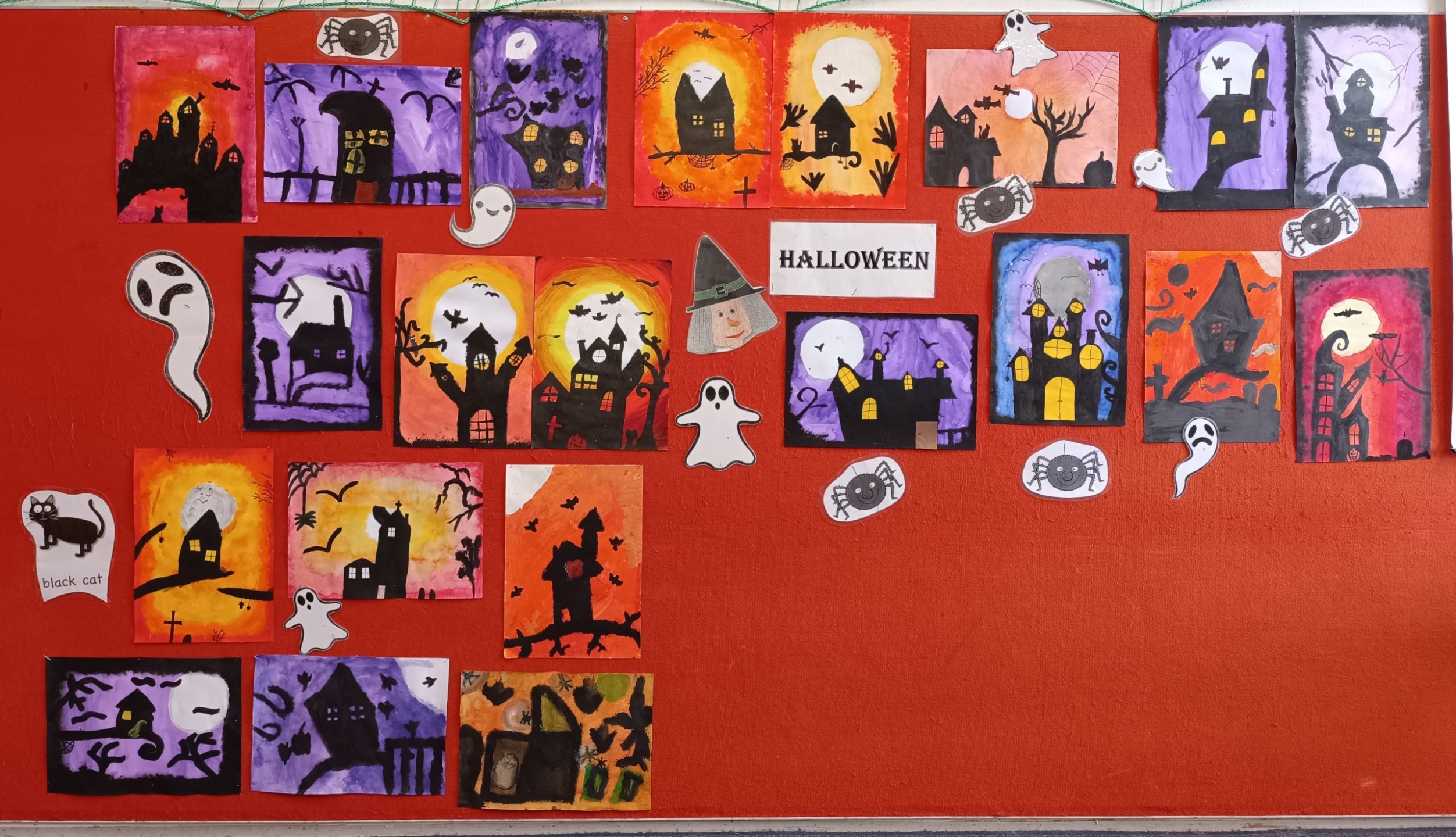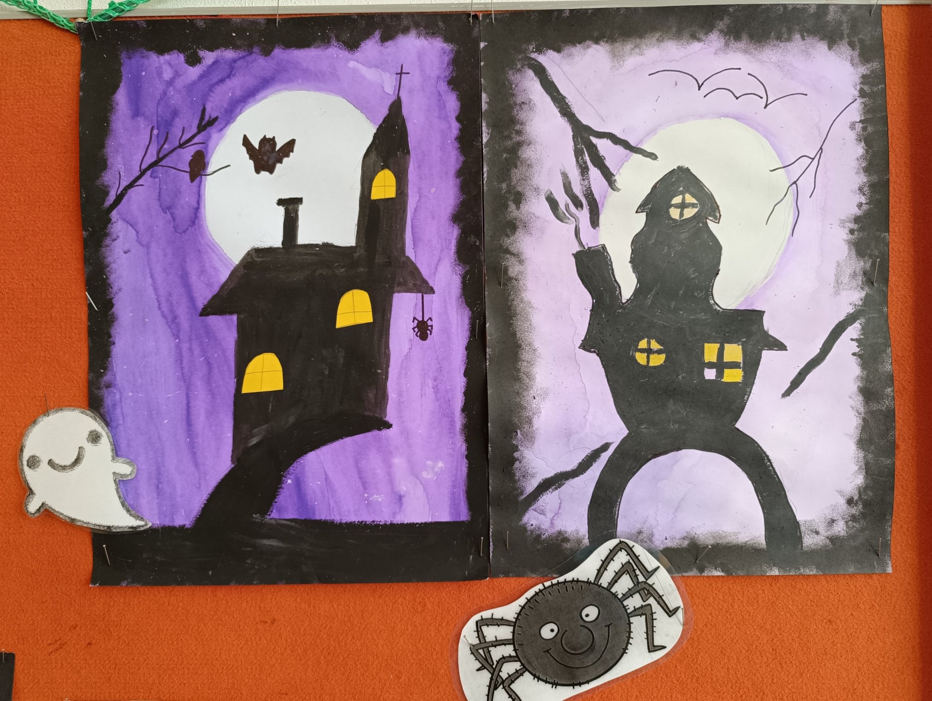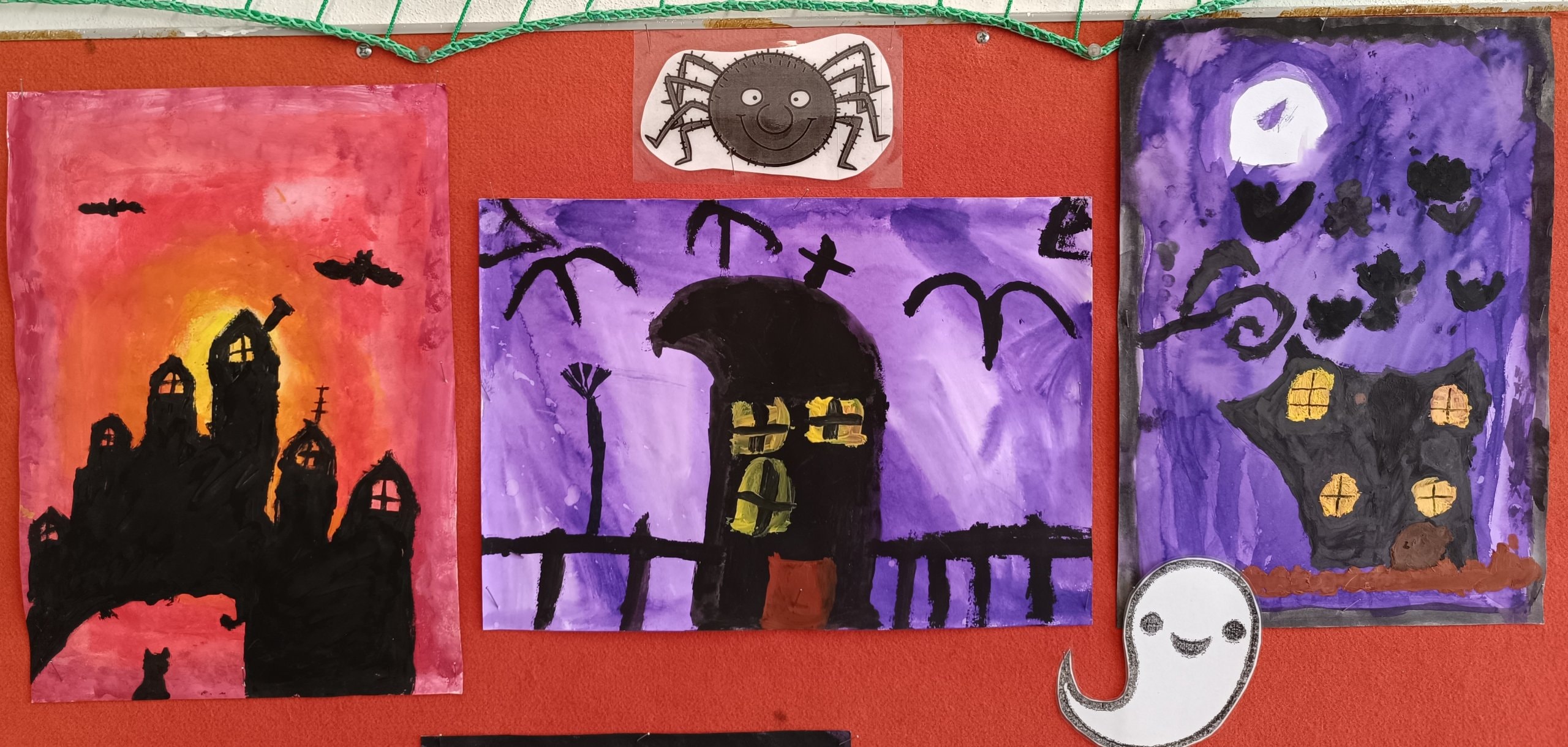 proto jsme si třídu vyzdobili malbou strašidelných obydlí duchů, čarodějnic a pavouků