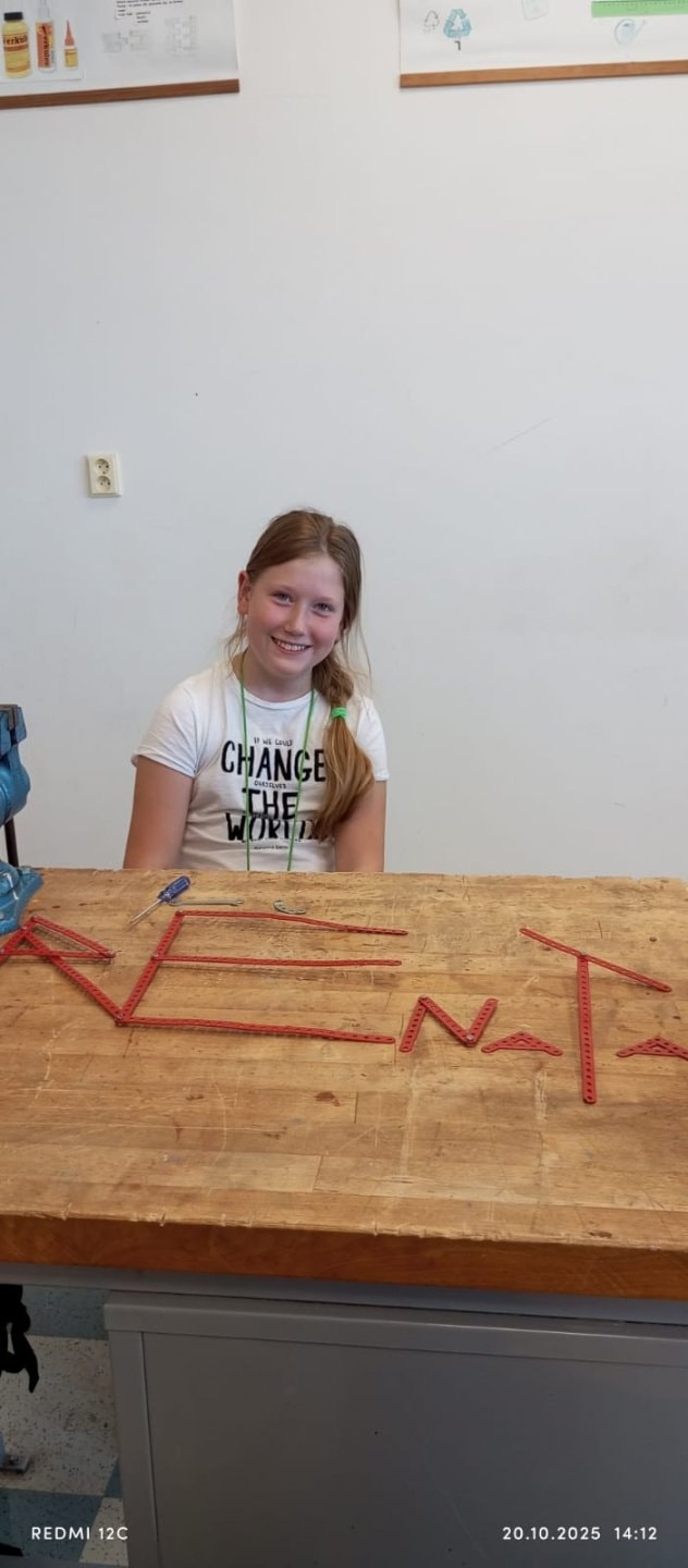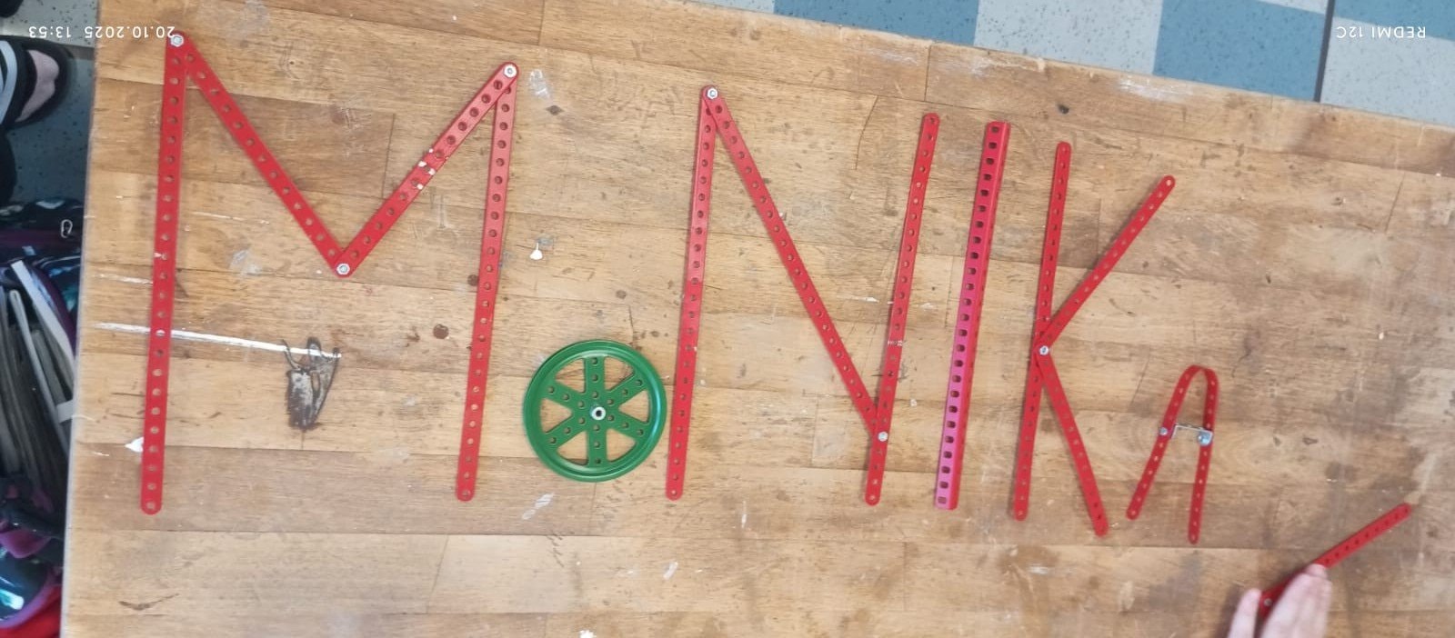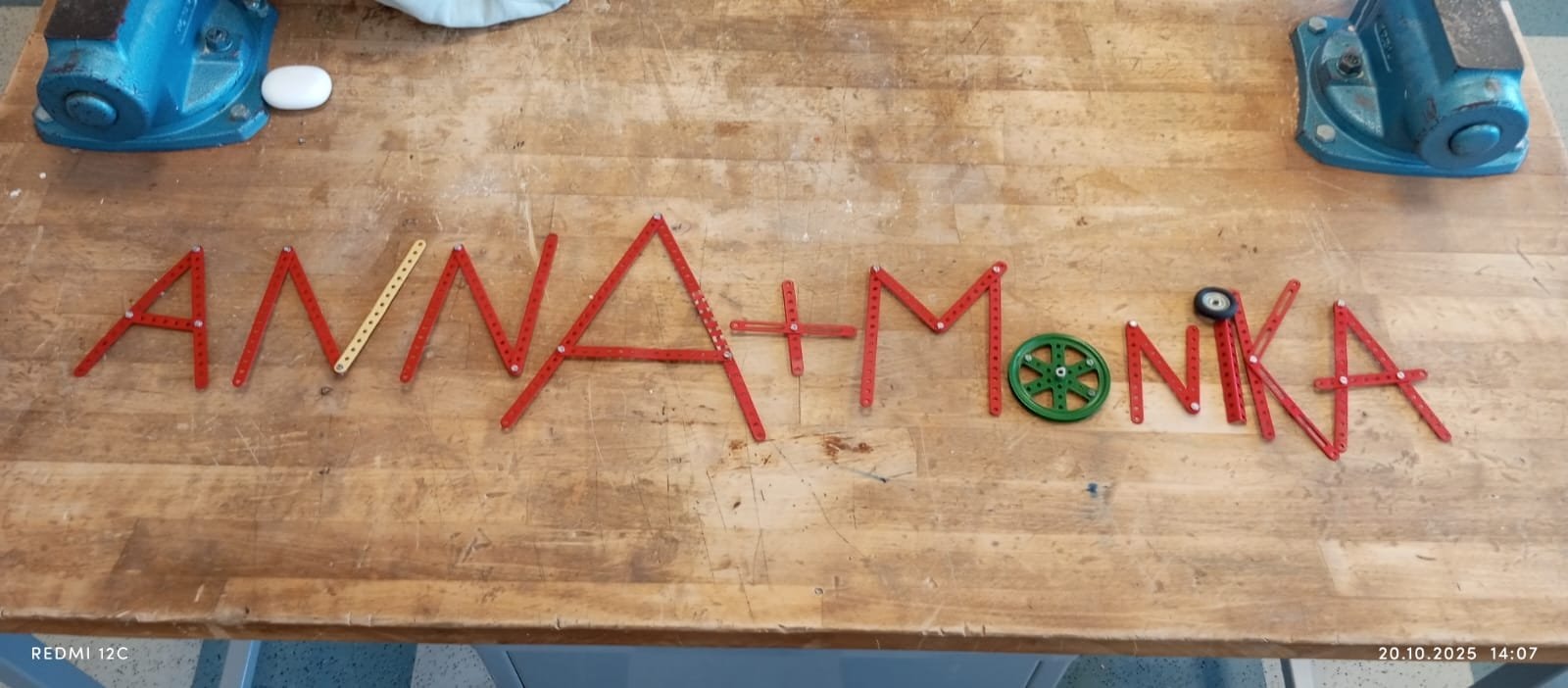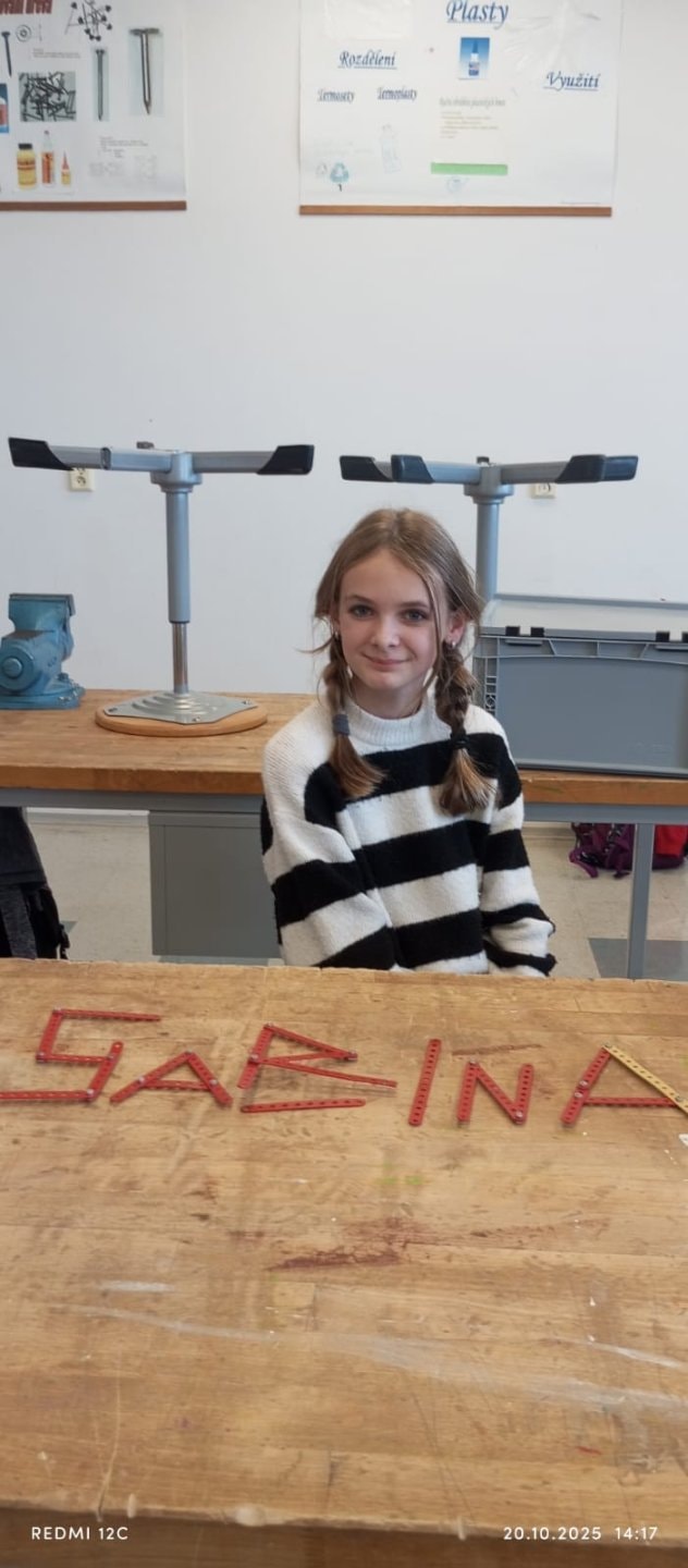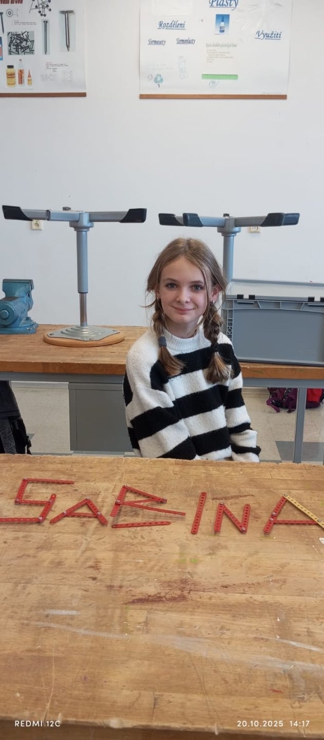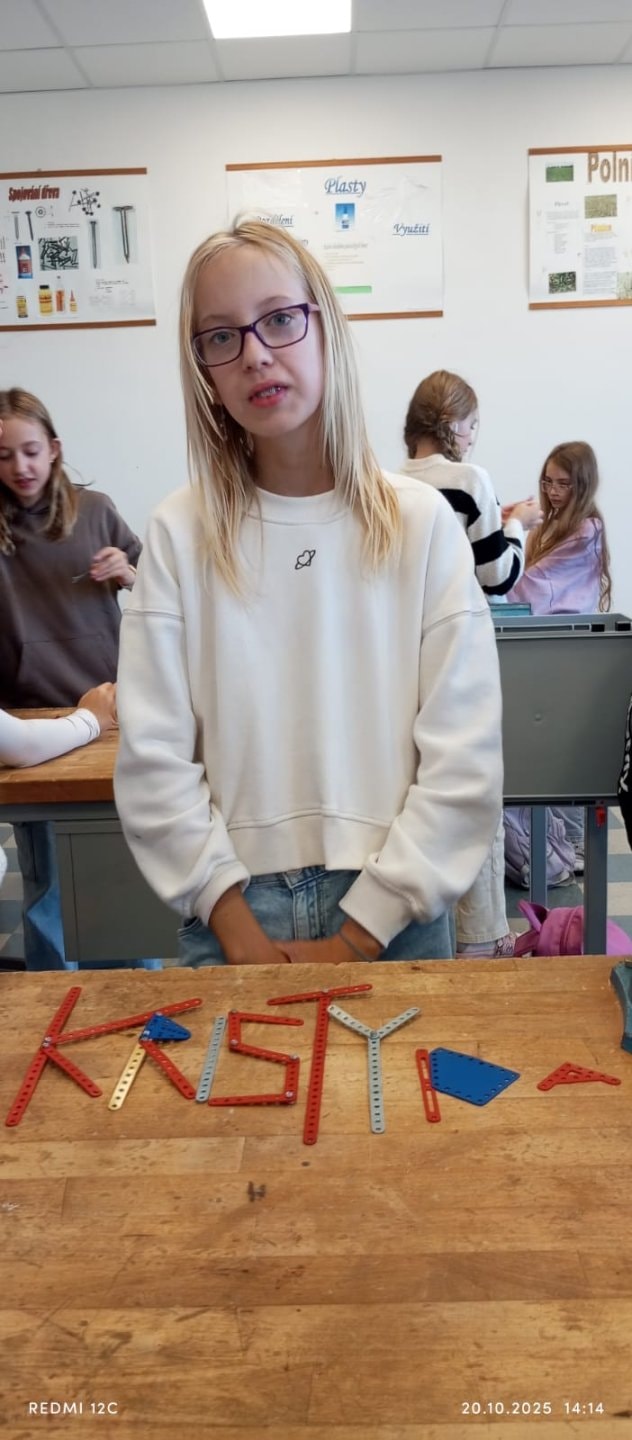 V hodině pracovní výchovy se tentokrát holky seznámily se stavebnicí Merkur. Za úkol měly sestavit z dostupných součástek své křestní jméno. Práce je bavila a příště se pustíme do složitějších výrobků.