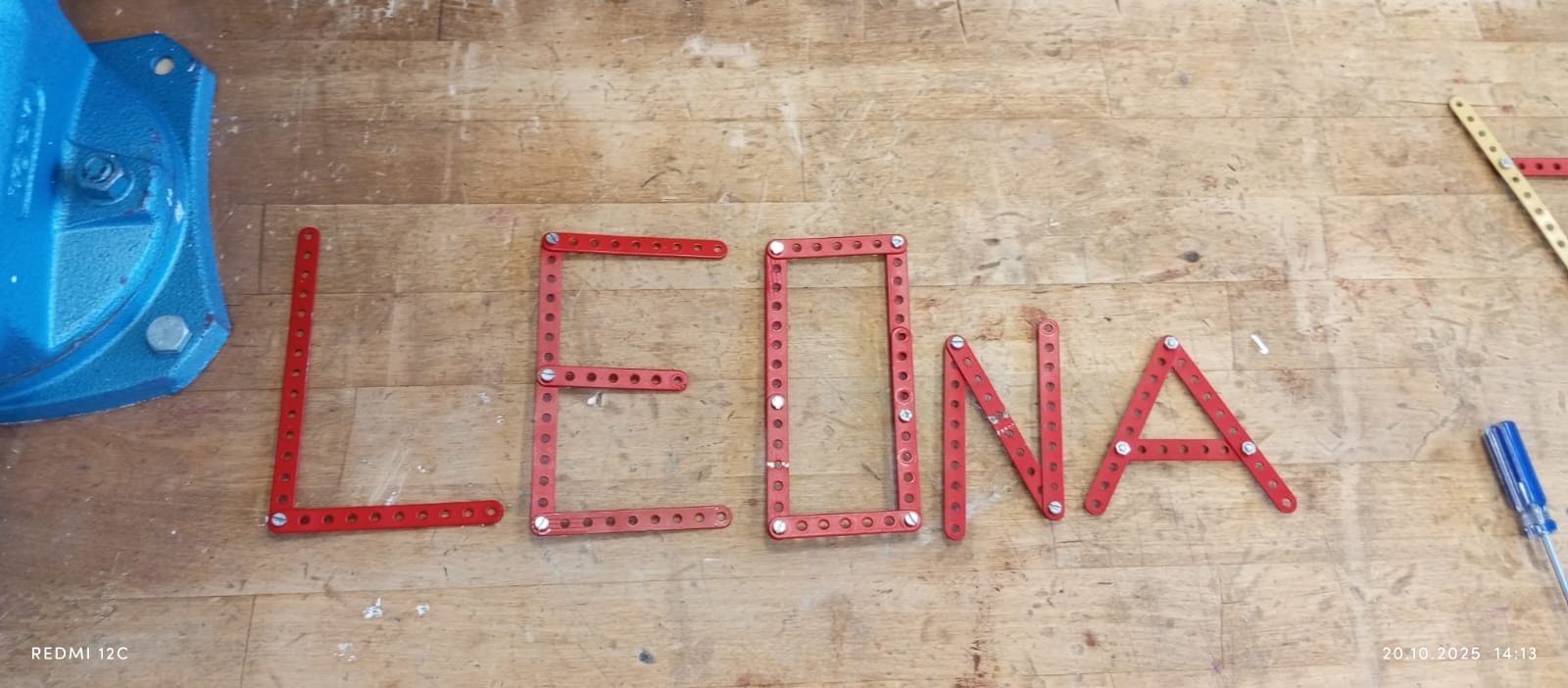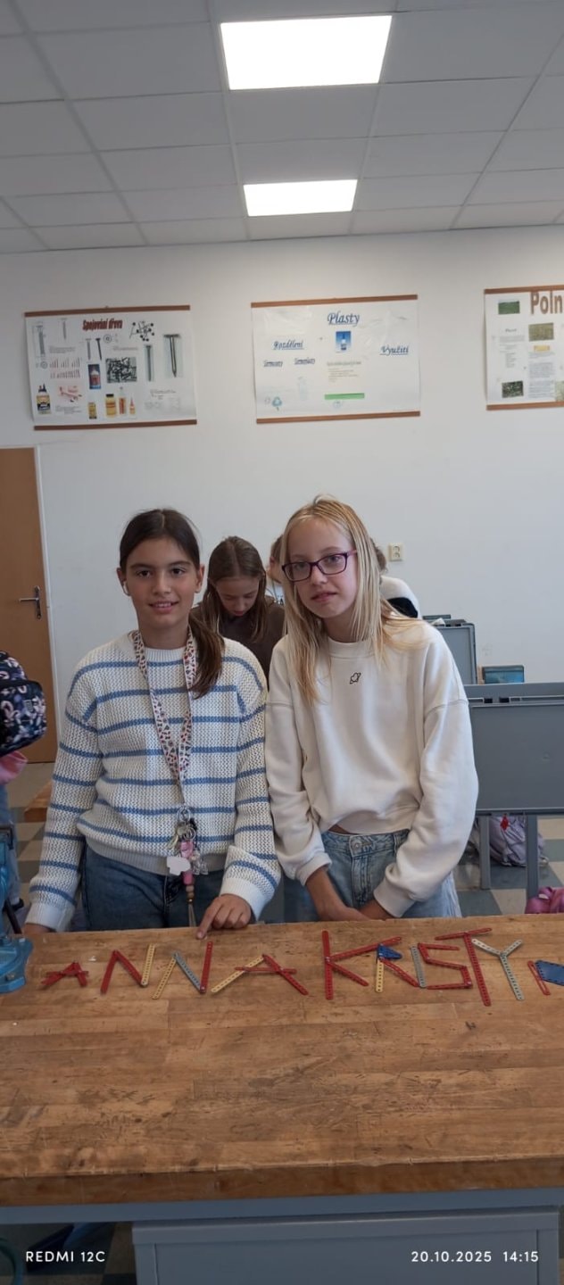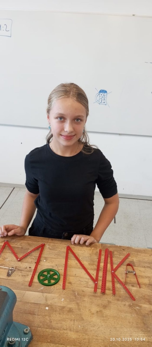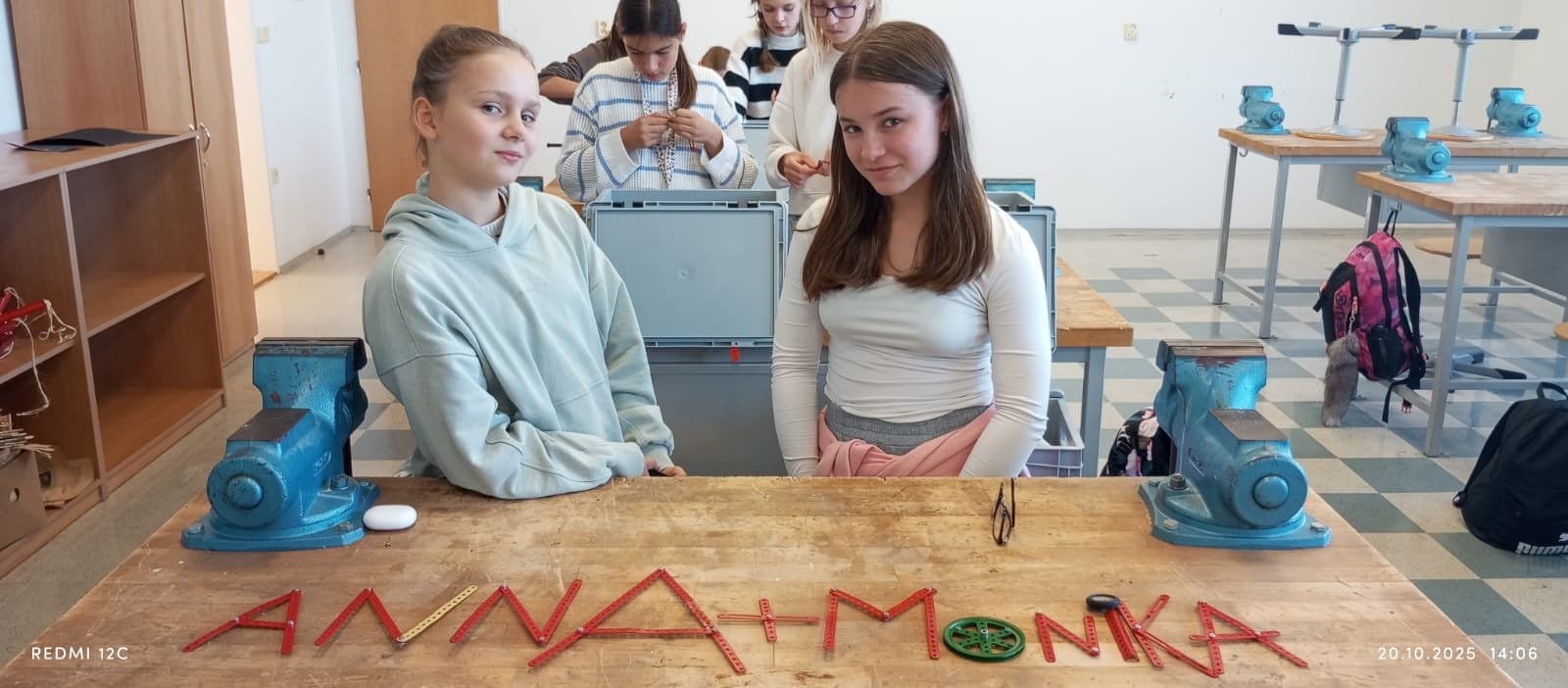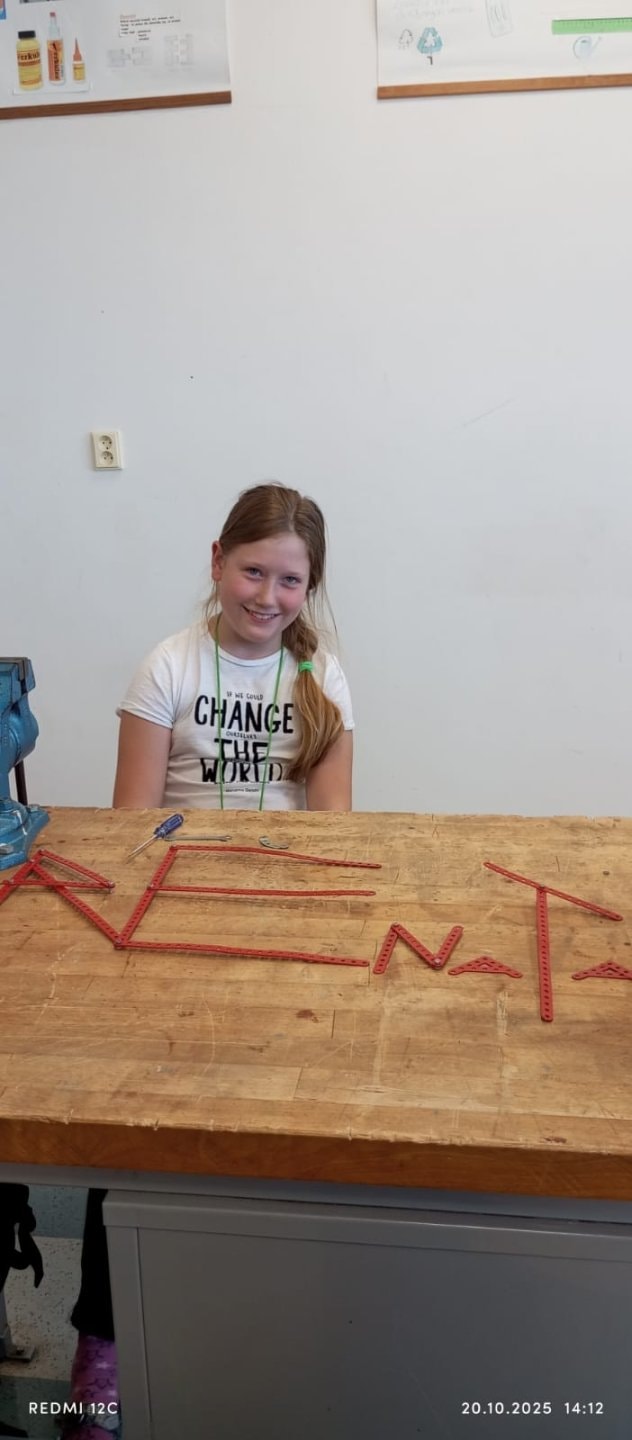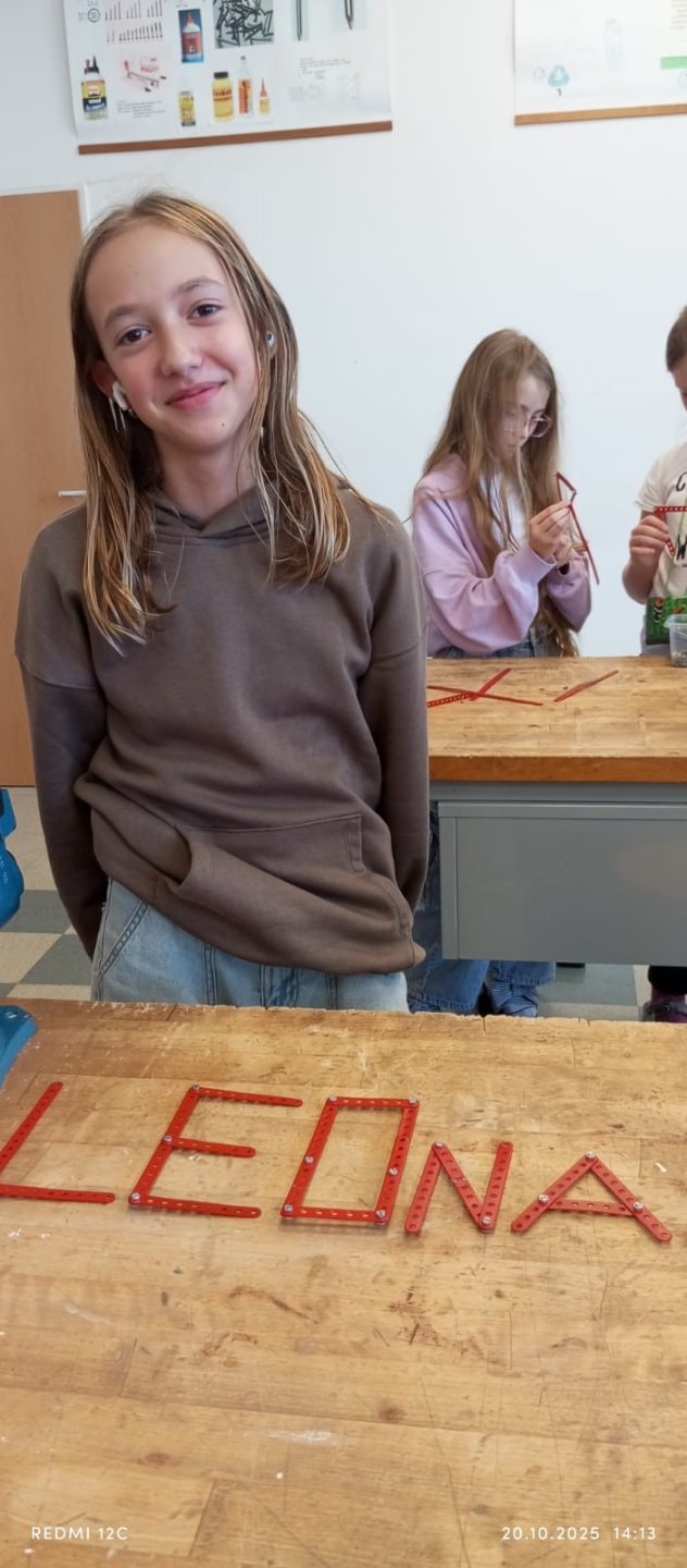 V hodině pracovní výchovy se tentokrát holky seznámily se stavebnicí Merkur. Za úkol měly sestavit z dostupných součástek své křestní jméno. Práce je bavila a příště se pustíme do složitějších výrobků.