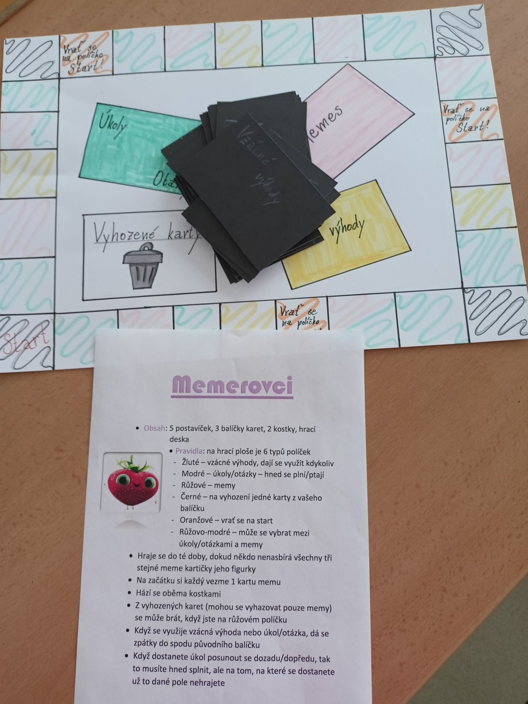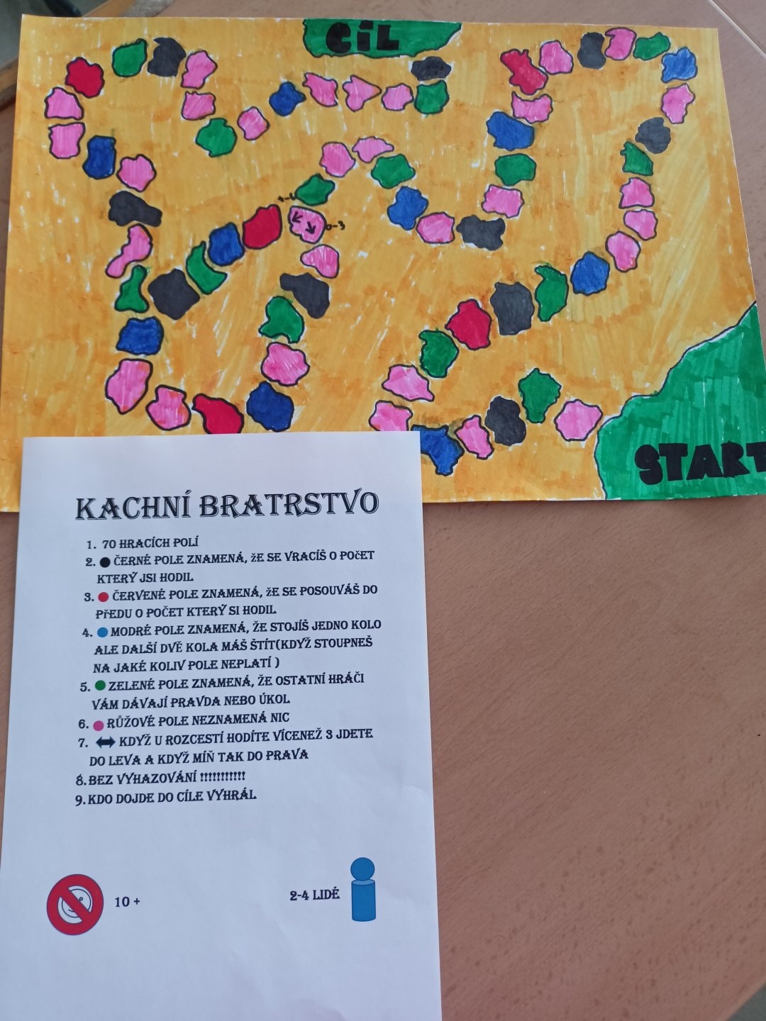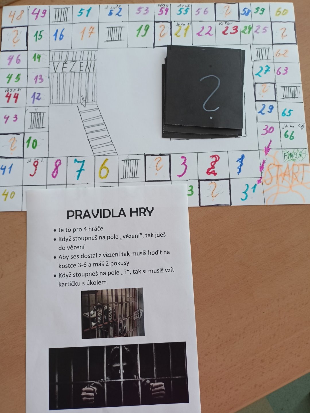Každá skupina si vytvořila figurky, dokonce i kostky, hrací pole, potřebné rekvizity, kartičky s úkoly a také na počítači skvěle zpracovaná pravidla hry.