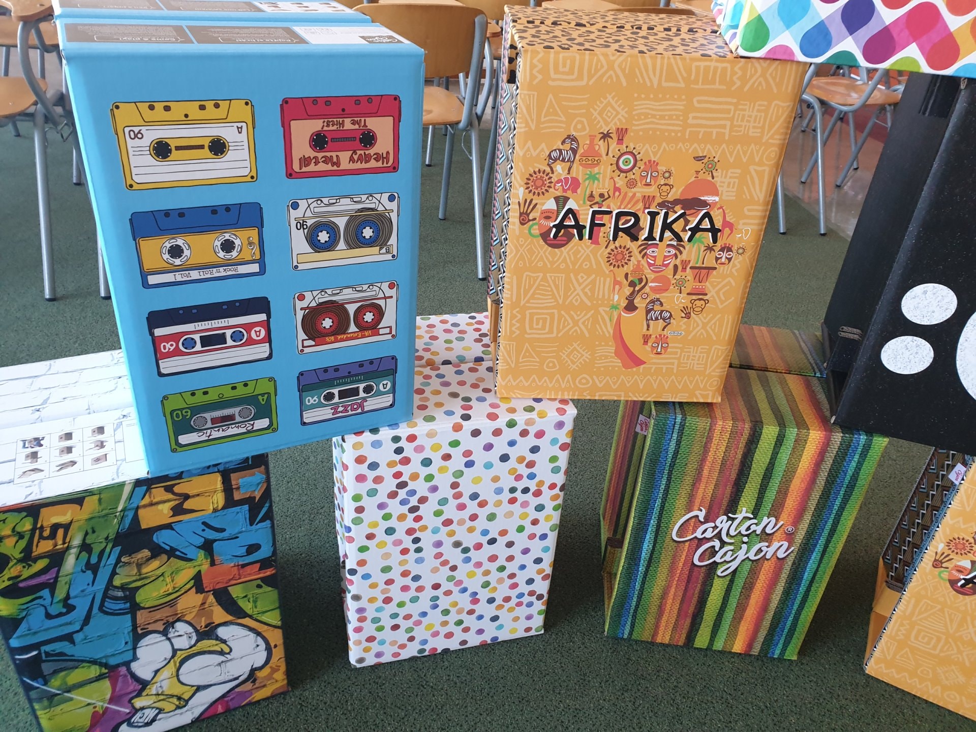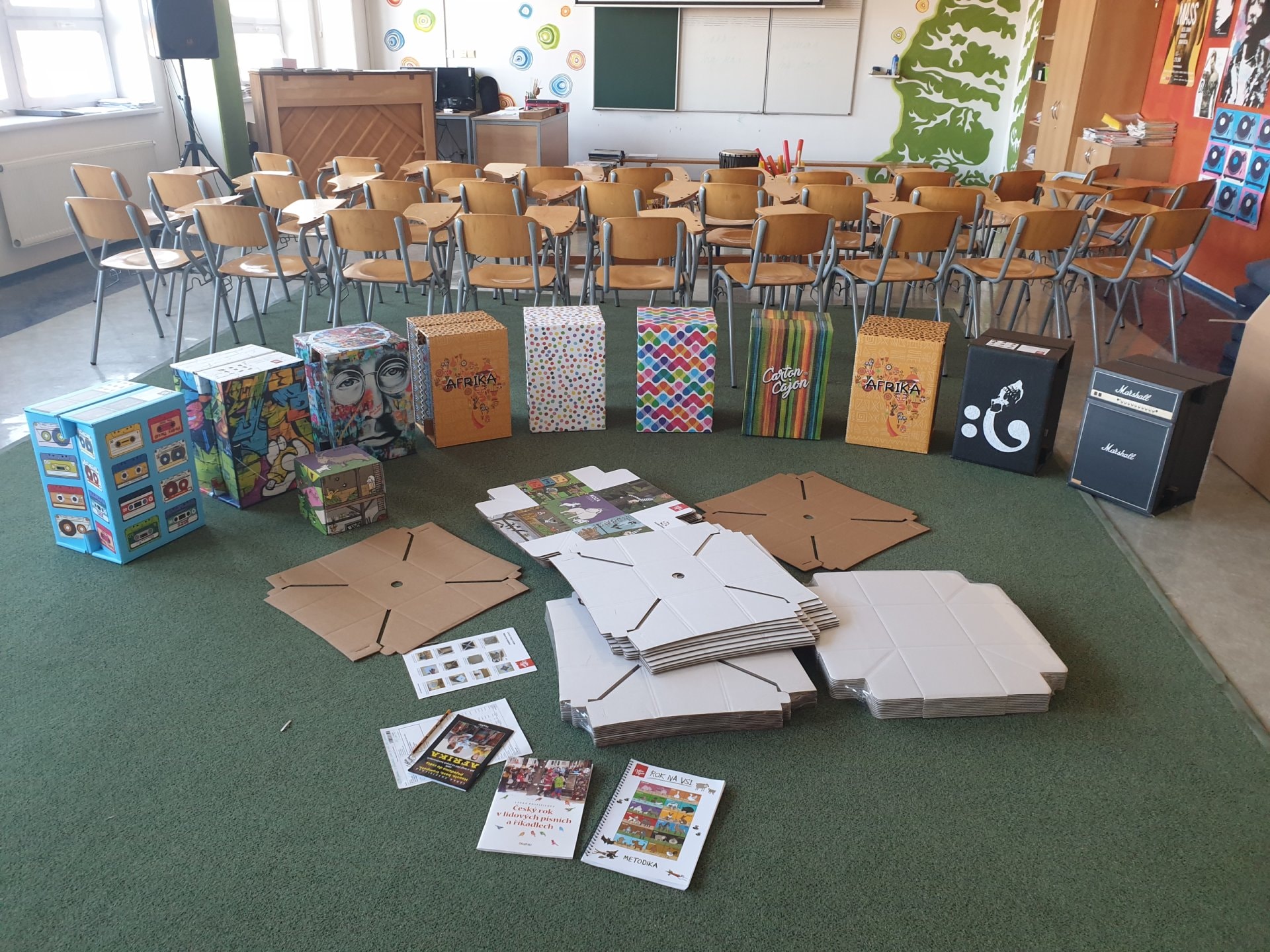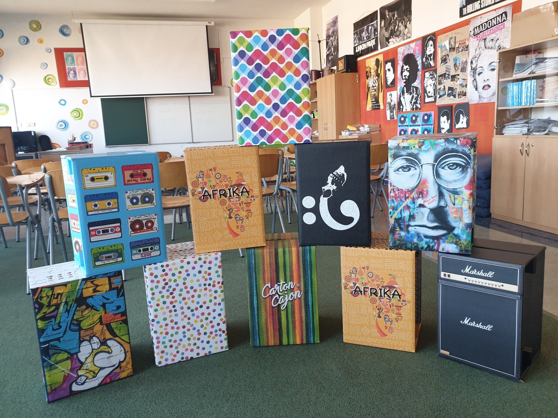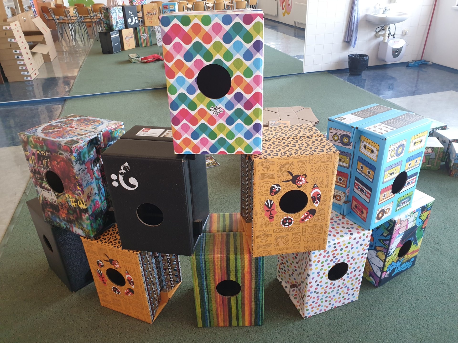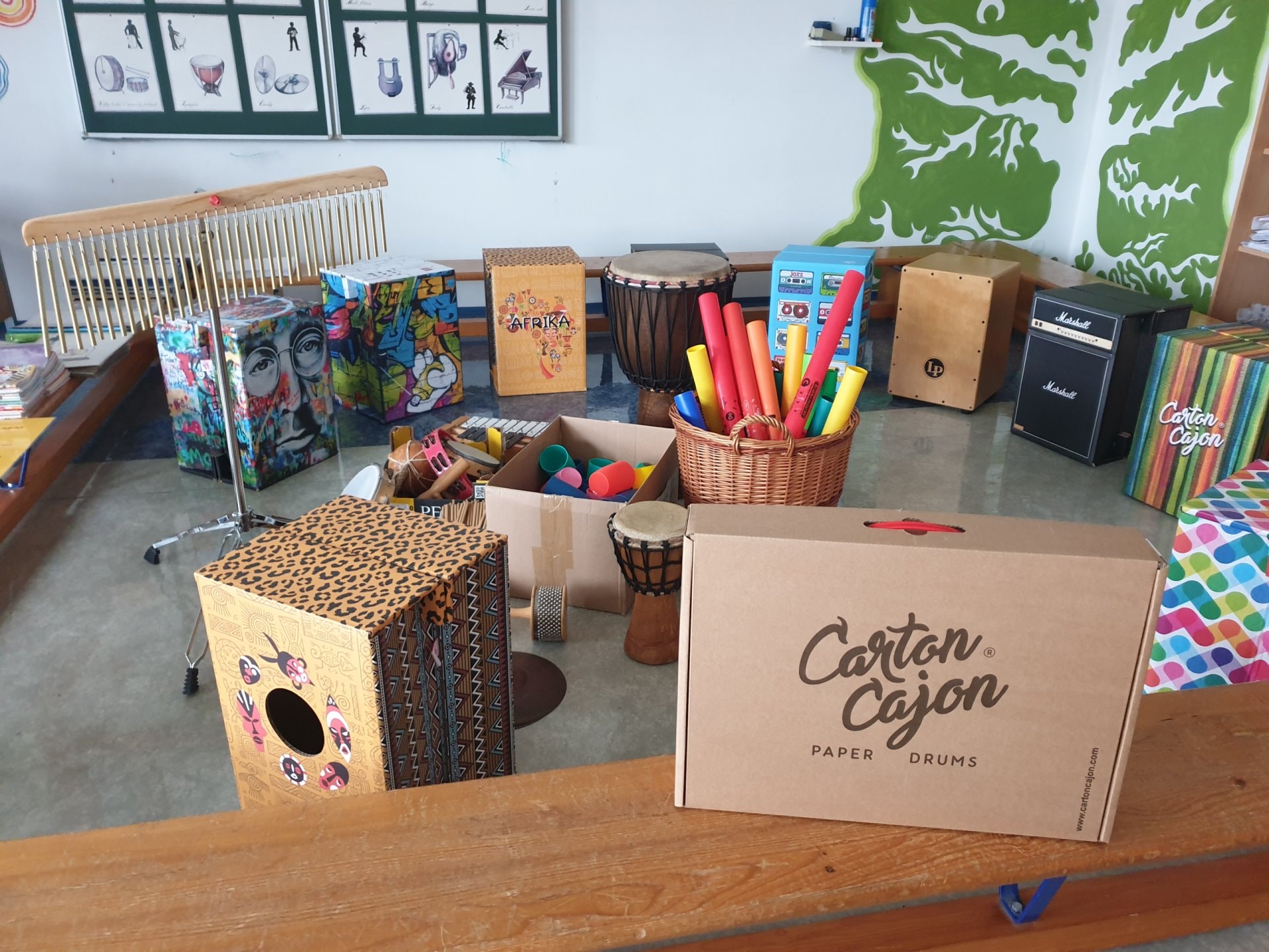 Ve skvěle vybavené učebně hudební výchovy přibyla sada 10 velkých cajonů firmy Carton Cajon pro 2. stupeň a velká sada s názvem "Rok na vsi" pro 1. stupeň. Ta se skládá z 24 malých krabicových cajonků s různými motivy zvířat a přírody. Ty lze použít nejen v hudební výchově, ale napříč spektrem všech předmětů, prvoukou počínaje a češtinou a matematikou konče. "Rok na vsi" obsahuje také 3 velké sady výukových karet s písmeny, číslicemi, zvířátky a dalšími symboly, kterými lze bubínky obměňovat a pracovat s nimi v rámci různých témat. Součástí je i 24 párů gumových paliček a metodika se zpěvníčkem.