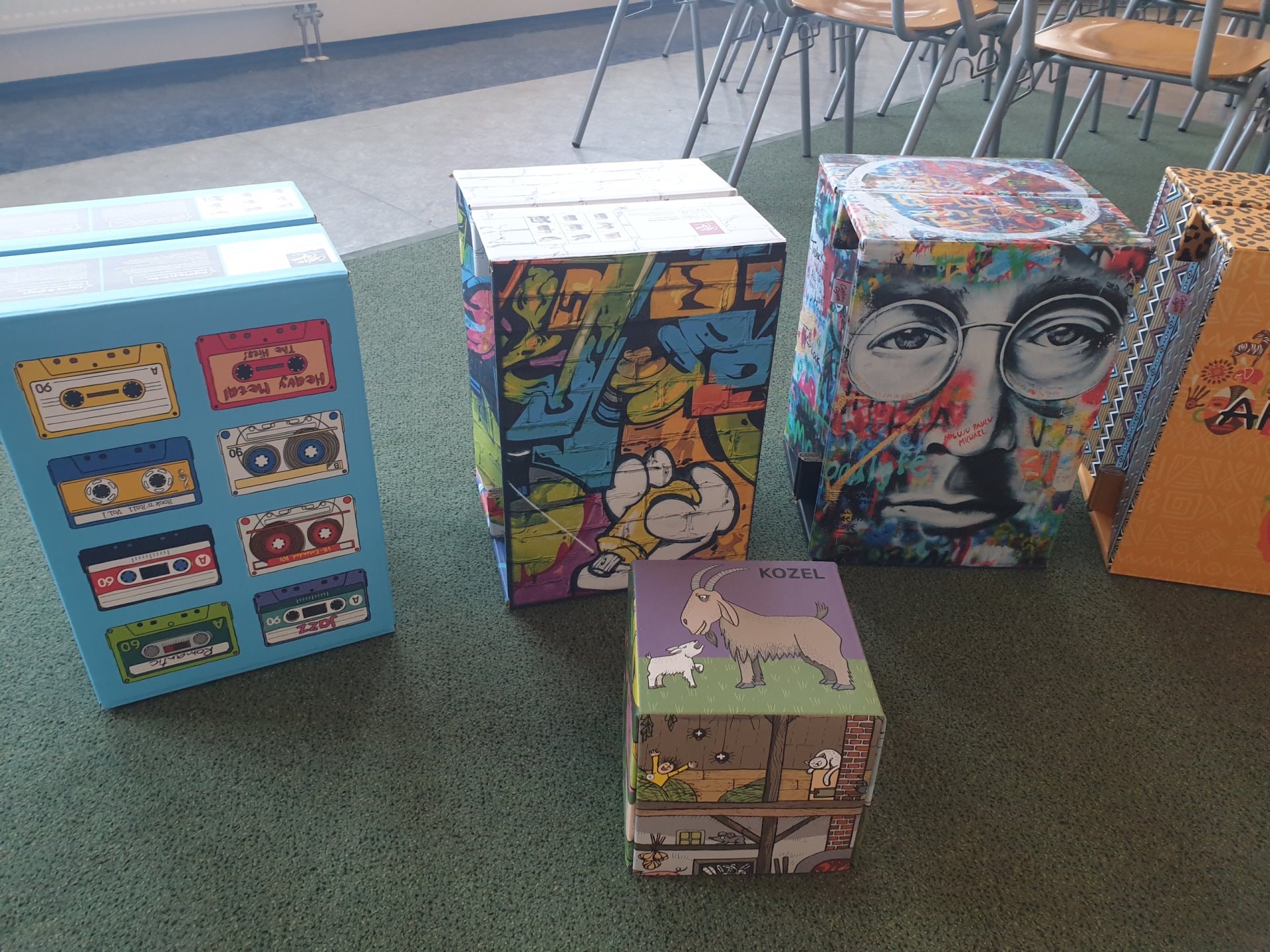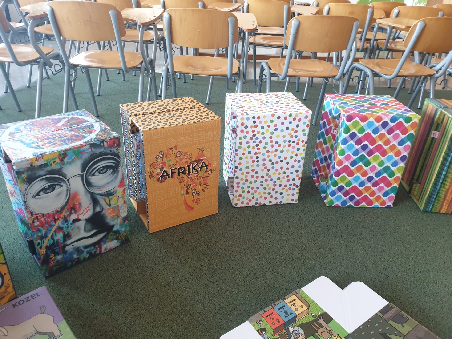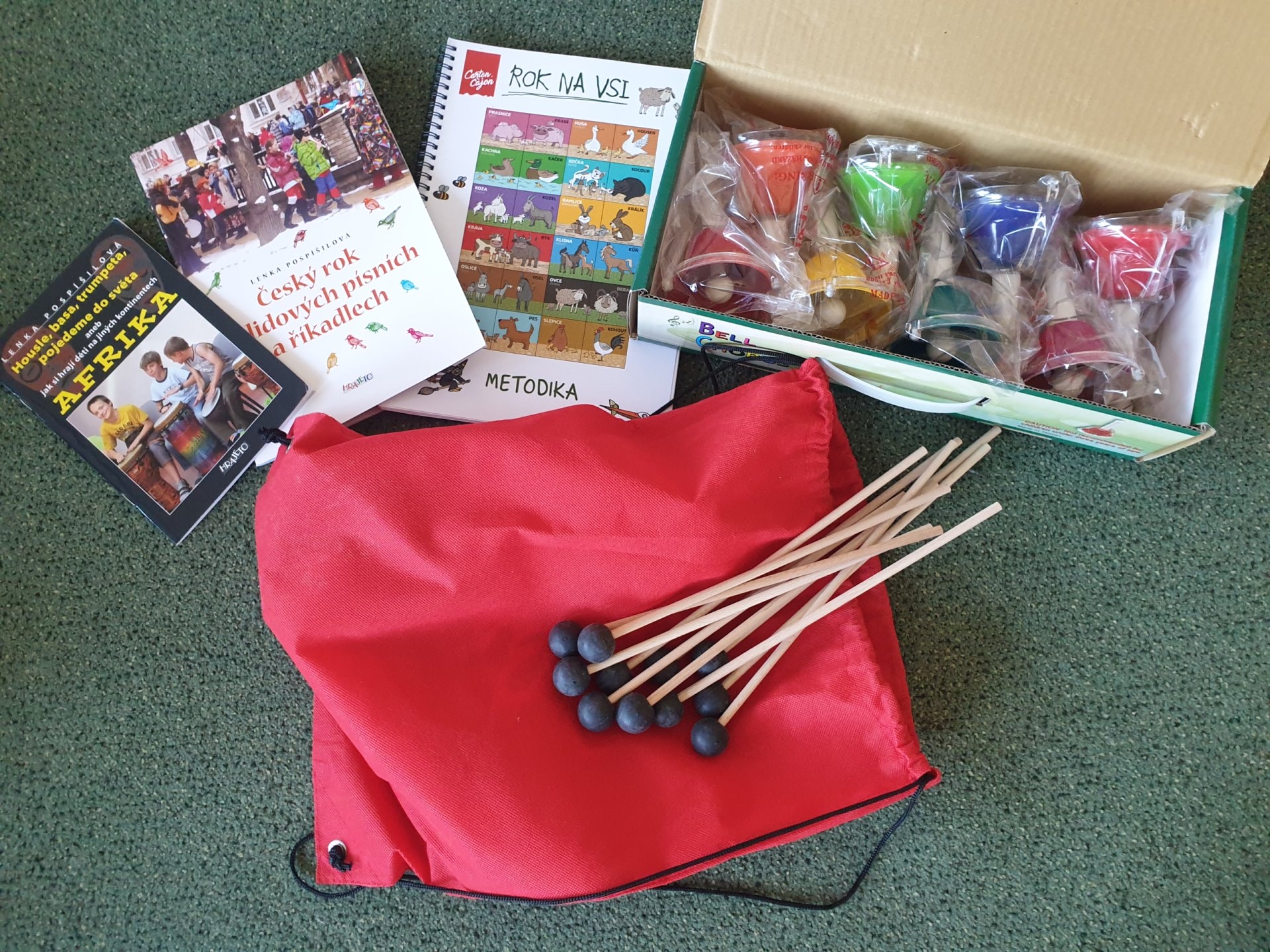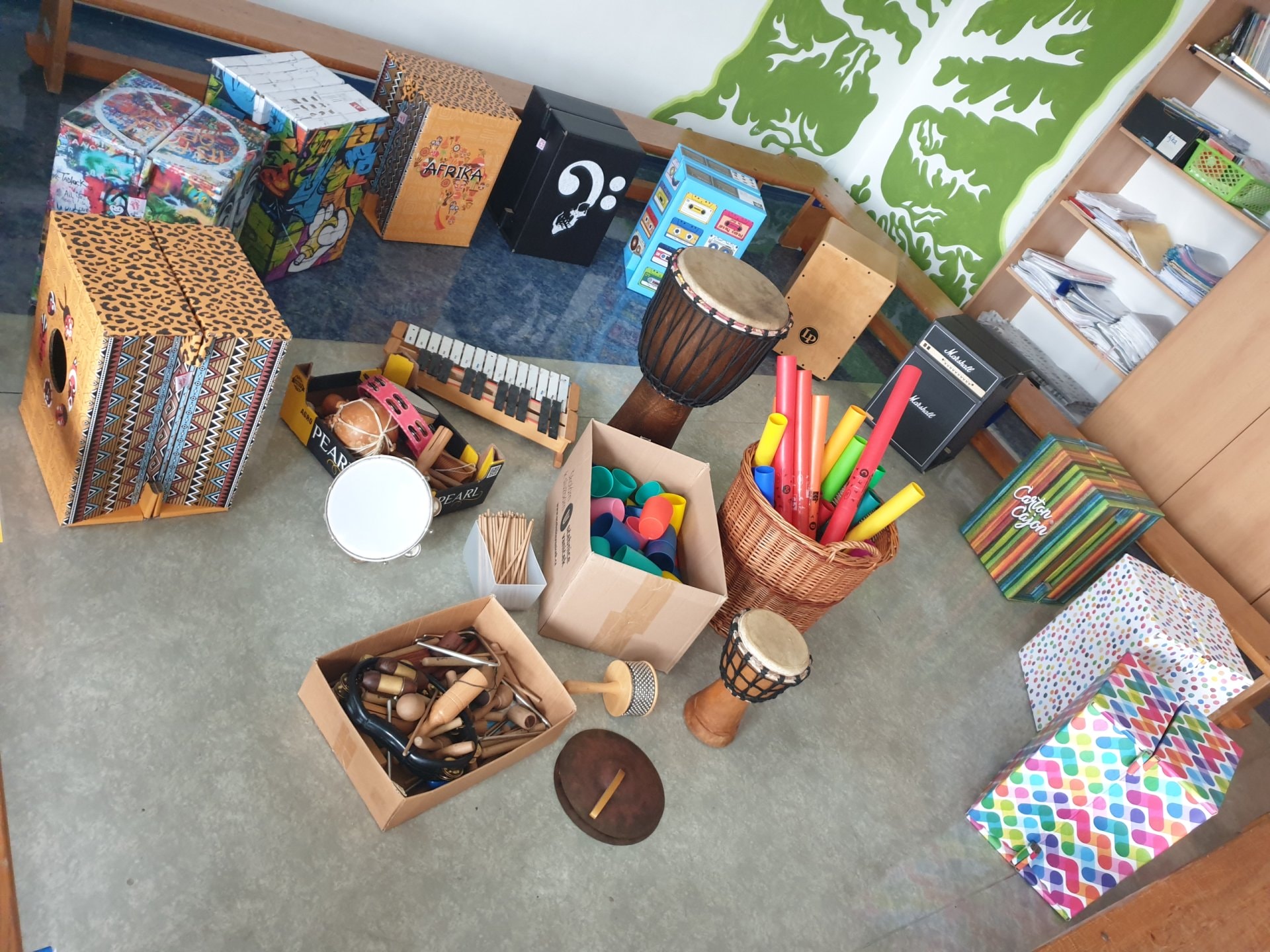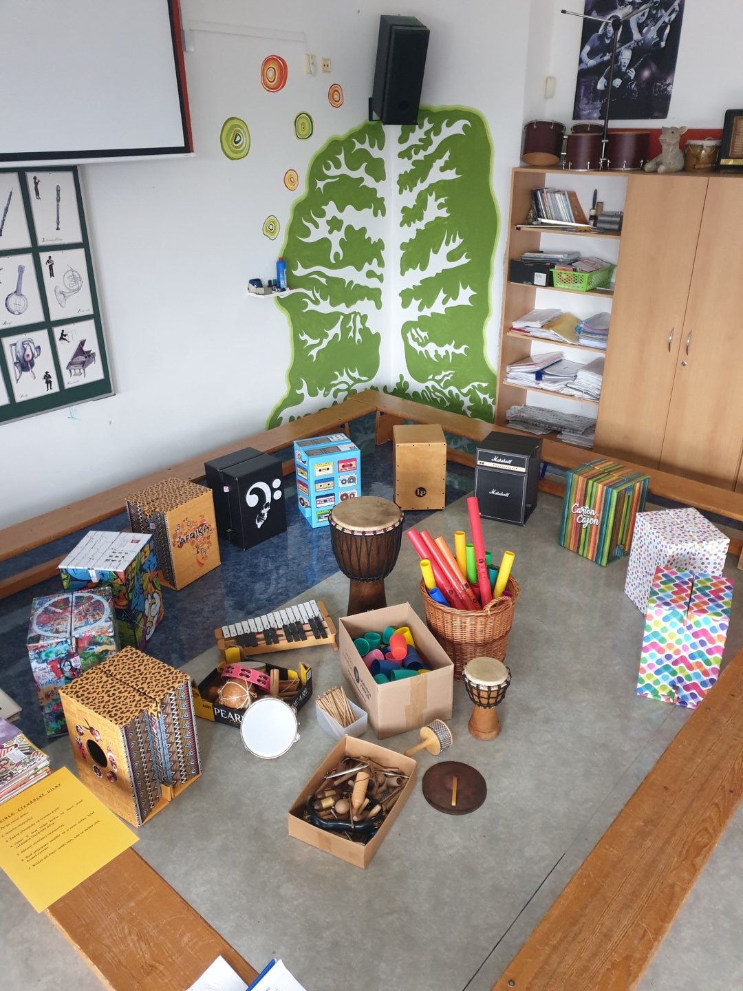 Ve skvěle vybavené učebně hudební výchovy přibyla sada 10 velkých cajonů firmy Carton Cajon pro 2. stupeň a velká sada s názvem "Rok na vsi" pro 1. stupeň. Ta se skládá z 24 malých krabicových cajonků s různými motivy zvířat a přírody. Ty lze použít nejen v hudební výchově, ale napříč spektrem všech předmětů, prvoukou počínaje a češtinou a matematikou konče. "Rok na vsi" obsahuje také 3 velké sady výukových karet s písmeny, číslicemi, zvířátky a dalšími symboly, kterými lze bubínky obměňovat a pracovat s nimi v rámci různých témat. Součástí je i 24 párů gumových paliček a metodika se zpěvníčkem.